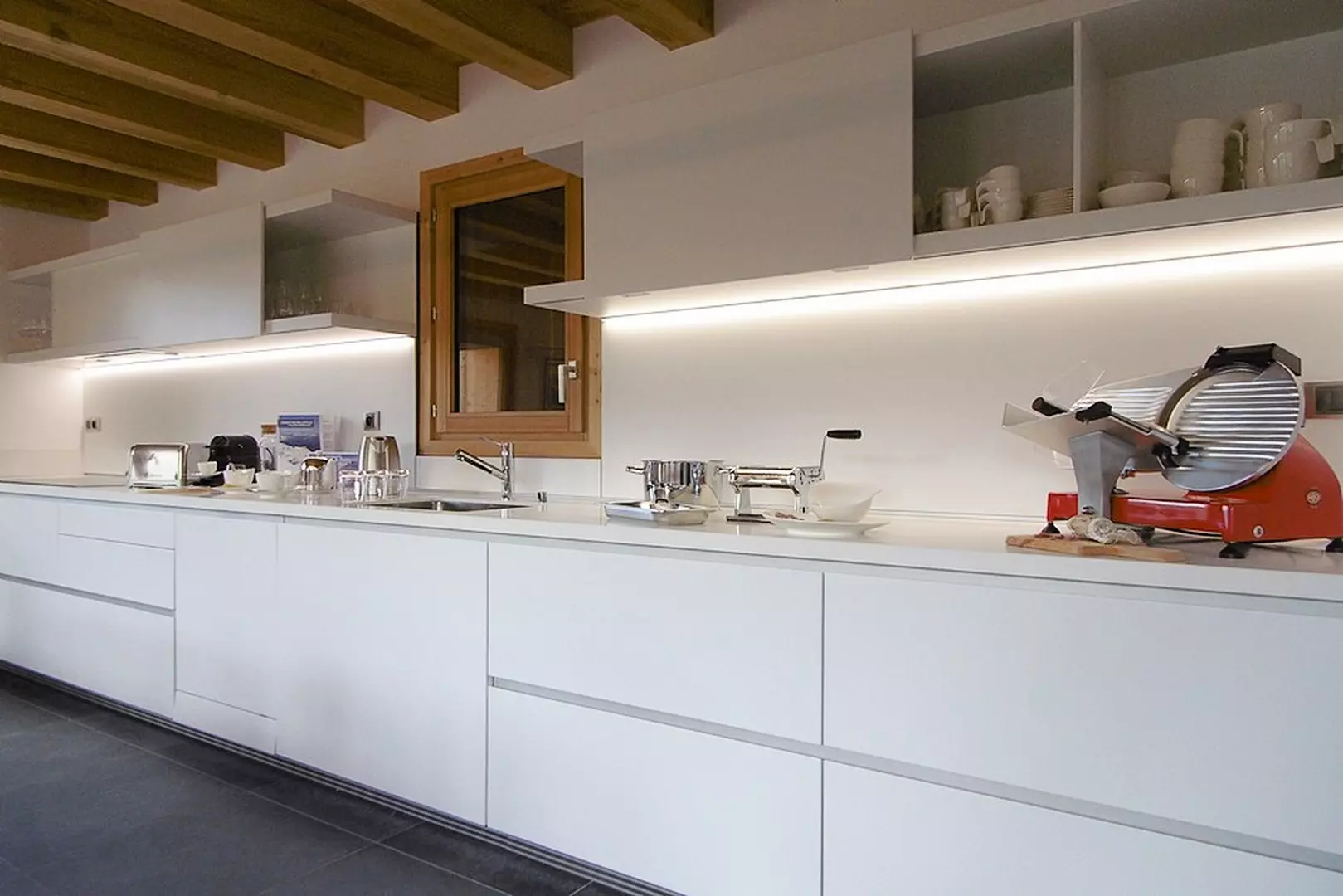 Cuisine équipée avec grand réfrigérateur, plaques induction, lave-vaisselle, four, four micro-ondes, bouilloire, grille-pain et cafetière percolateur à grains, trancheuse.