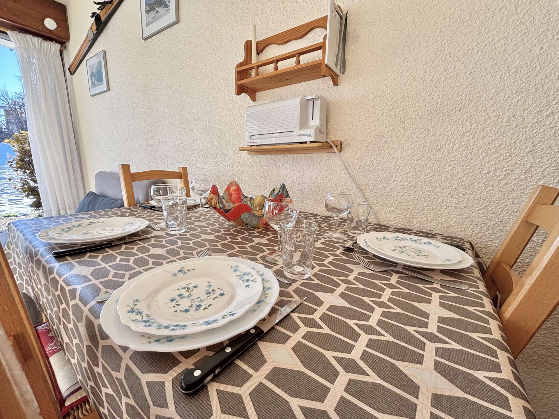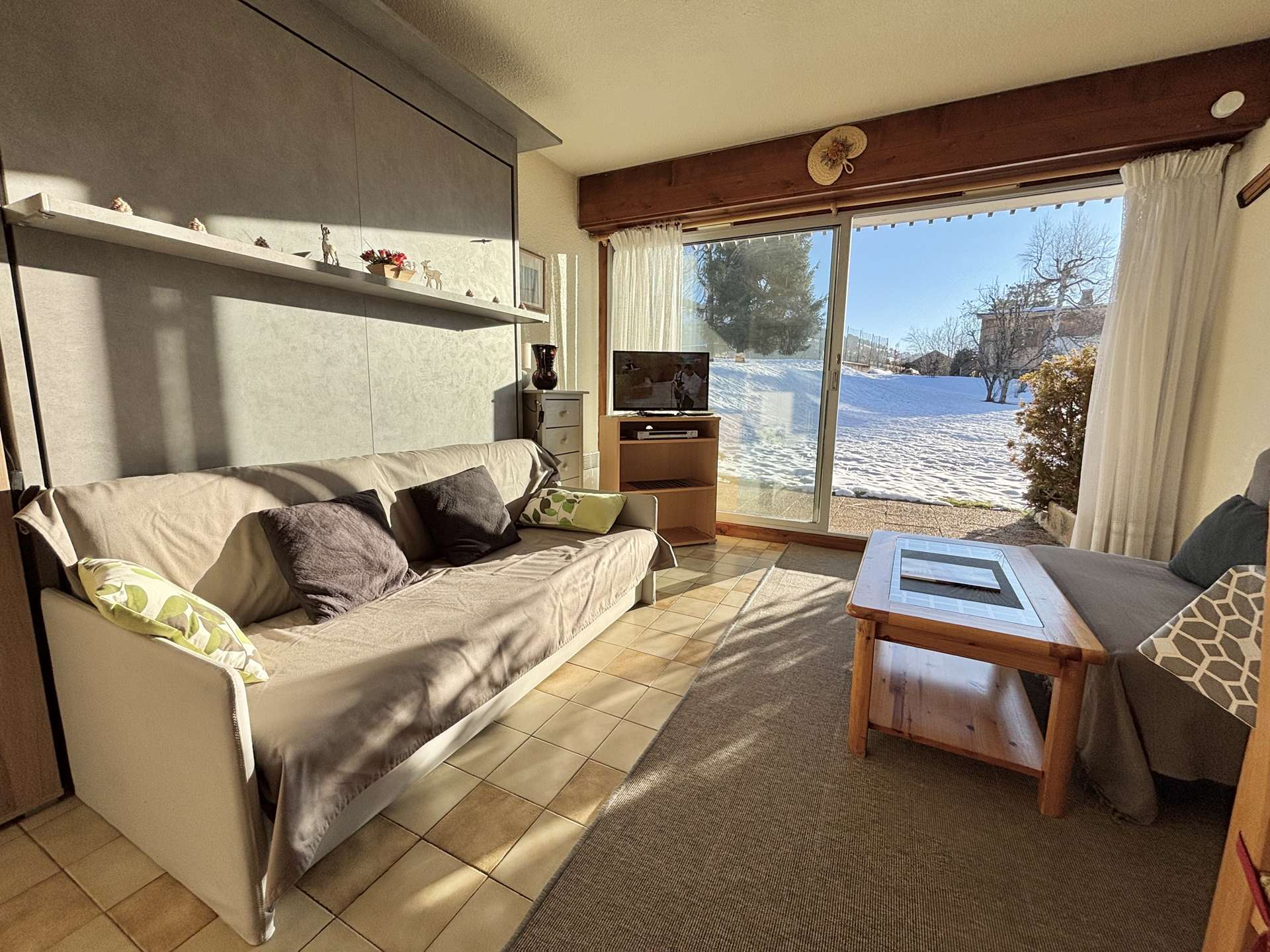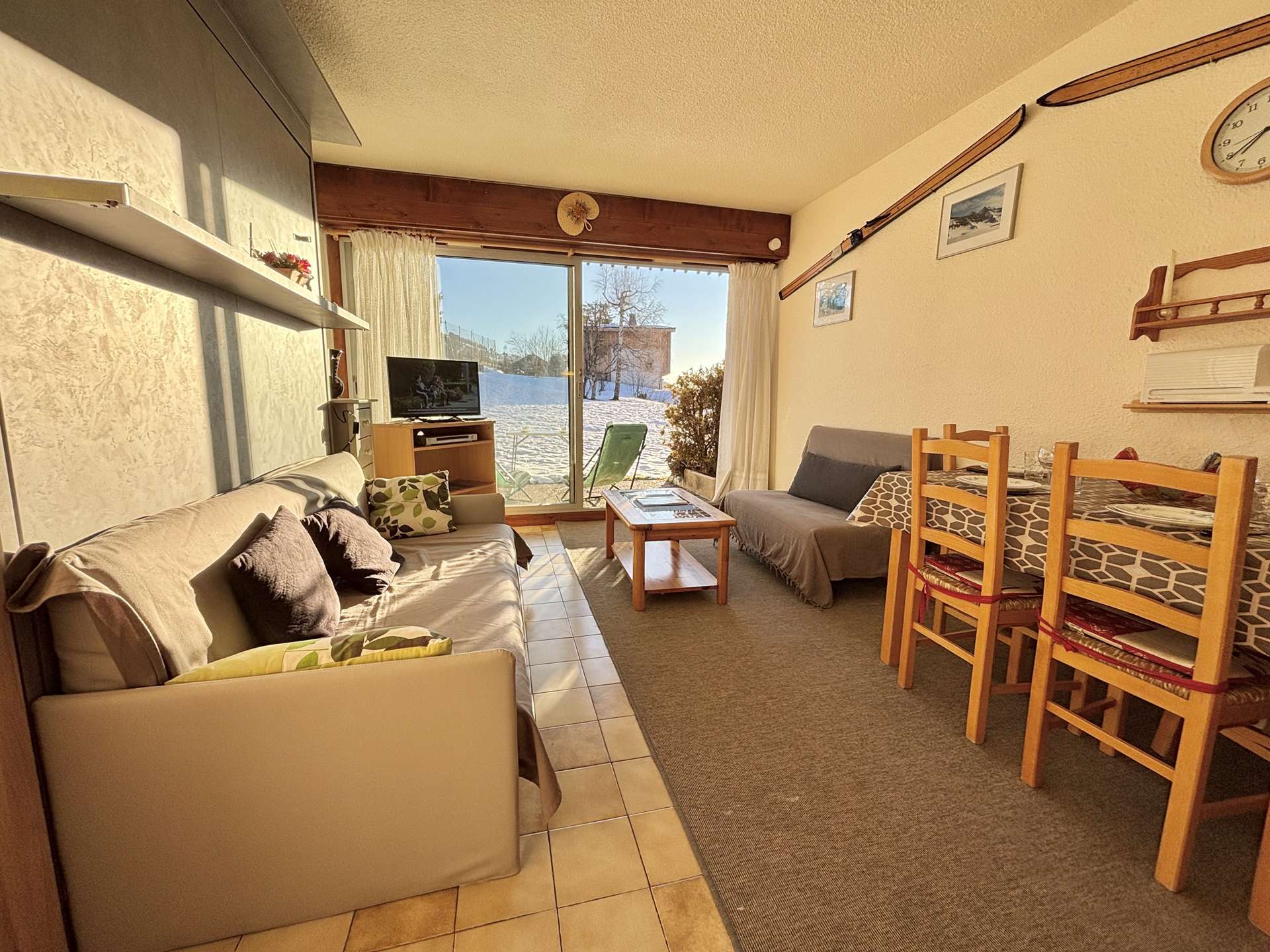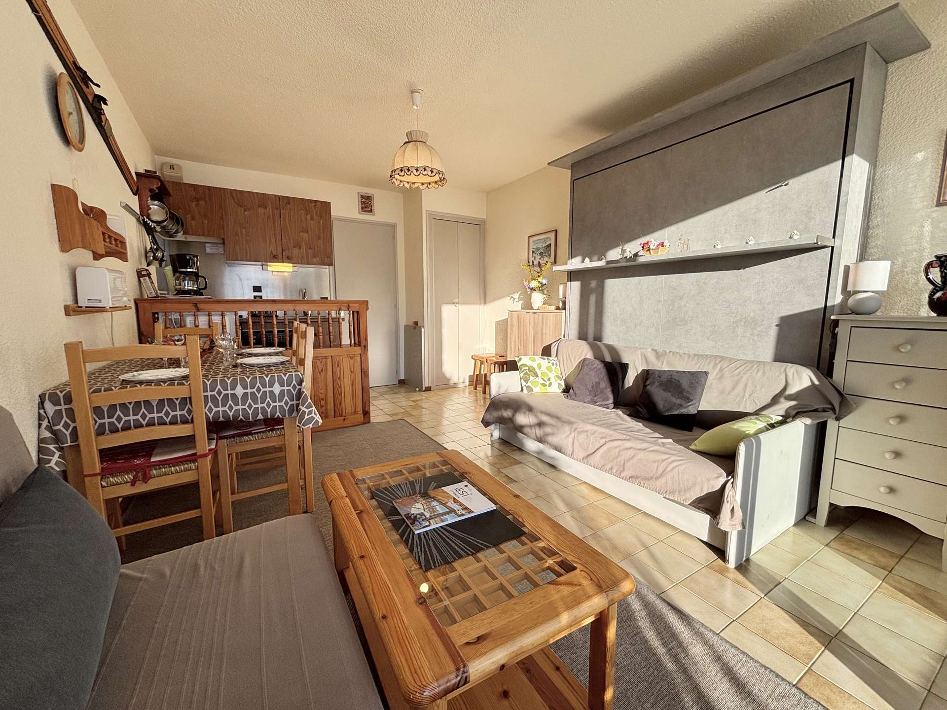 Ce studio de 25 m² situé au rez-de-chaussée est composé d'une alcôve dans l'entrée avec deux lits superposés (NB : Le lit supérieur d'un lit superposé est interdit aux - de 6 ans), d'un coin cuisine ouvert sur le séjour avec un lit double rabattable, d'une salle de bains avec WC indépendants.