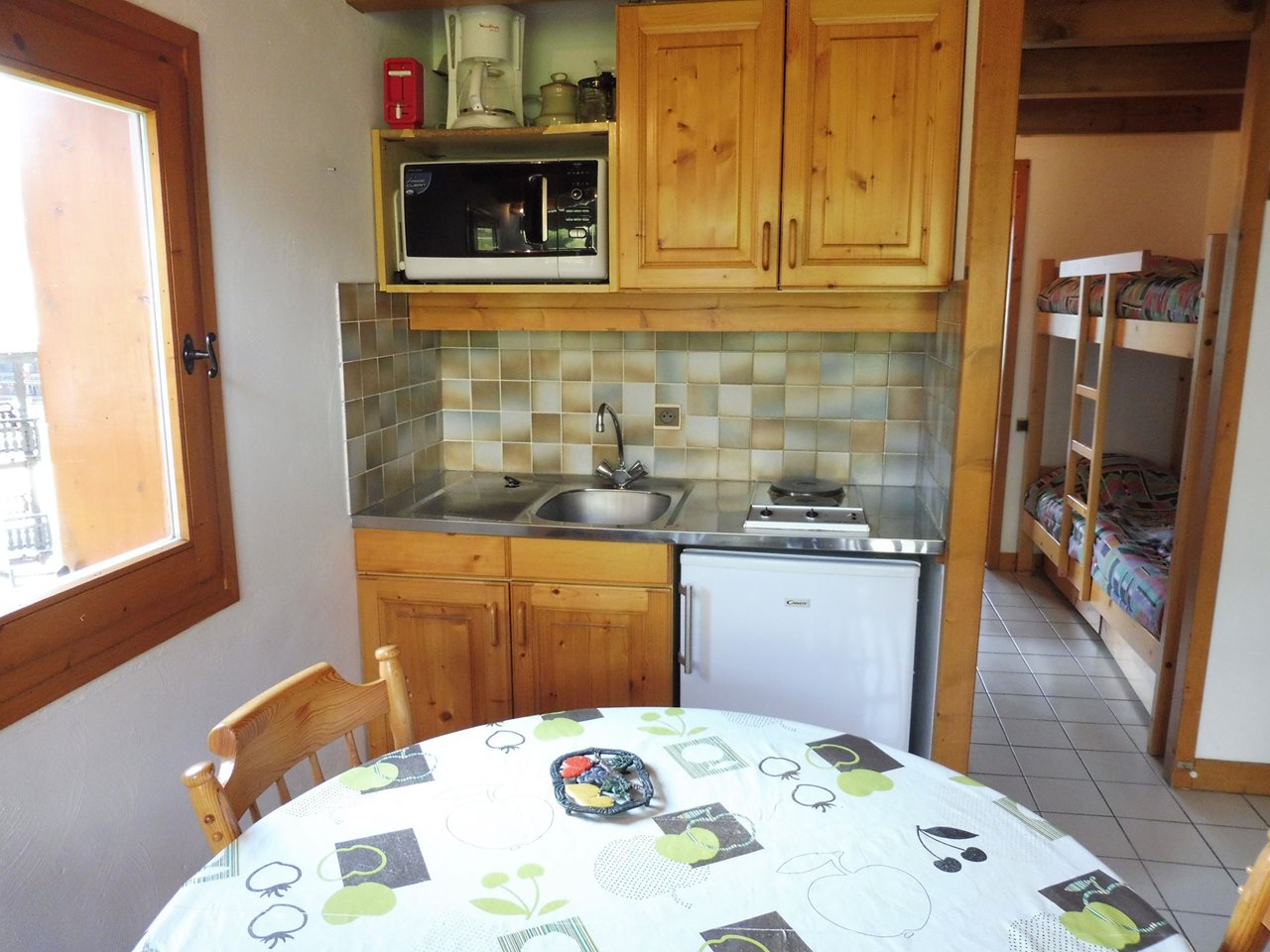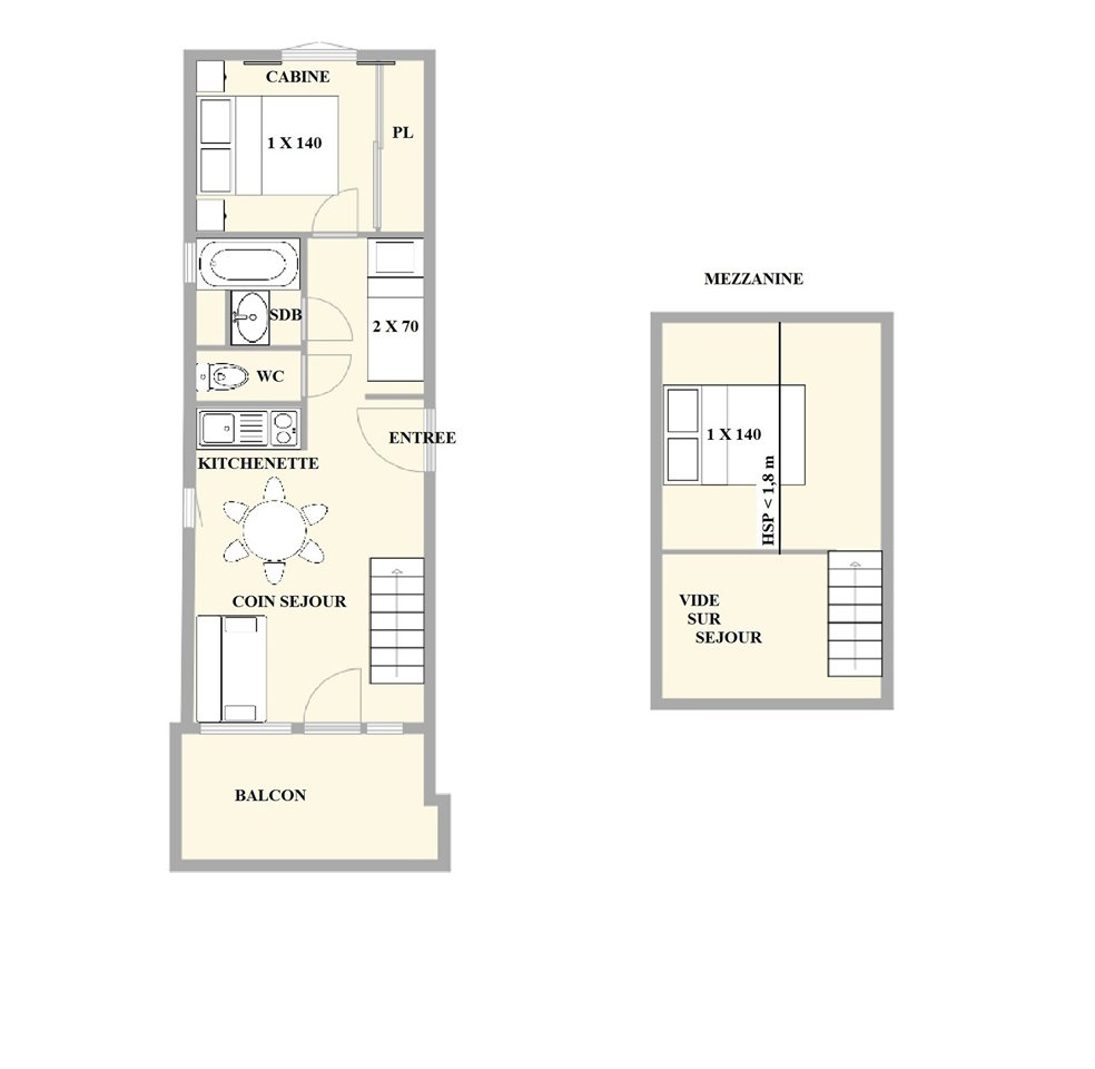 Cet appartement d'une superficie de 32 m² situé au premier étage sans ascenseur comprend un séjour, une cuisine ouverte sur le séjour, une chambre avec un lit double, une alcôve avec 2 lits superposés (NB : le lit supérieur d'un lit superposé est interdit aux - de 6 ans), une salle de bains, des WC indépendants et une mezzanine avec un lit double.