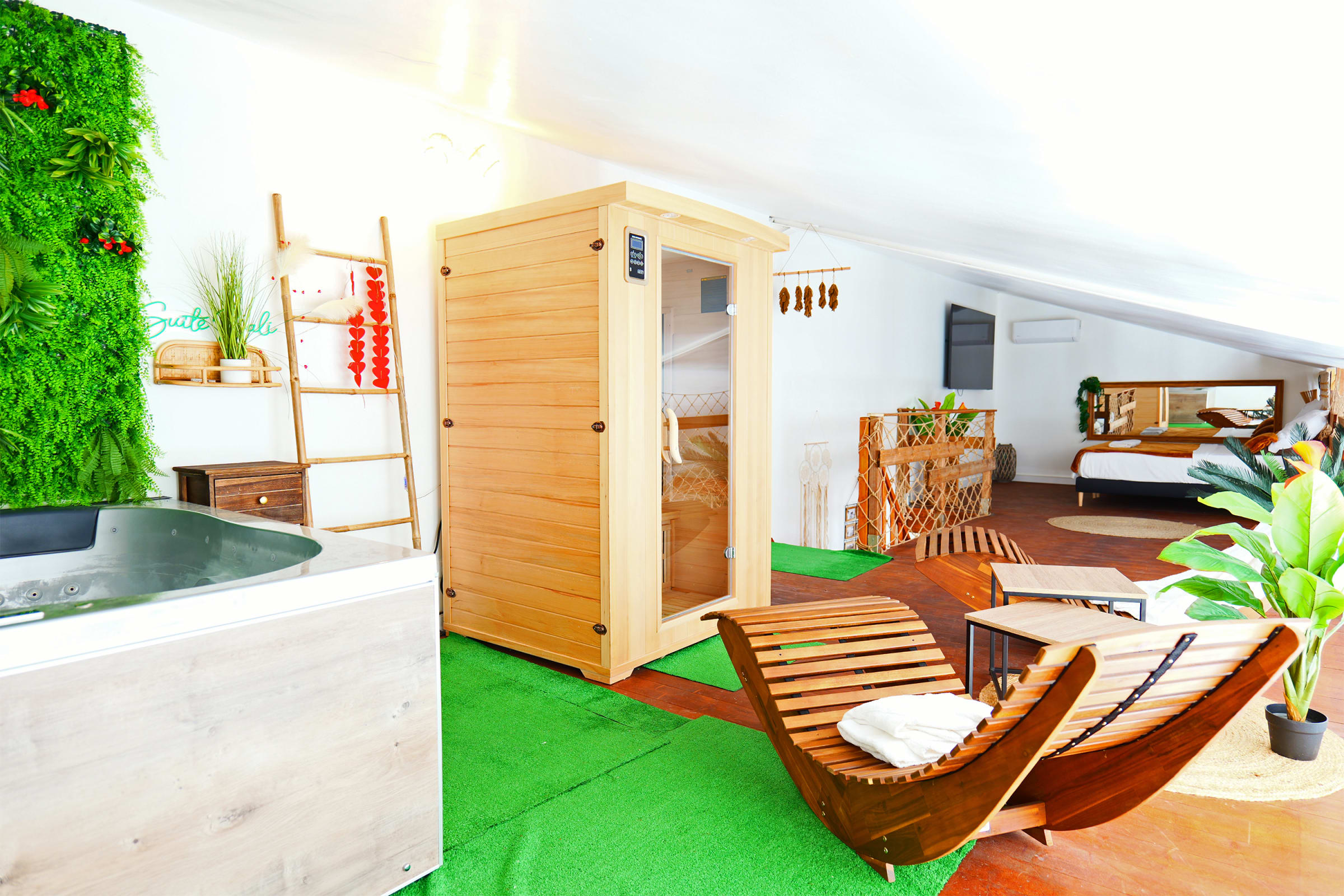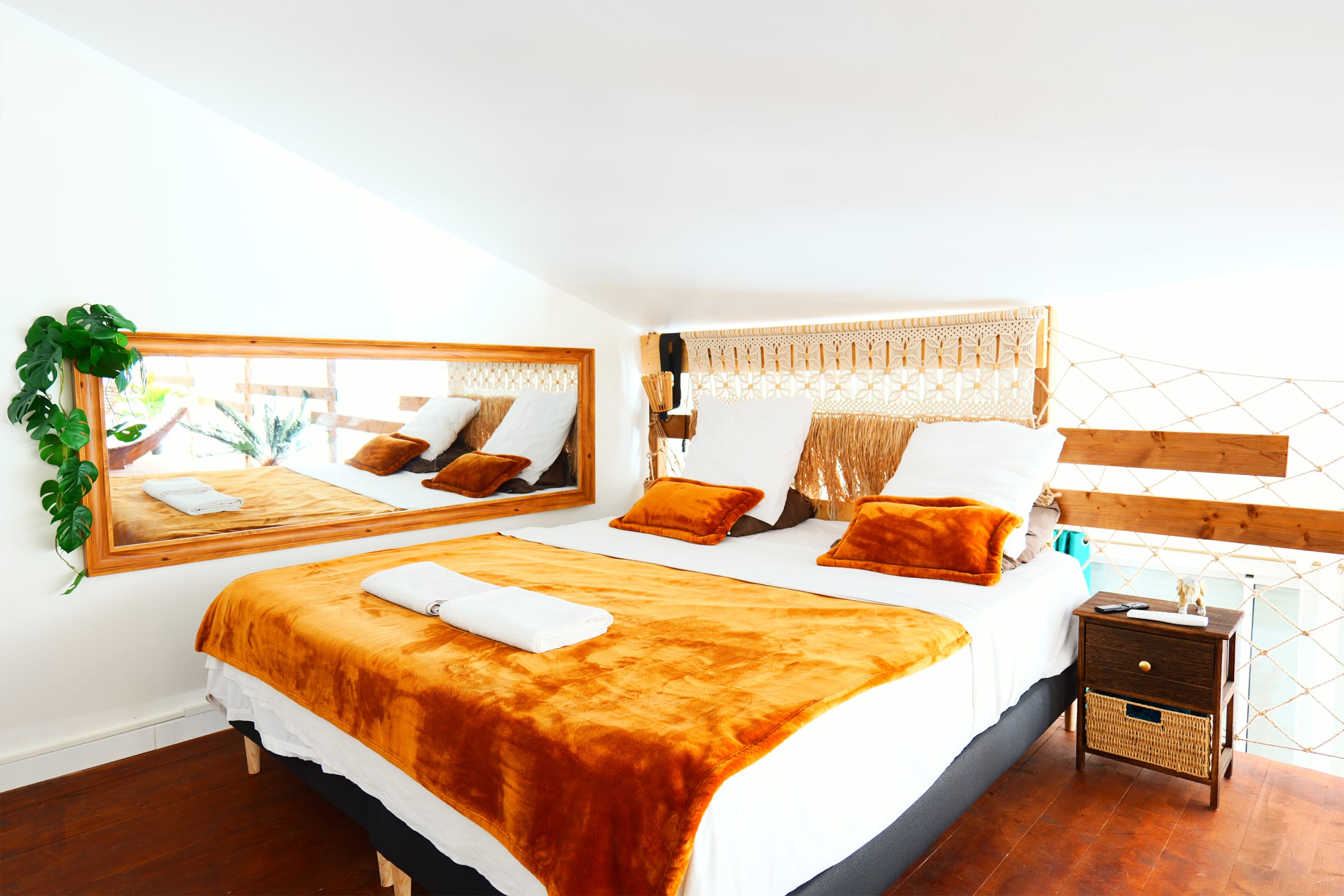 - un charmant salon avec mezzanine, soigneusement décoré, comprenant un lit king size de180 cm,