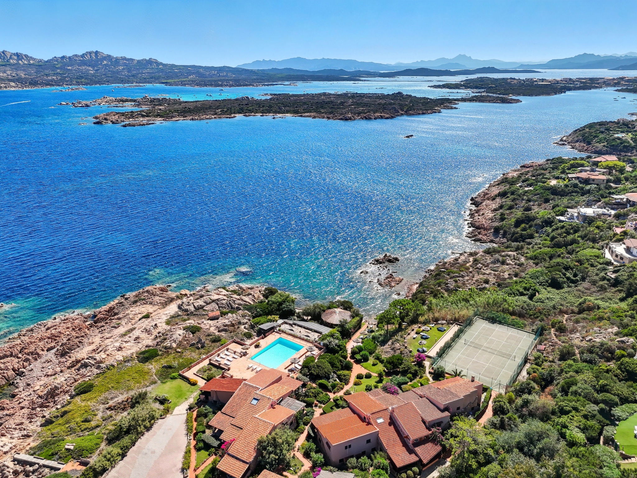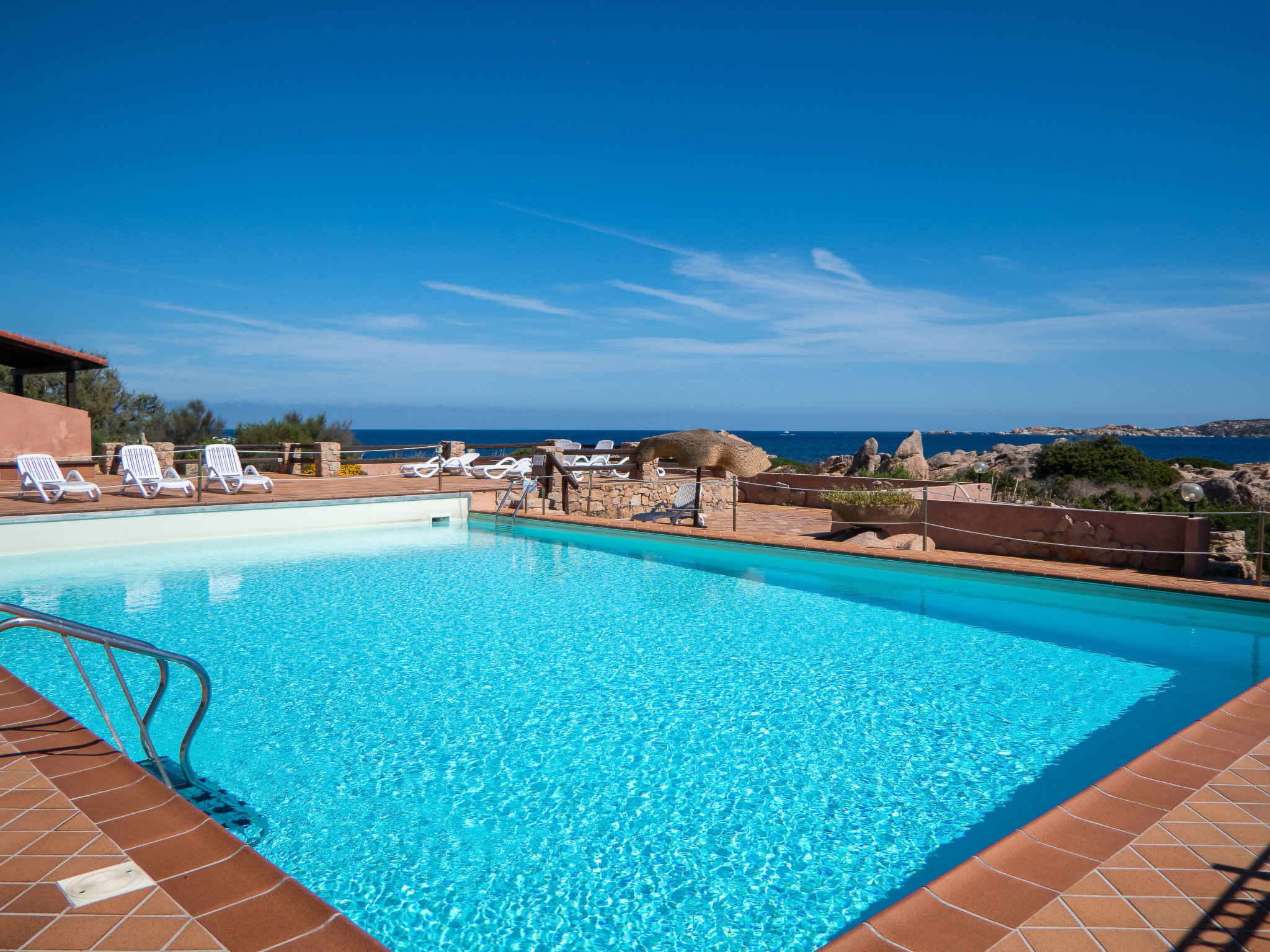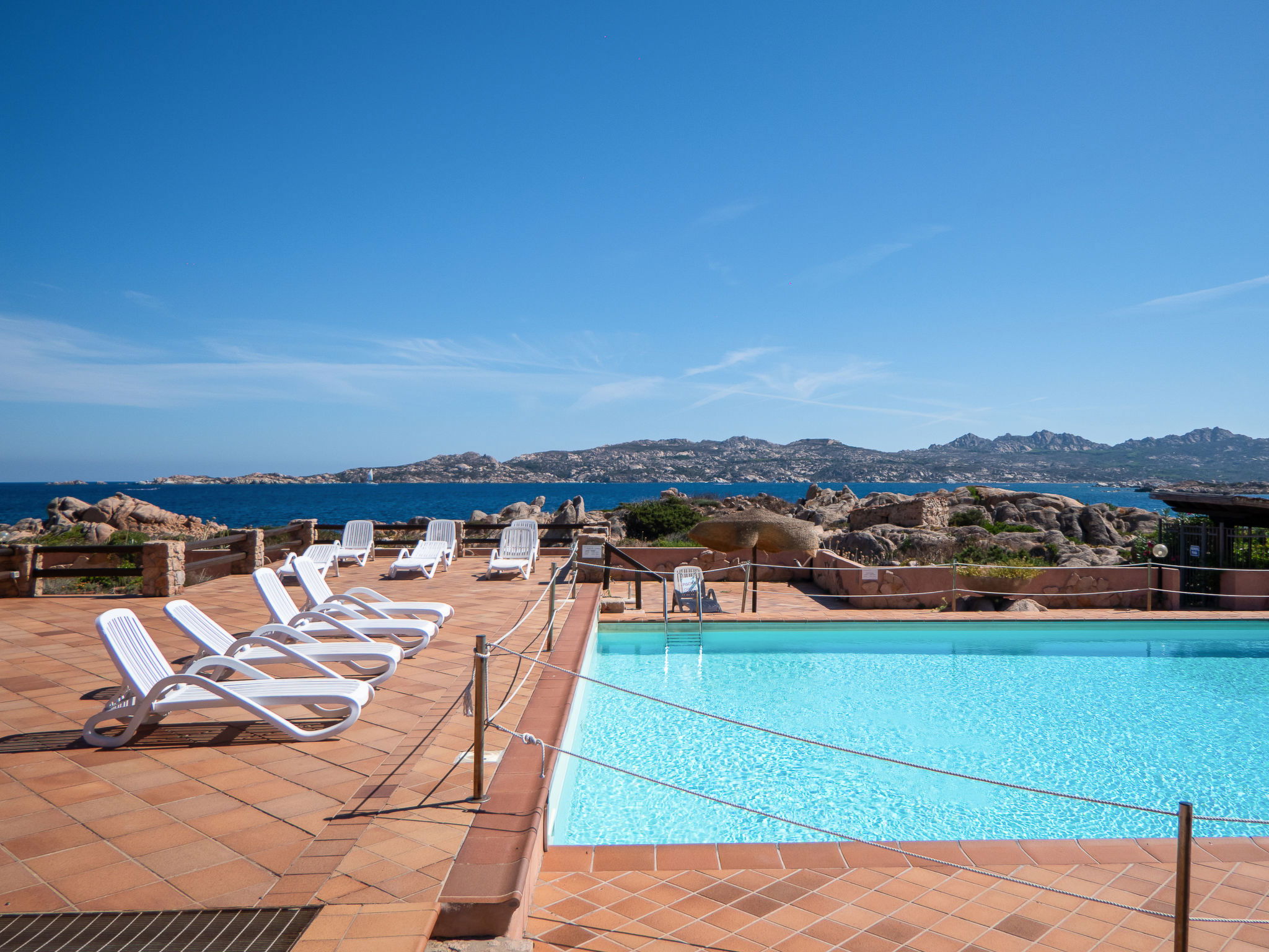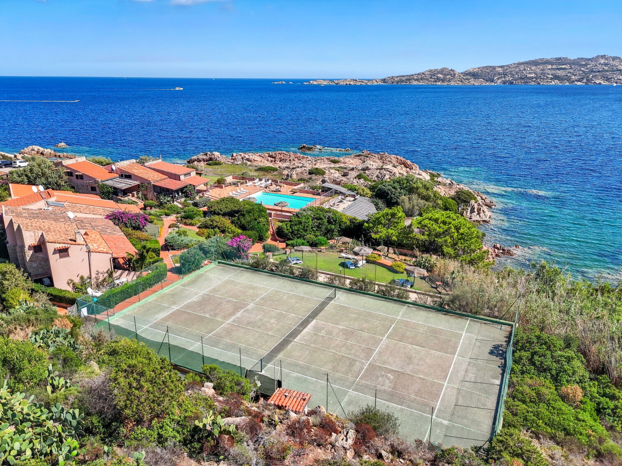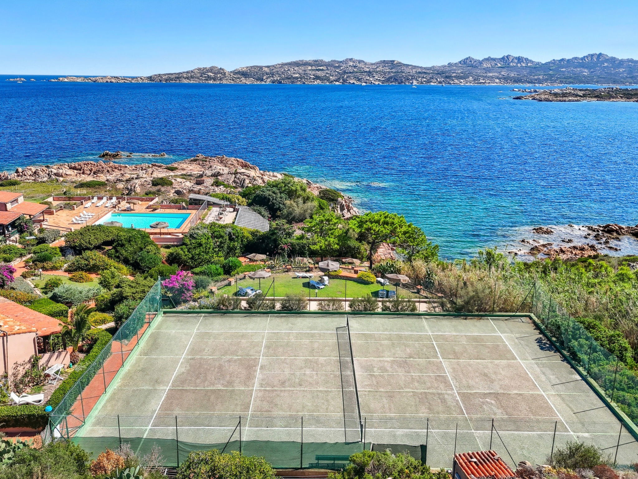 Villaggio Piras: Résidence "Sporting House". À 3 km du centre de La Maddalena, situation tranquille, ensoleillée dans un quartier résidentiel, à 50 m de la mer, à 100 m de la plage. En commun: parc, grand jardin entretenu, plantes et fleurs, piscine cloturée (25 x 10 m, profondeur 130 - 250 cm, disponibilité saisonnière: 15.Jun. - 15.Sep.). Douche extérieure, tennis (1 x dur), terrain de pétanque, meubles de jardin, place de parking sur le terrain. Supermarché 2.5 km, restaurant 2 km, bar 2 km, arrêt de bus 5 km, plage de sable "Spalmatore" 4 km. Port plaisance 3 km. Attractions à proximité: Palau 6 km, Olbia 45 km, Porto Cervo 37 km, Santa Teresa 31 km. Veuillez noter: voiture recommandée.