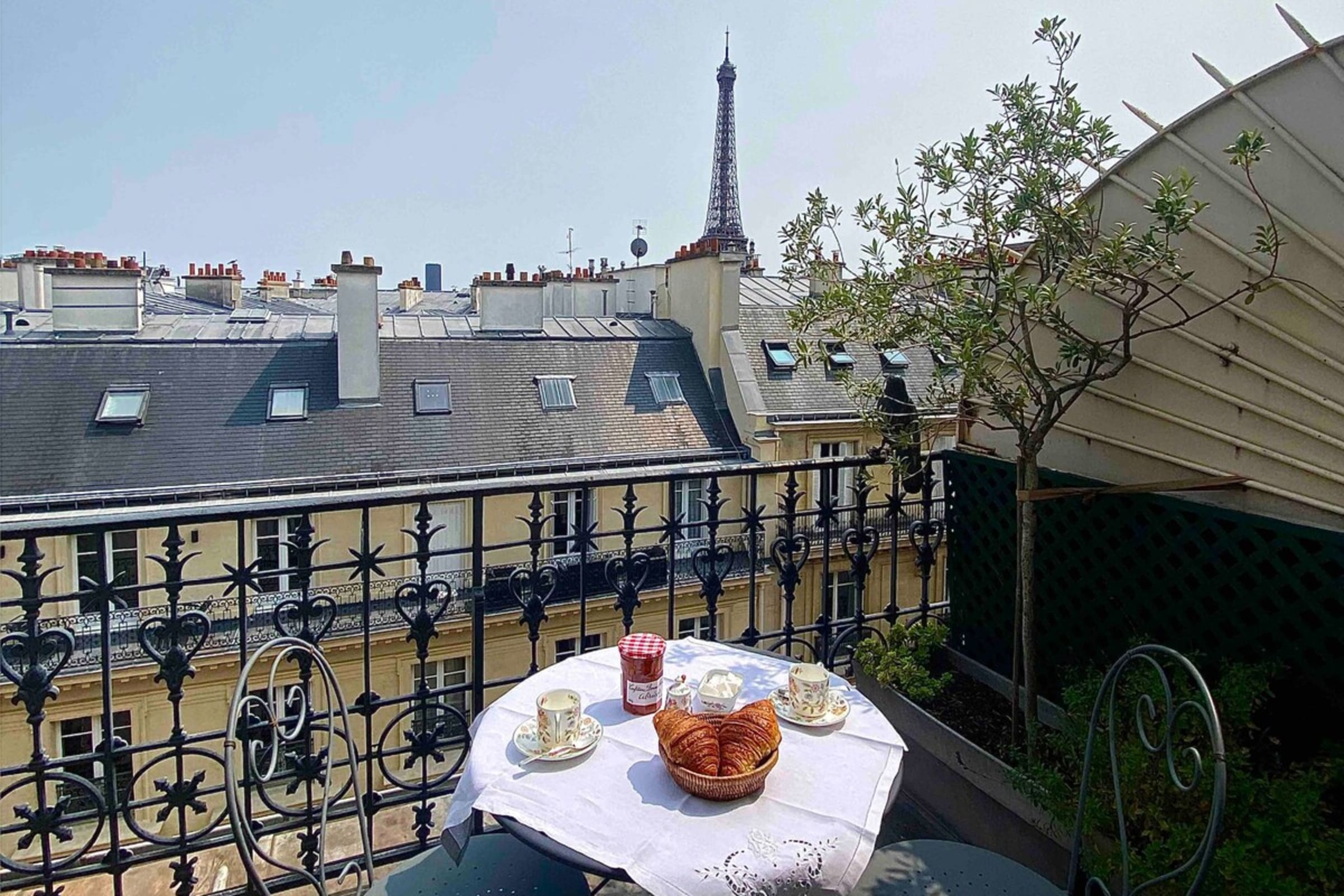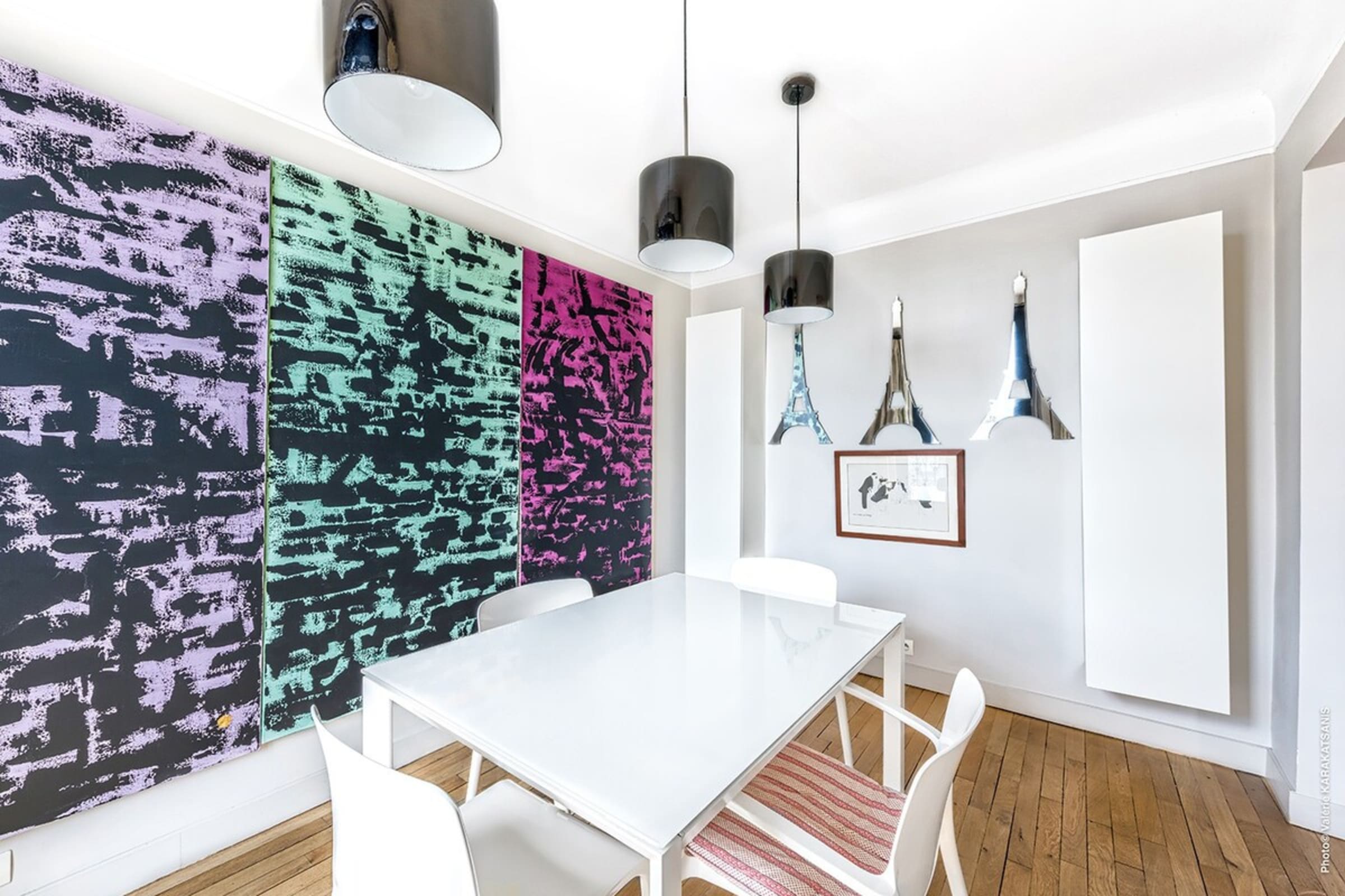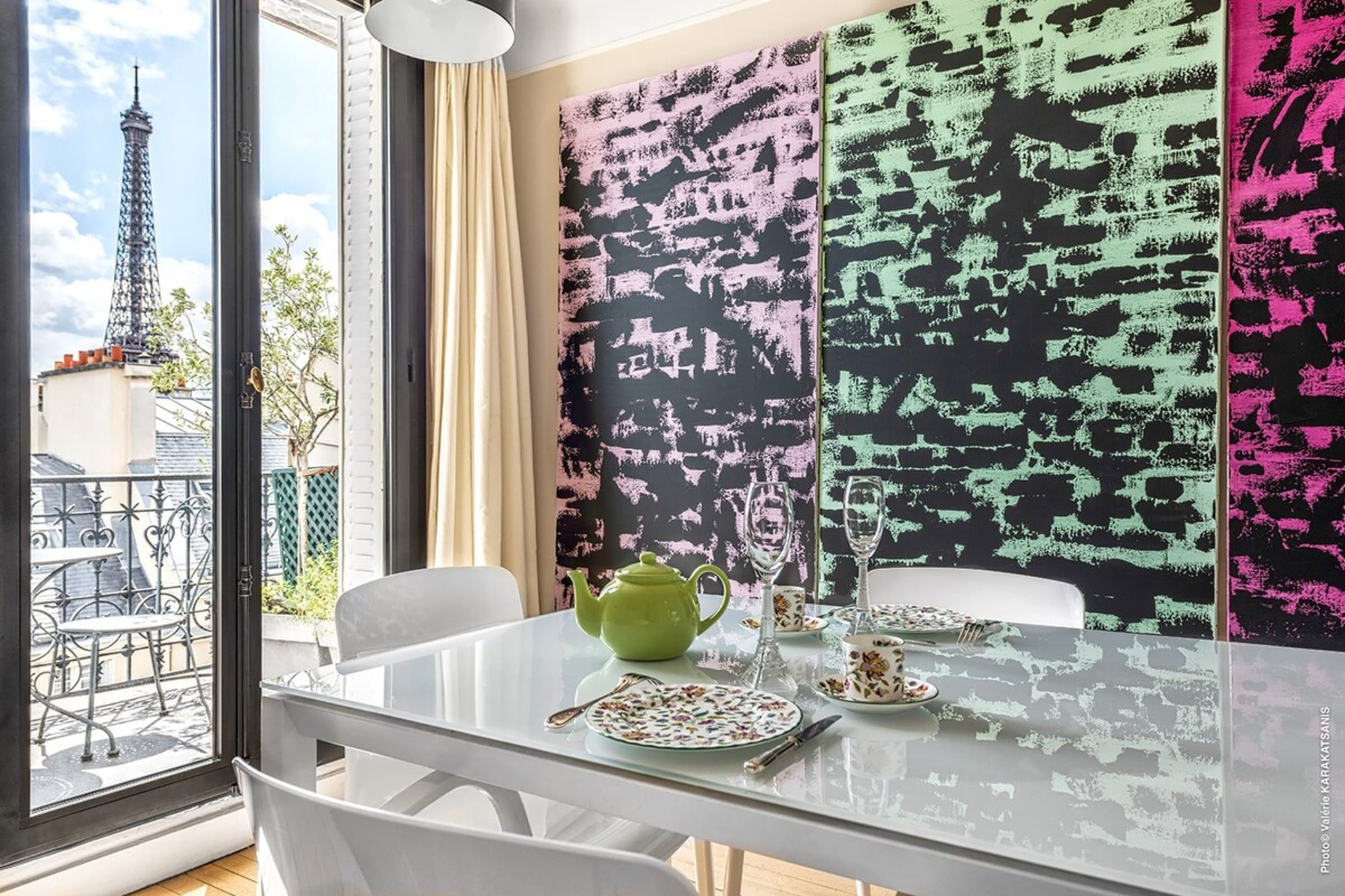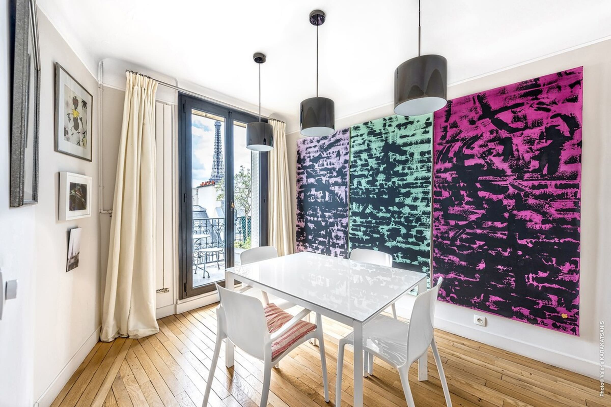 Décoré avec goût dans un style typiquement français, le salon allie élégance et confort, créant une ambiance chaleureuse idéale pour des soirées douillettes à la maison. La salle à manger généreusement dimensionnée, adjacente, est parfaite pour recevoir des amis ou savourer un dîner romantique à deux. La table donne sur la terrasse pittoresque, offrant un cadre magnifique avec la Tour Eiffel en toile de fond.