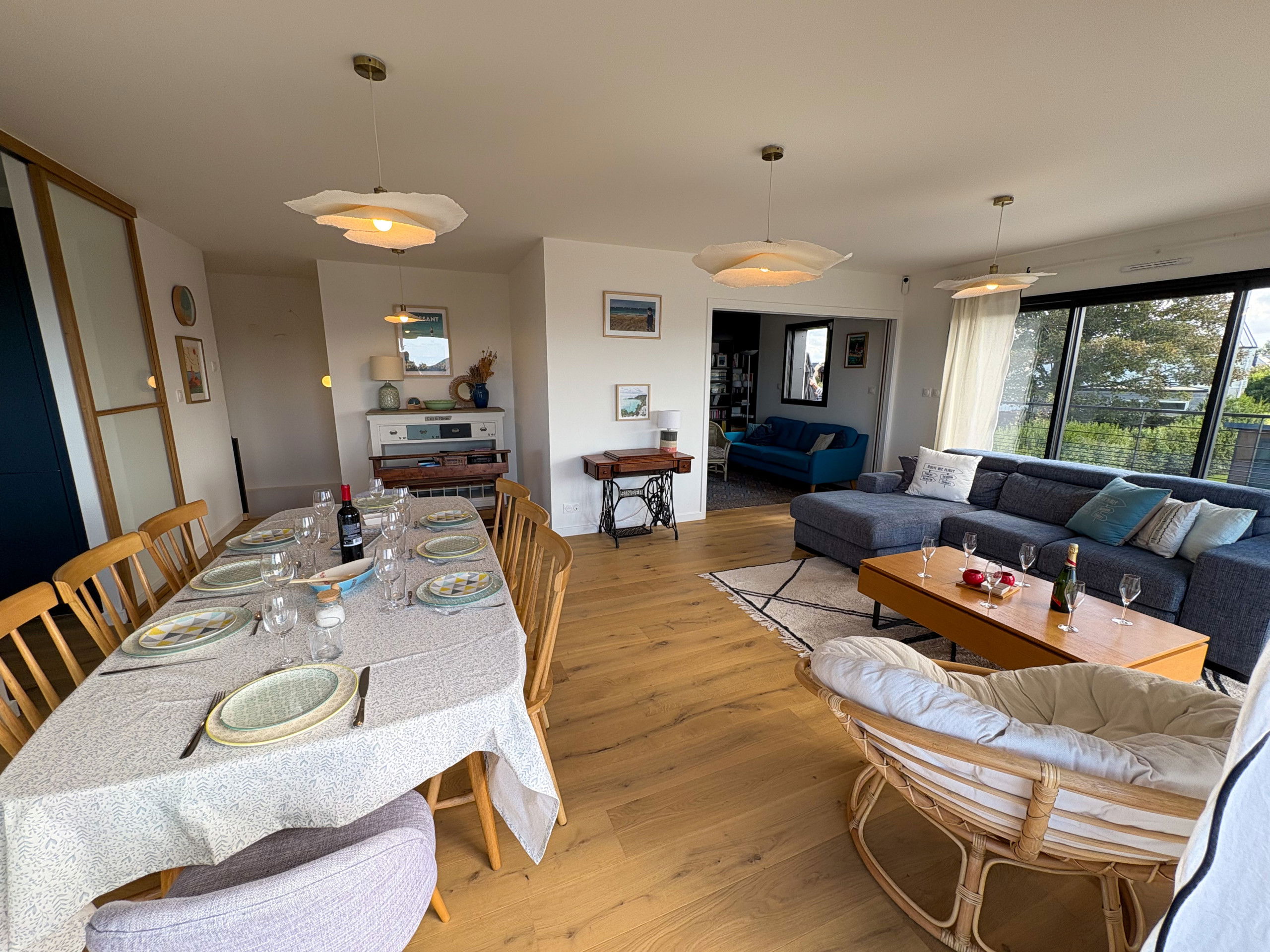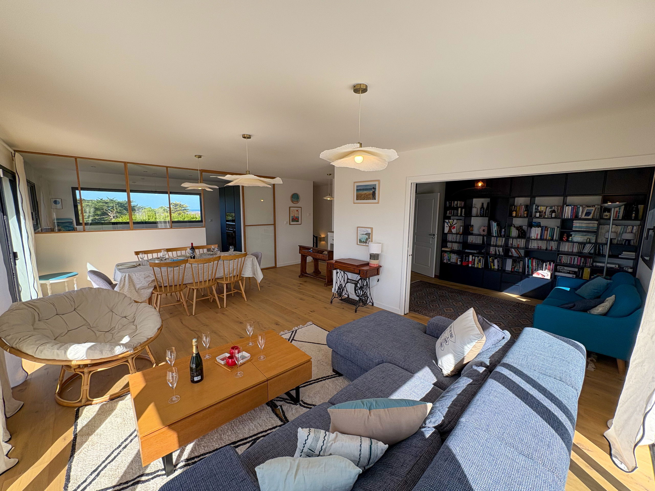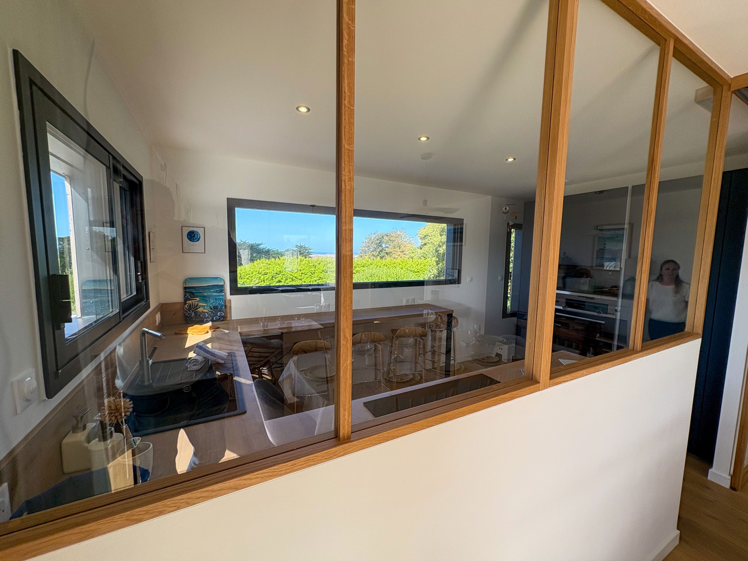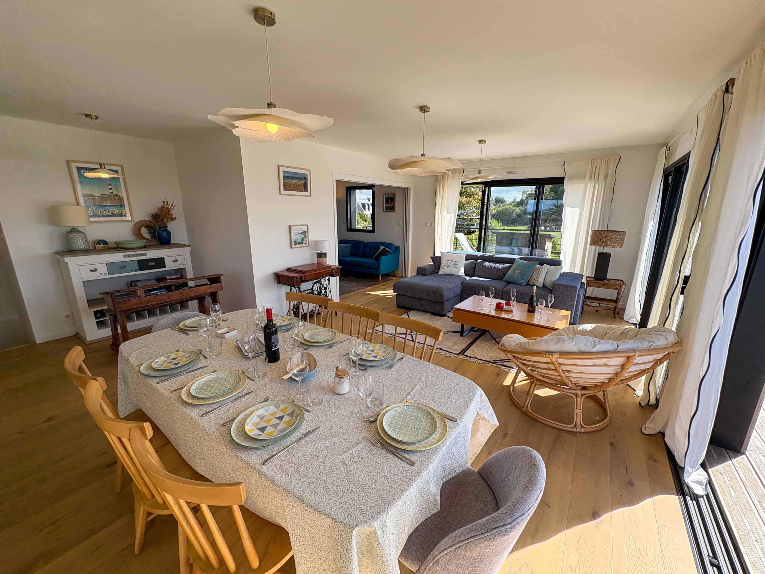 A l'étage la décoration est moderne et chaleureuse, avec des espaces de vie lumineux et ouverts, un double salon spacieux, une cuisine entièrement équipée, et tout le nécessaire pour vous sentir comme chez vous. Depuis la maison, vous profiterez d’une vue imprenable sur la mer, notamment depuis la grande terrasse, parfait pour prendre vos repas ou simplement admirer les couchers de soleil sur l’horizon.