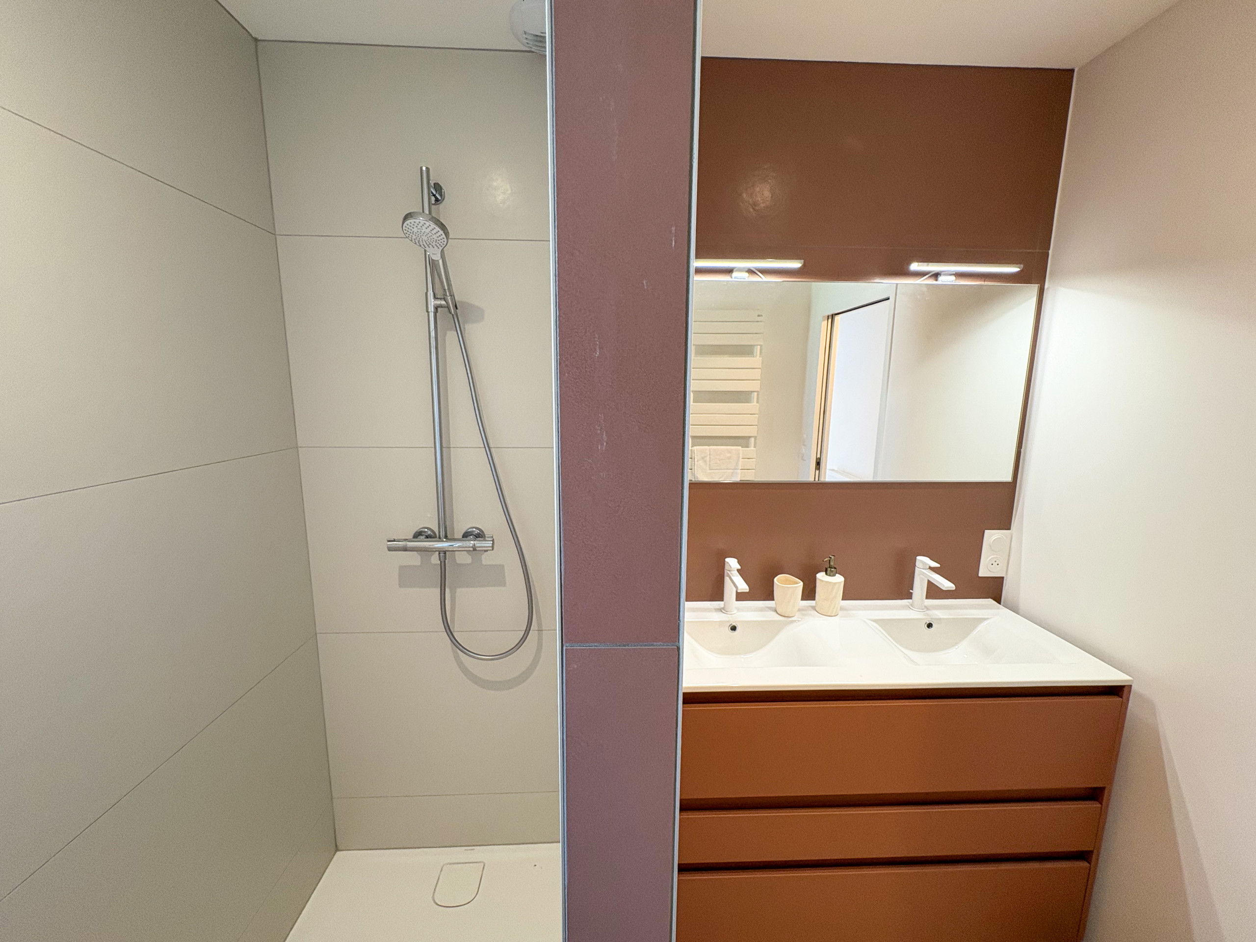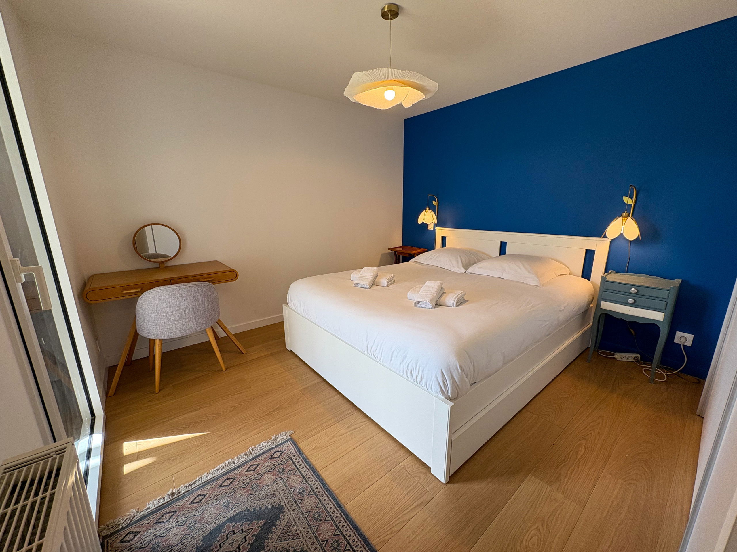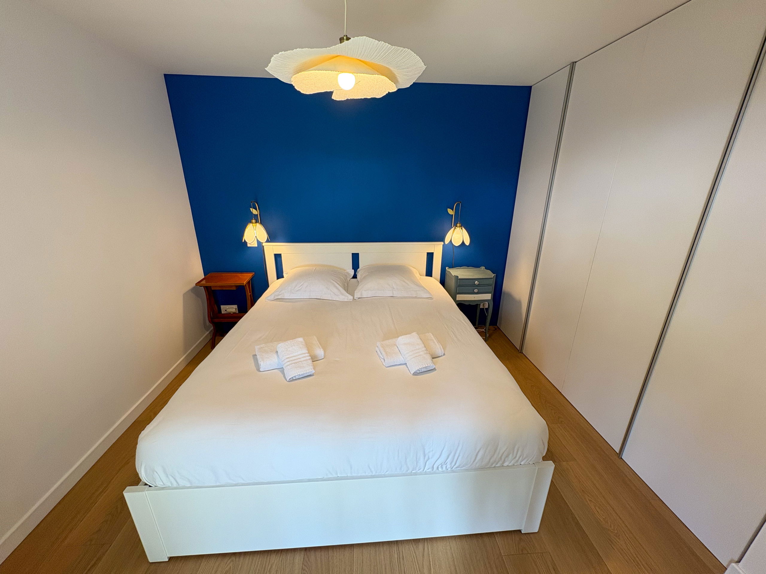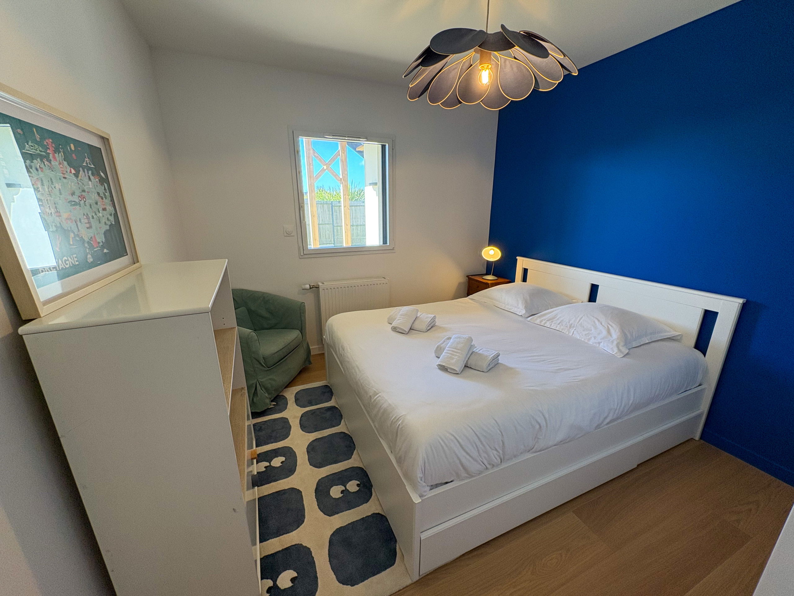 Le coin nuit du rez-de-chaussée comprend une somptueuse suite parentale avec un lit Queen-size (160x200), une salle de douche privative ainsi que des toilettes attenantes, offrant un espace intime et confortable.