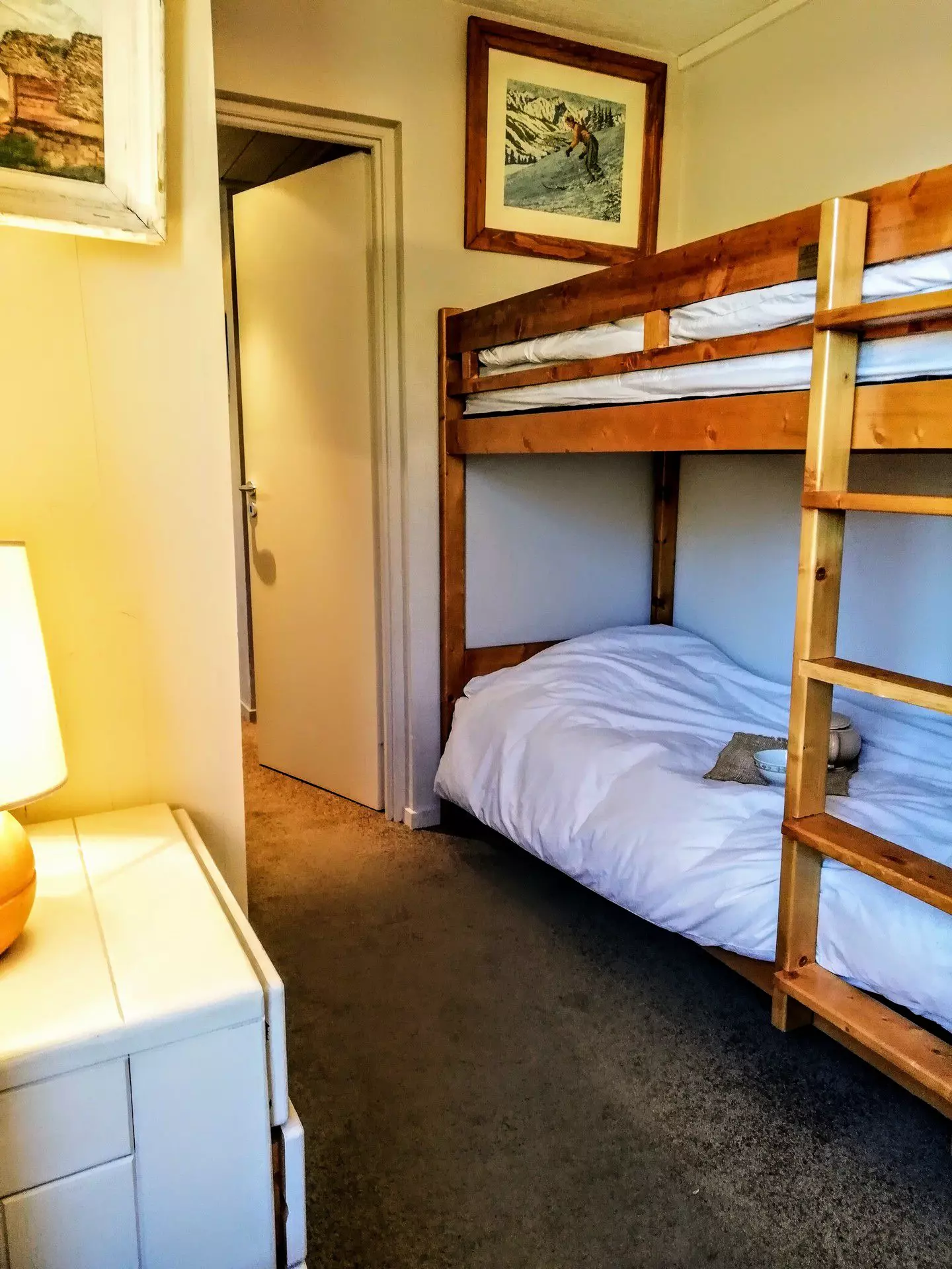 Dans la deuxième chambre, 1 ensemble de lits superposés. Le couchage en hauteur ne convient pas à des enfants de moins de 6 ans