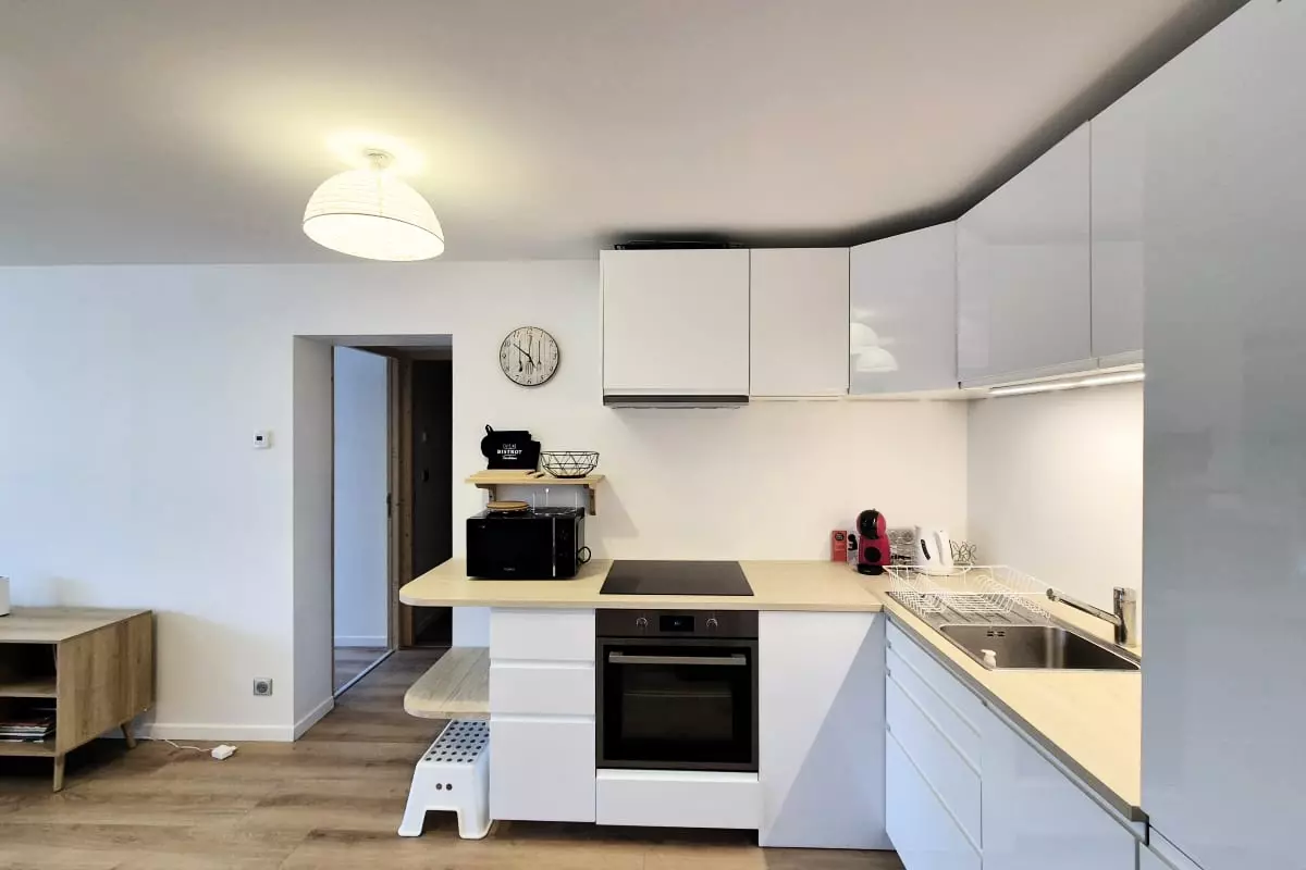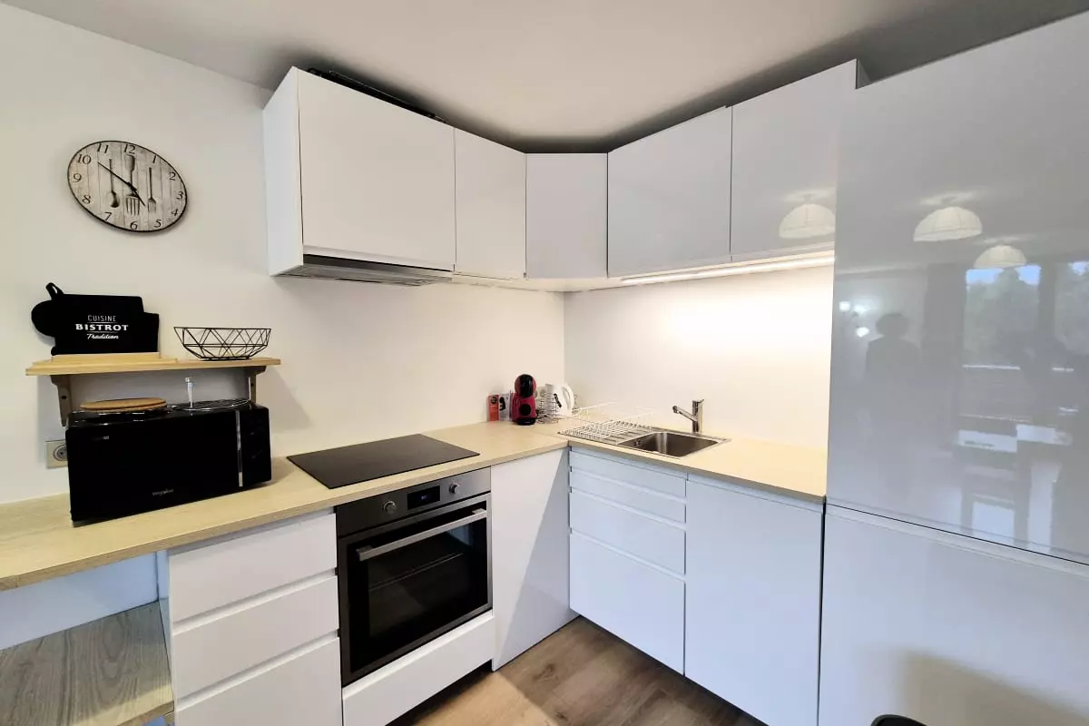Cuisine moderne et toute équipée : four, micro-onde, grand congélateur, lave-vaisselle, machine à café Dolce Gusto, bouilloire, aspirateur.