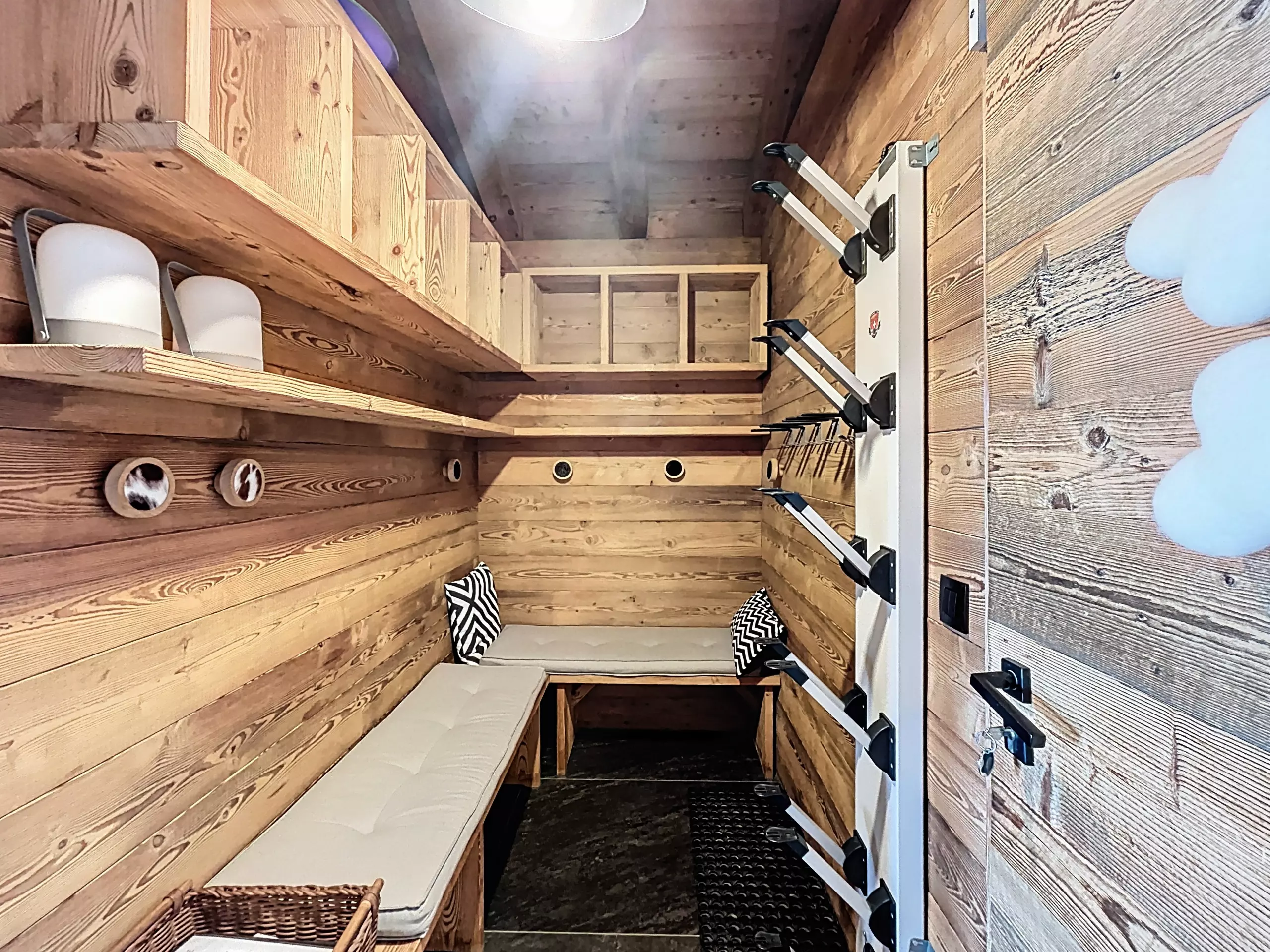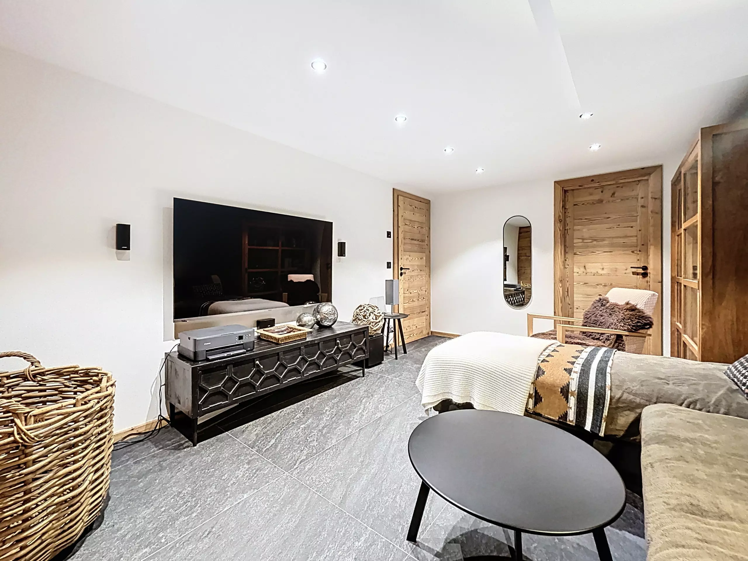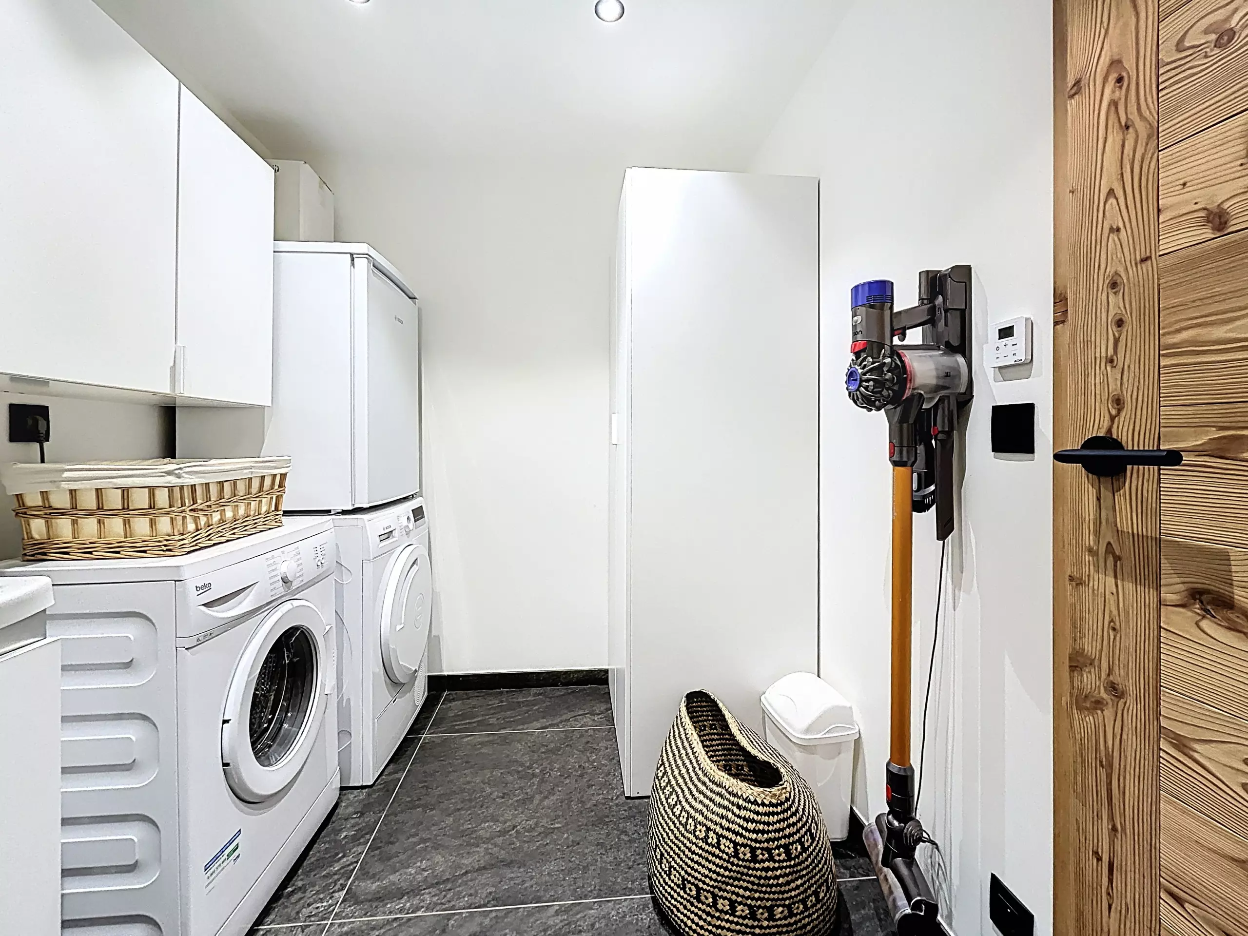 Les équipements haut de gamme incluent une salle TV cocooning, une salle à skis avec chauffe-chaussures, une buanderie équipée (lave-linge et sèche-linge) et une connexion internet haut débit.