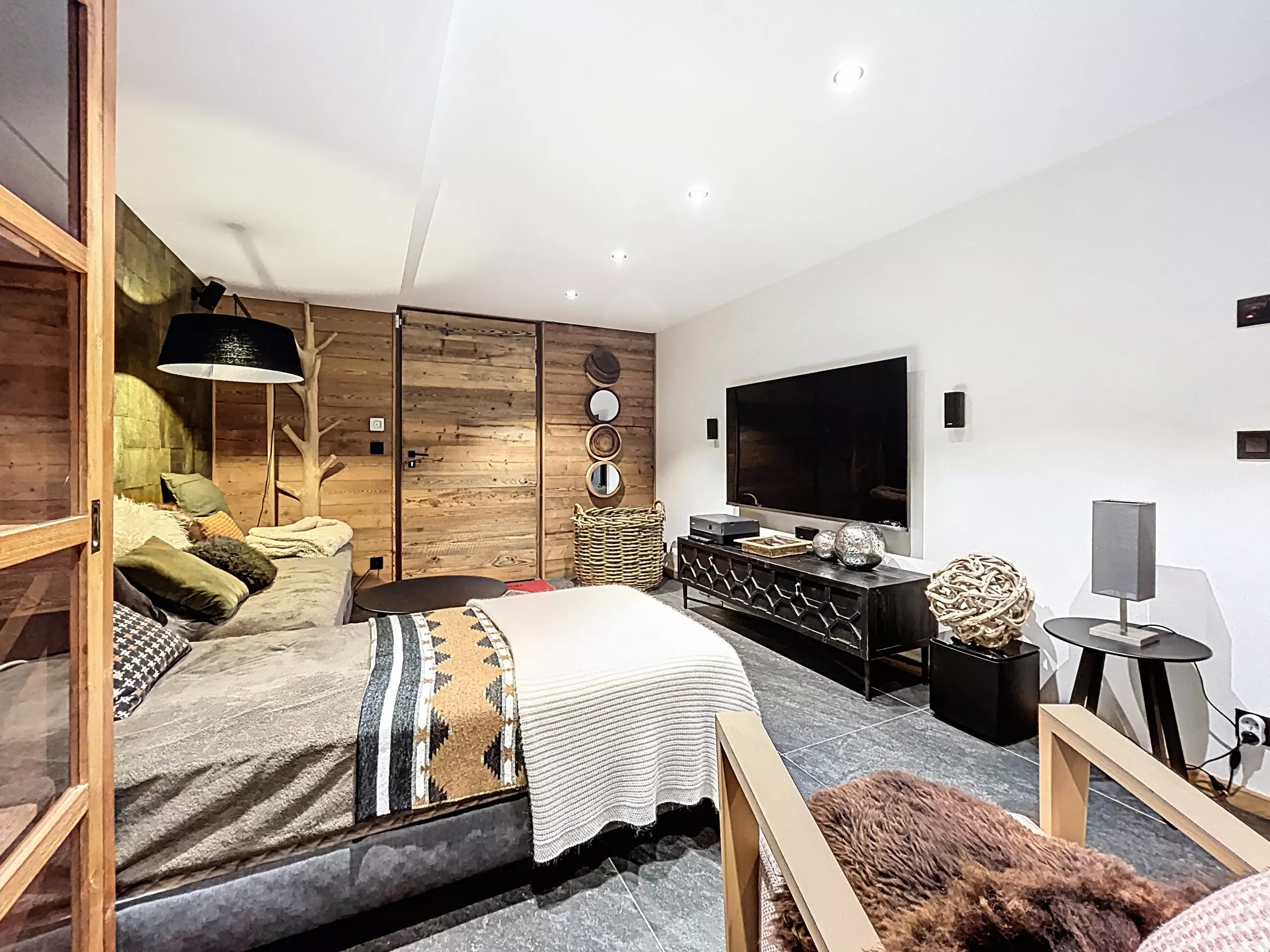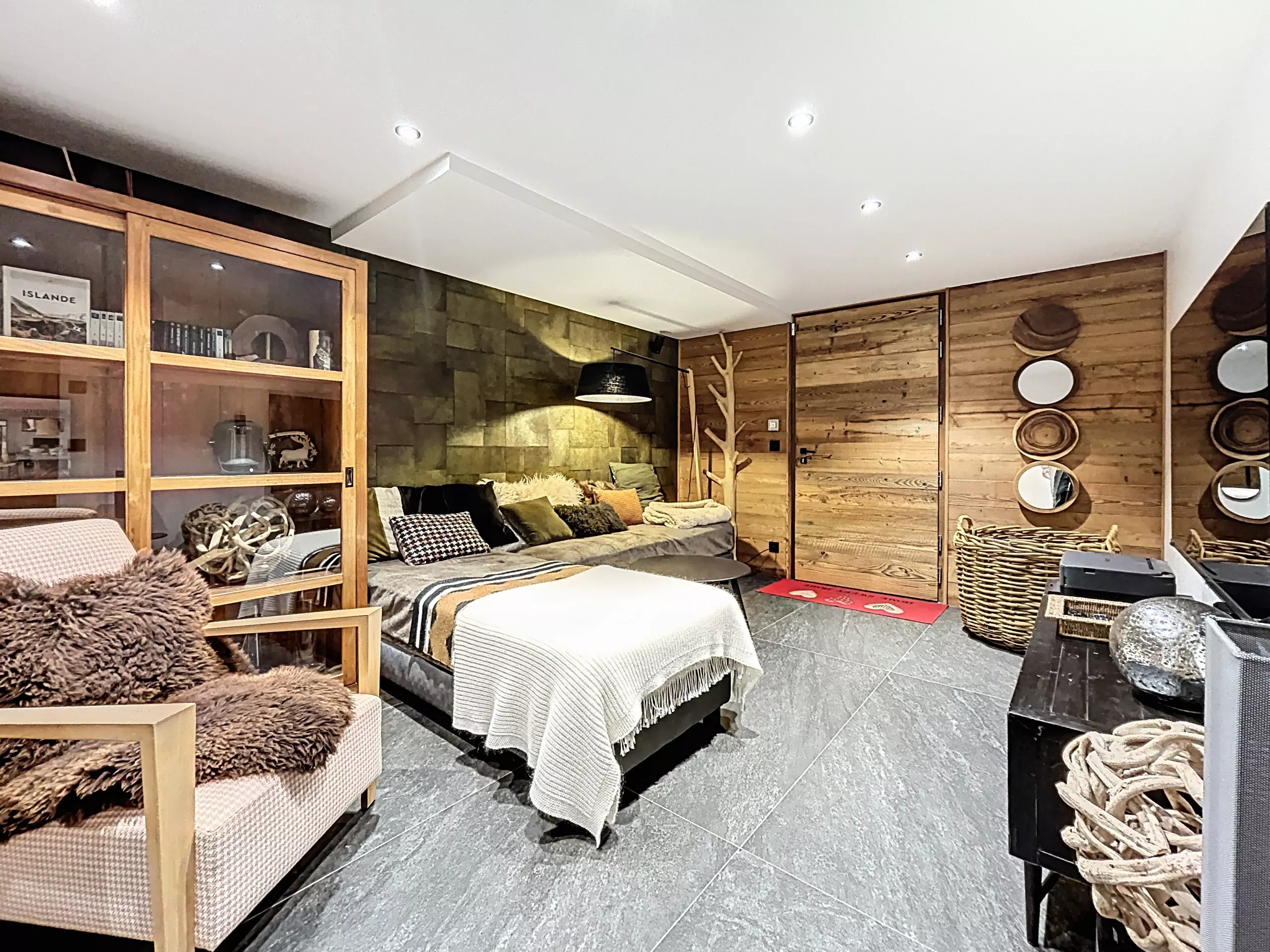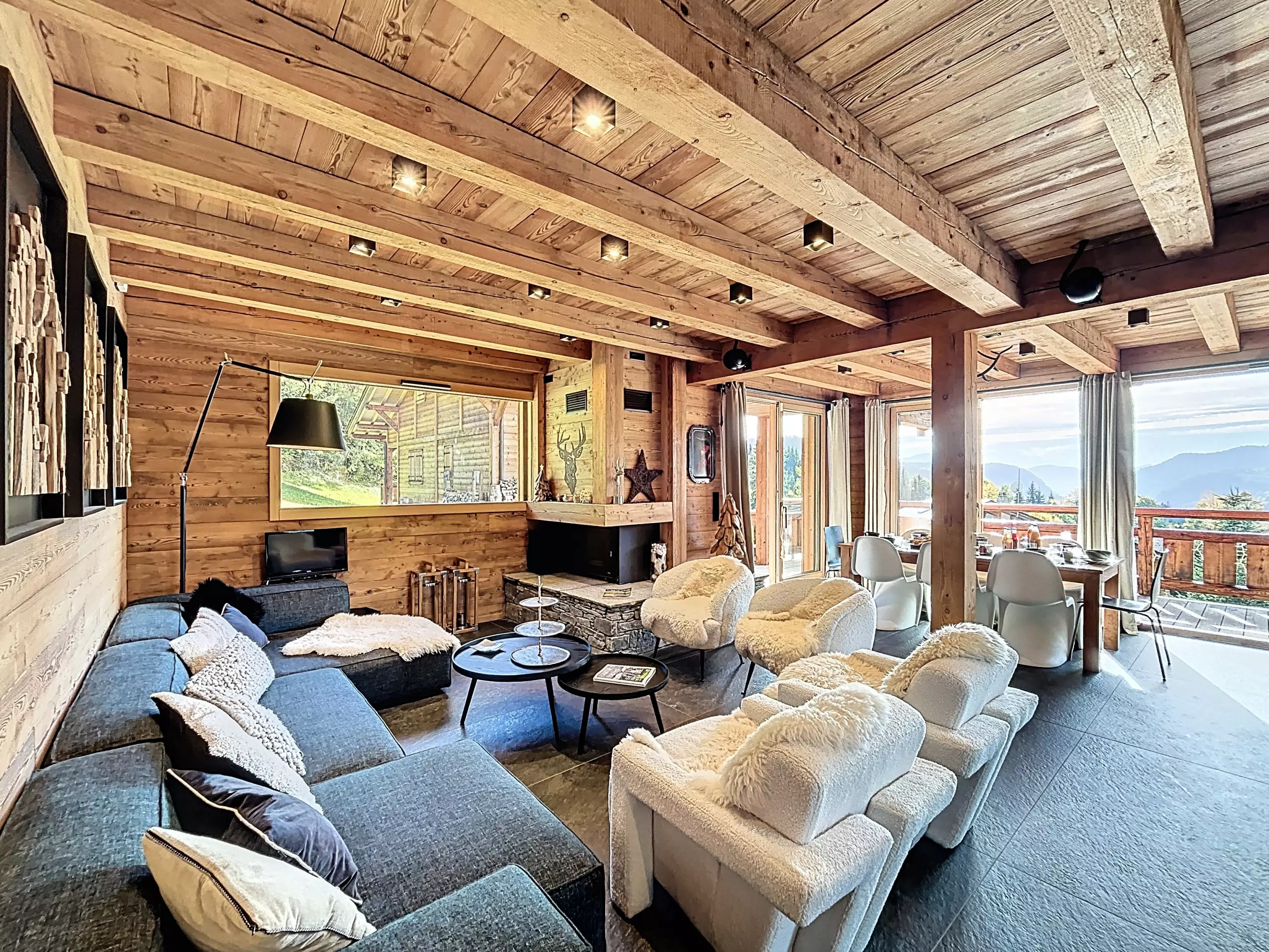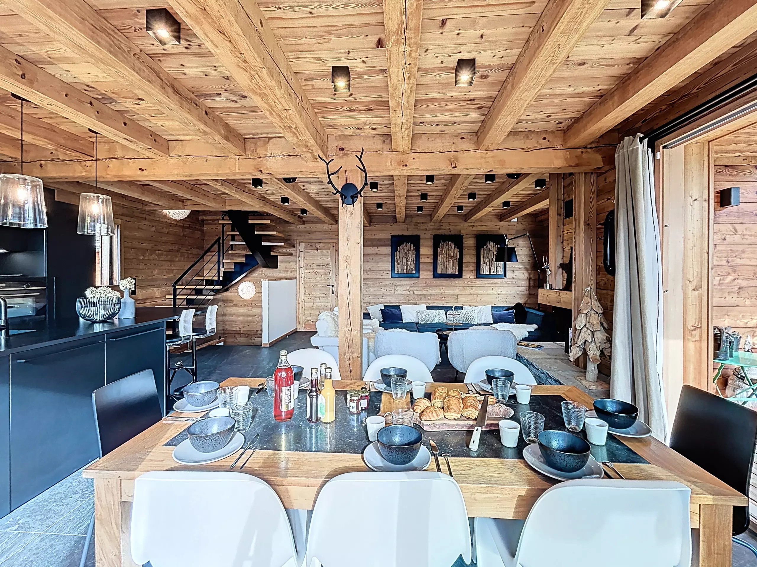 L’espace de vie, chaleureux et convivial, s’articule autour d’un salon-séjour à la décoration alpine raffinée, mêlant bois noble, tissus chaleureux et touches contemporaines. La cheminée crée une atmosphère douce et apaisante après une journée sur les pistes. La cuisine moderne, ouverte et entièrement équipée, permet de partager des moments gourmands autour de la grande table à manger, tandis que le système sonore complète l’ambiance feutrée du lieu.