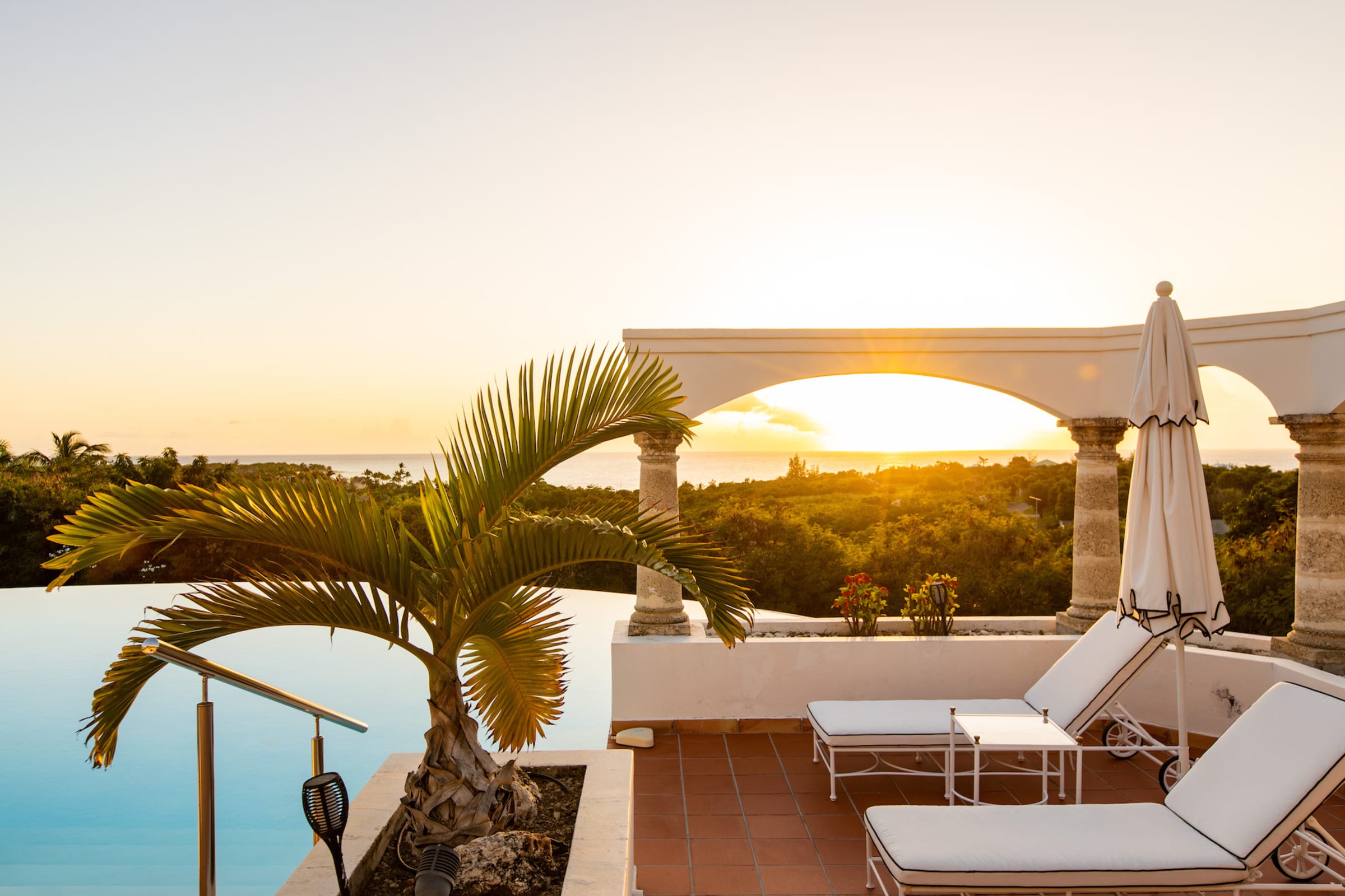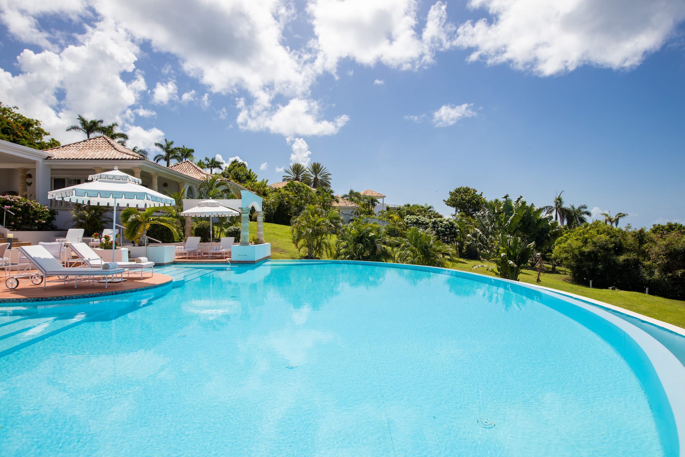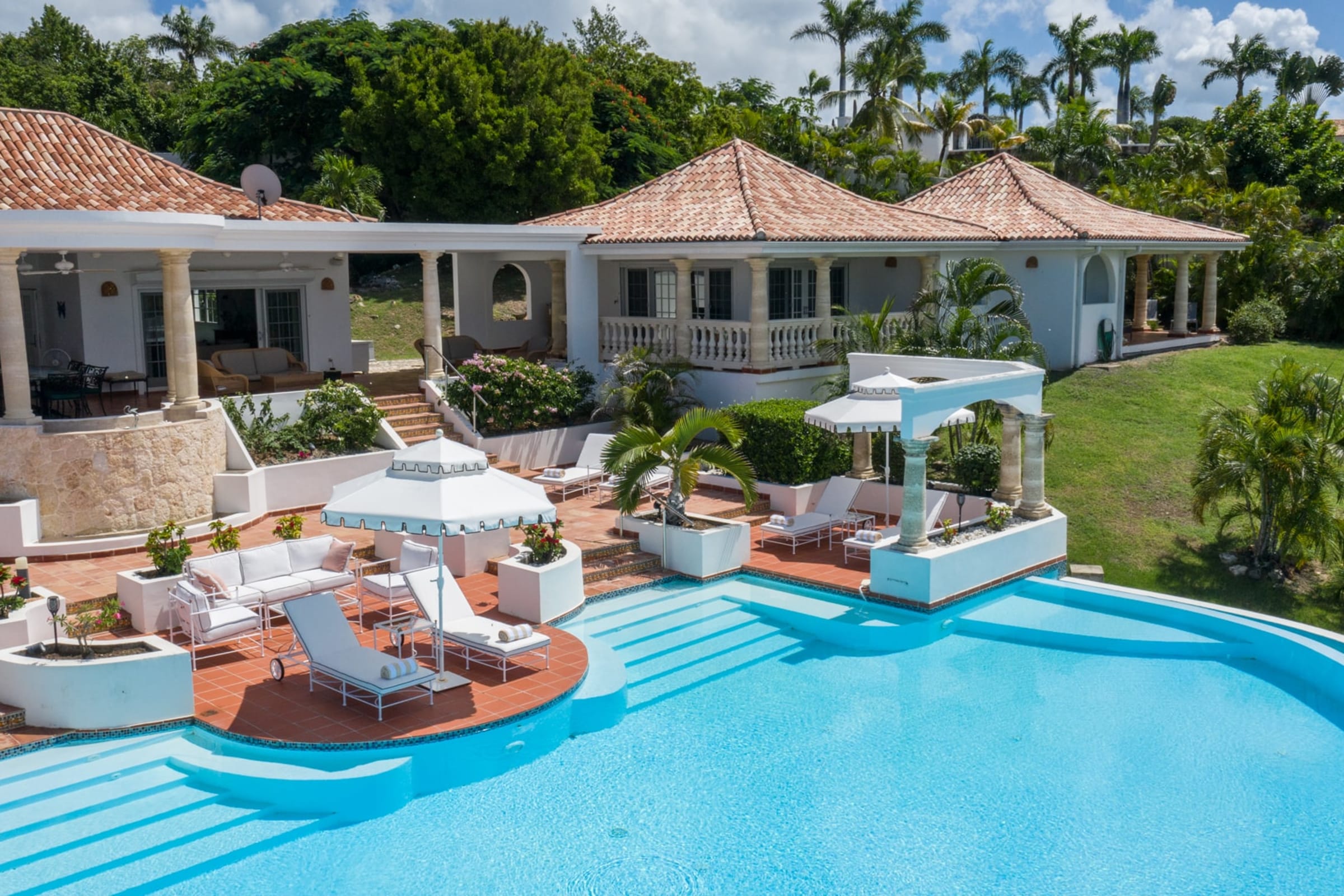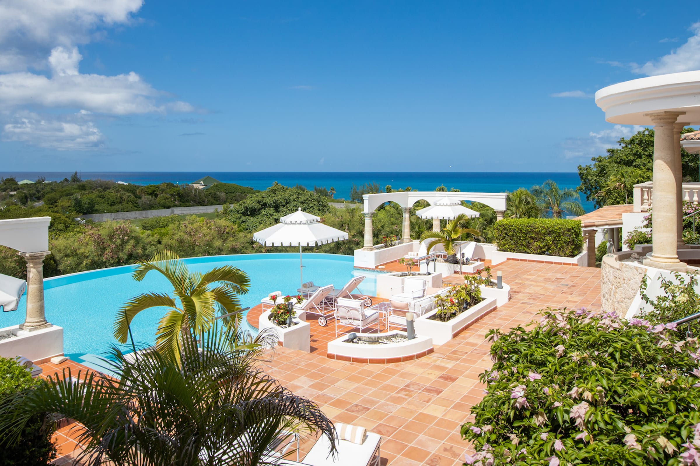Bougainvilliers roses luxuriants et jardin rempli de palmiers, avec une pelouse verte, attirent le regard droit sur une vue panoramique à couper le souffle.La maison est parfaite pour la vie en plein air avec des terrasses à plusieurs niveaux qui descendent du niveau principal à la grande piscine à débordement en forme de fer à cheval et au-delà jusqu'à la pelouse.