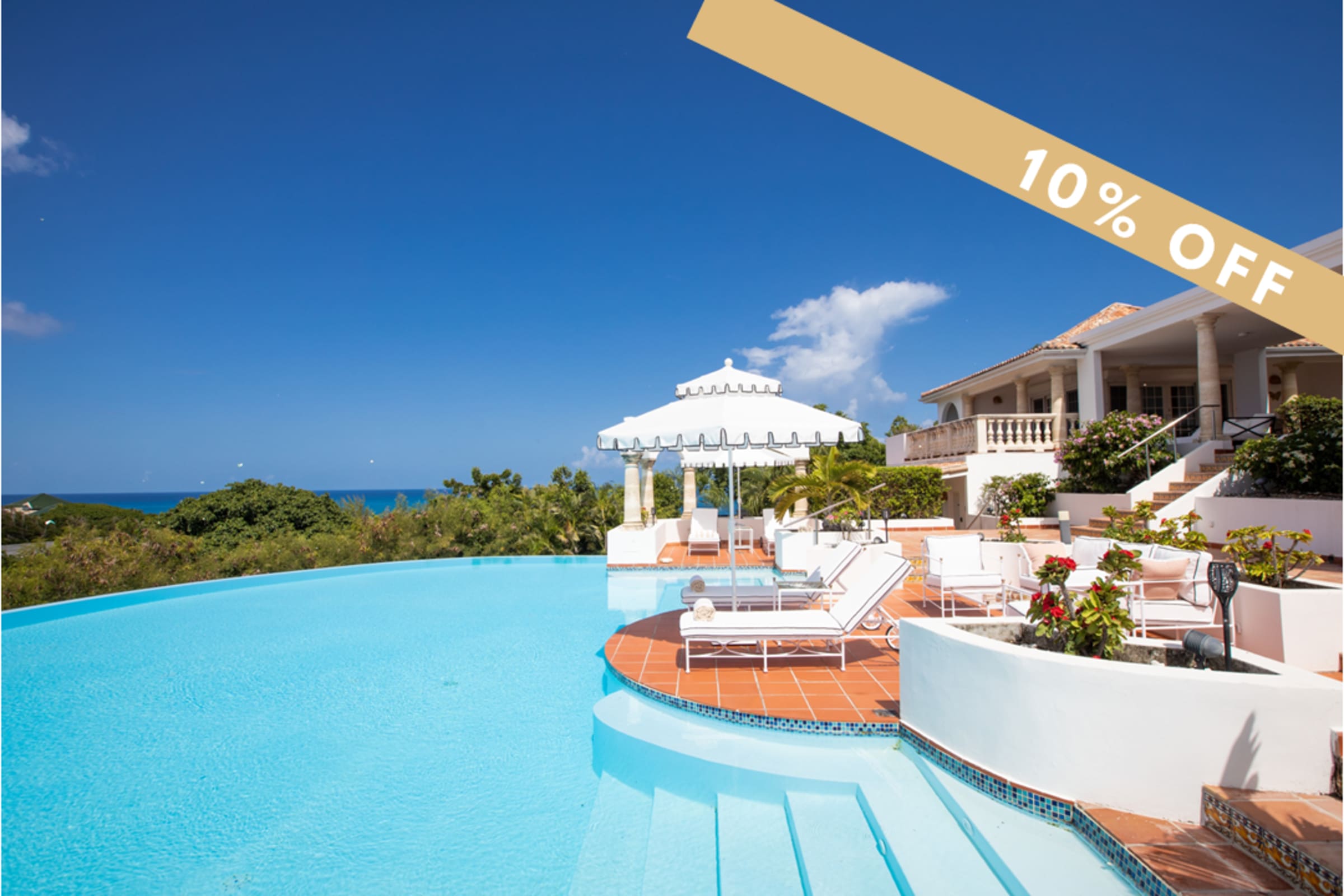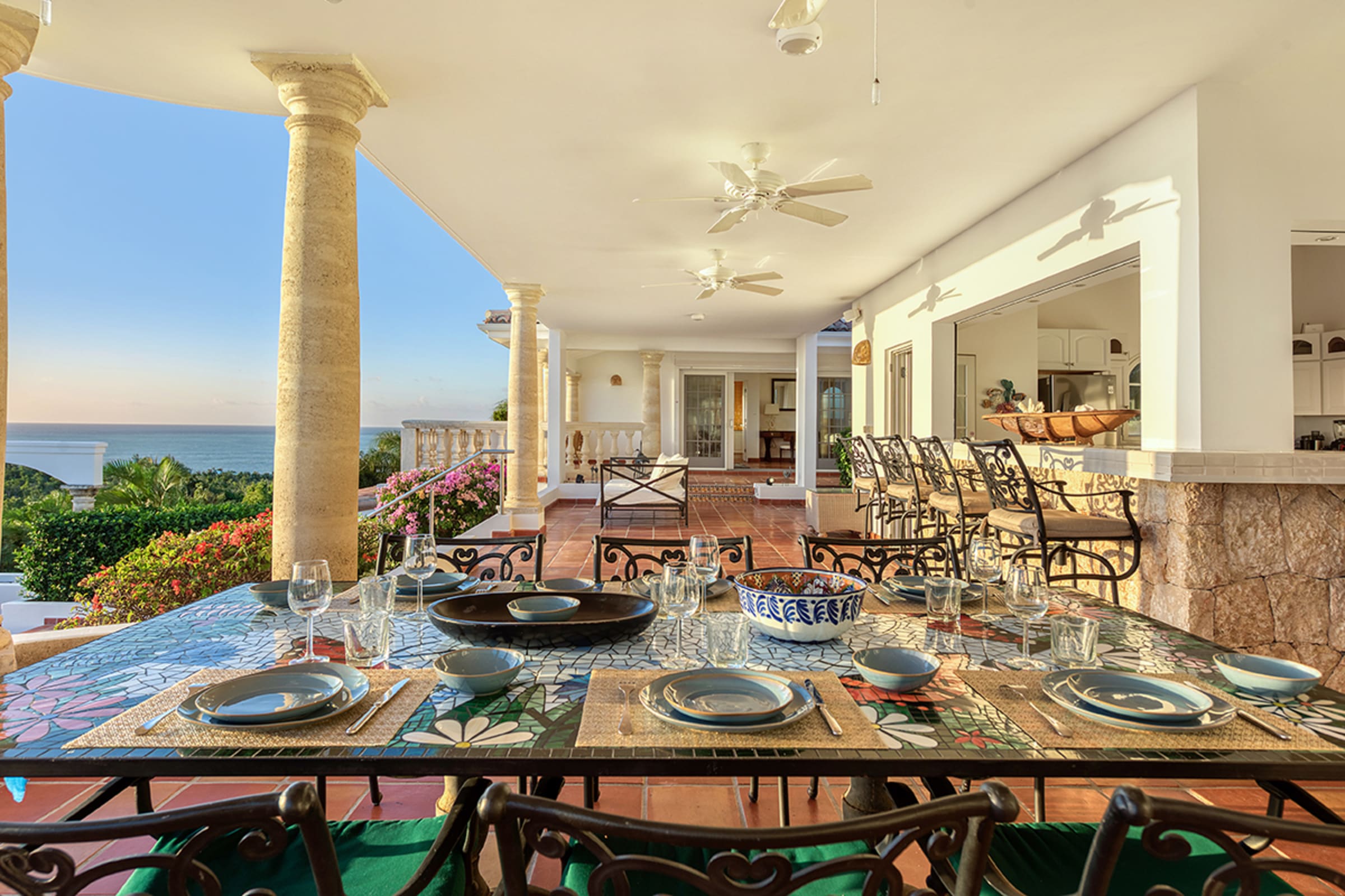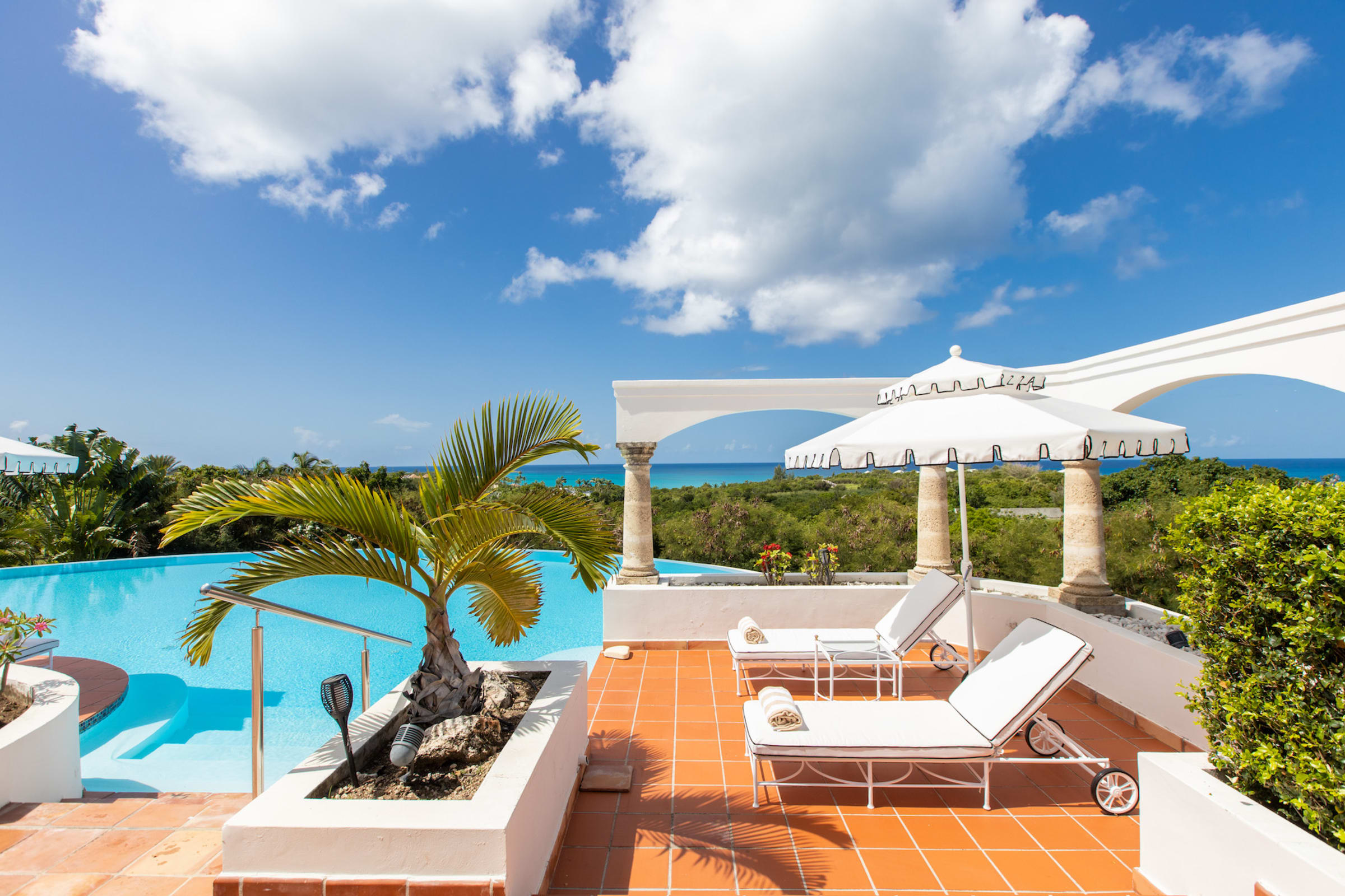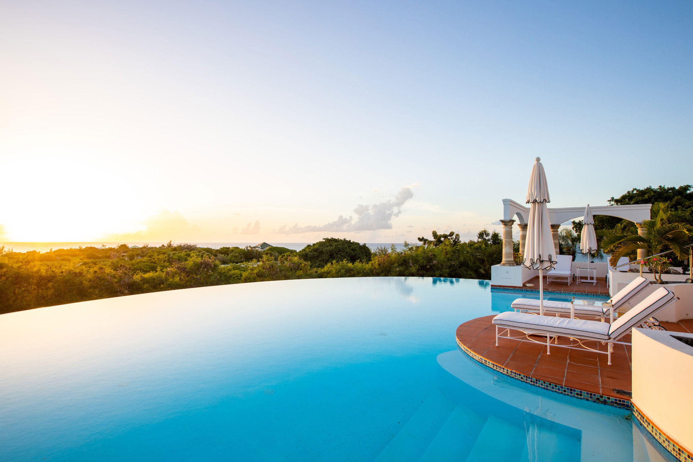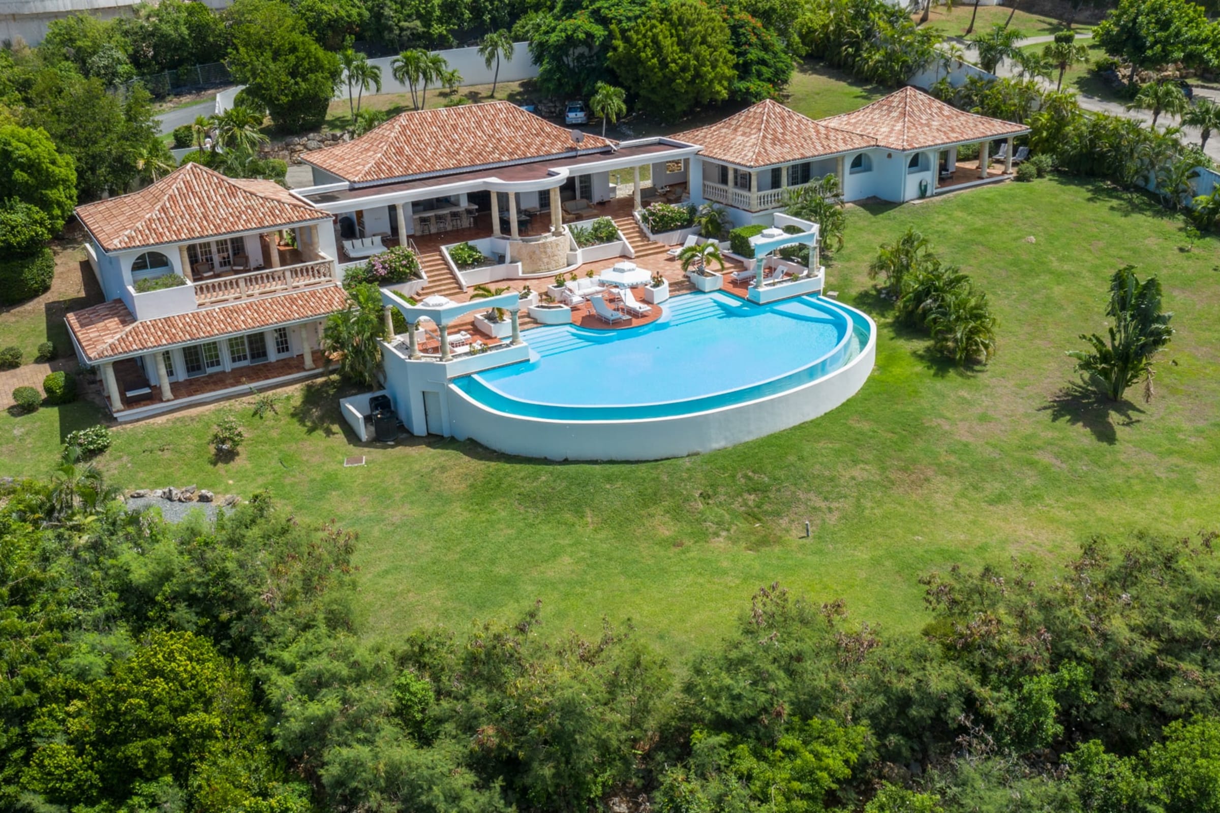 Bougainvilliers roses luxuriants et jardin rempli de palmiers, avec une pelouse verte, attirent le regard droit sur une vue panoramique à couper le souffle.La maison est parfaite pour la vie en plein air avec des terrasses à plusieurs niveaux qui descendent du niveau principal à la grande piscine à débordement en forme de fer à cheval et au-delà jusqu'à la pelouse.