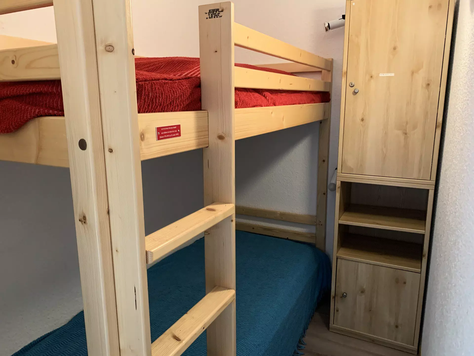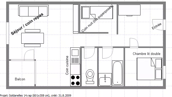 Loué pour 4 à 6 personnes, il se compose d'une entrée, d'un coin nuit avec deux lits superposés, d'une chambre avec un lit double, d'une salle de bain avec wc séparé, d'un coin cuisine ouvert sur le salon équipé d'une banquette + lit gigogne.