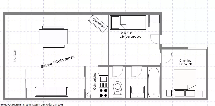 Couchages : 1 lit double, 1 ensemble de lits superposés (conseillé pour les enfants, uniquement à partir de 6 ans), 1 ensemble de lits gigognes