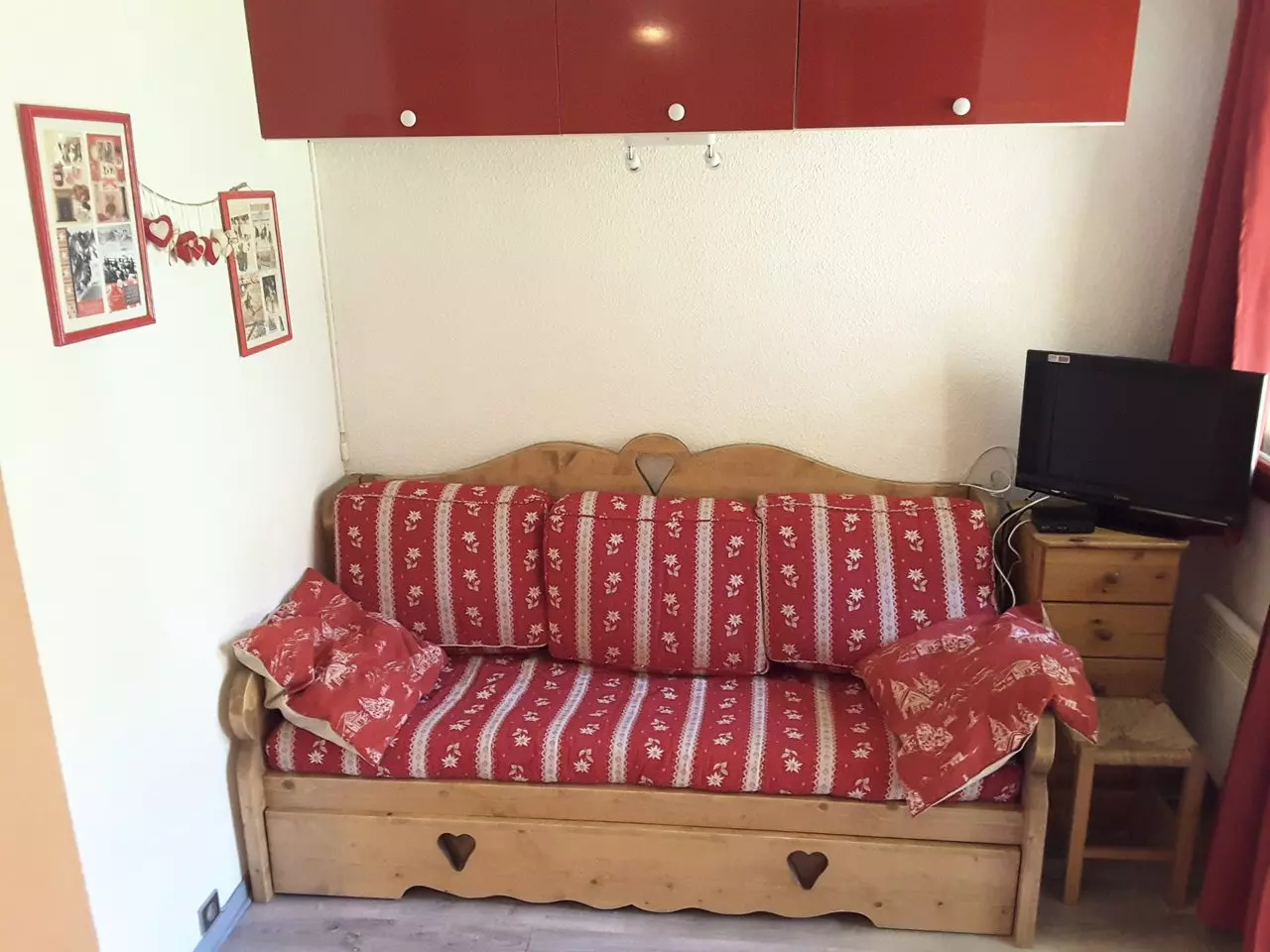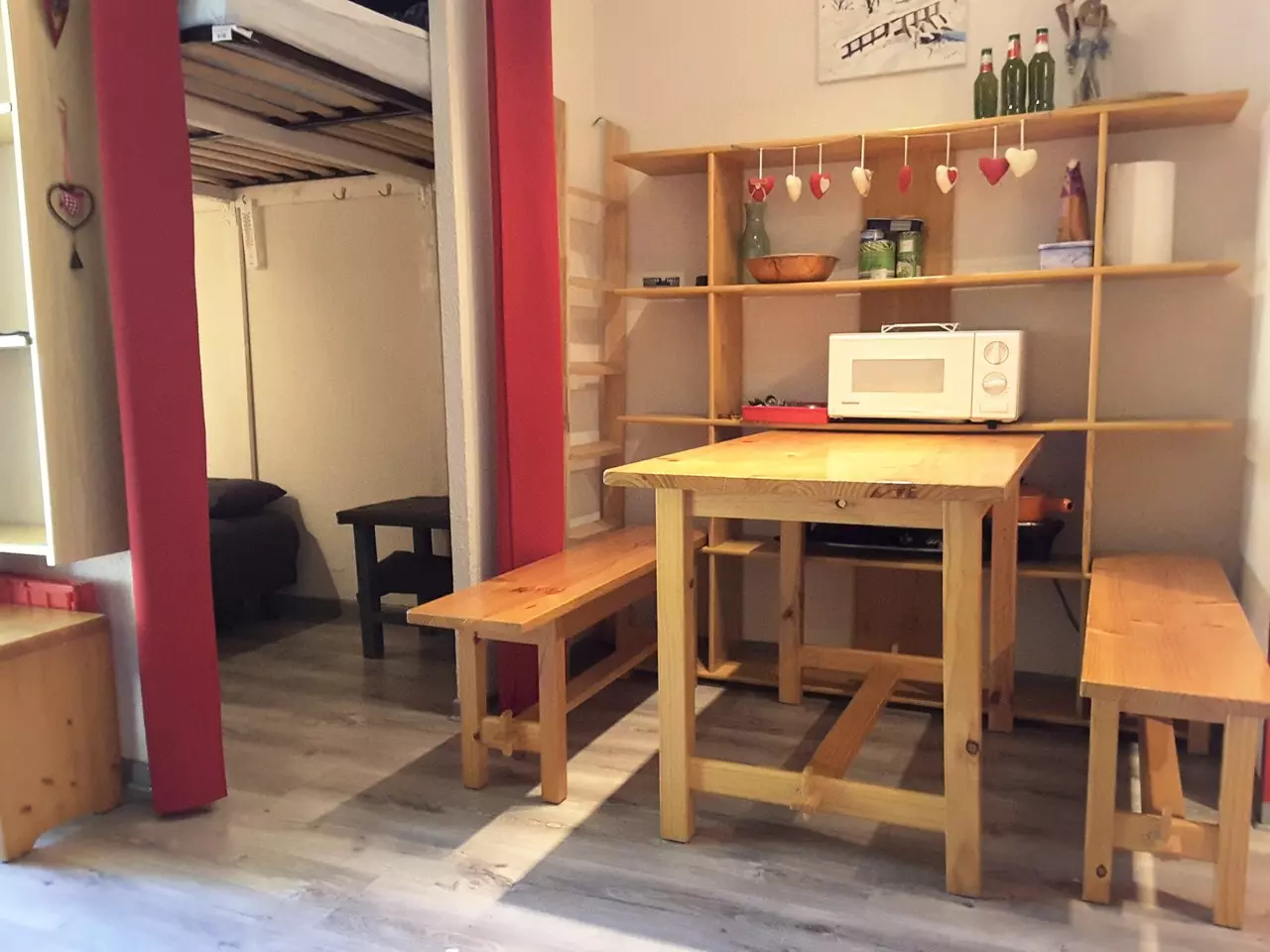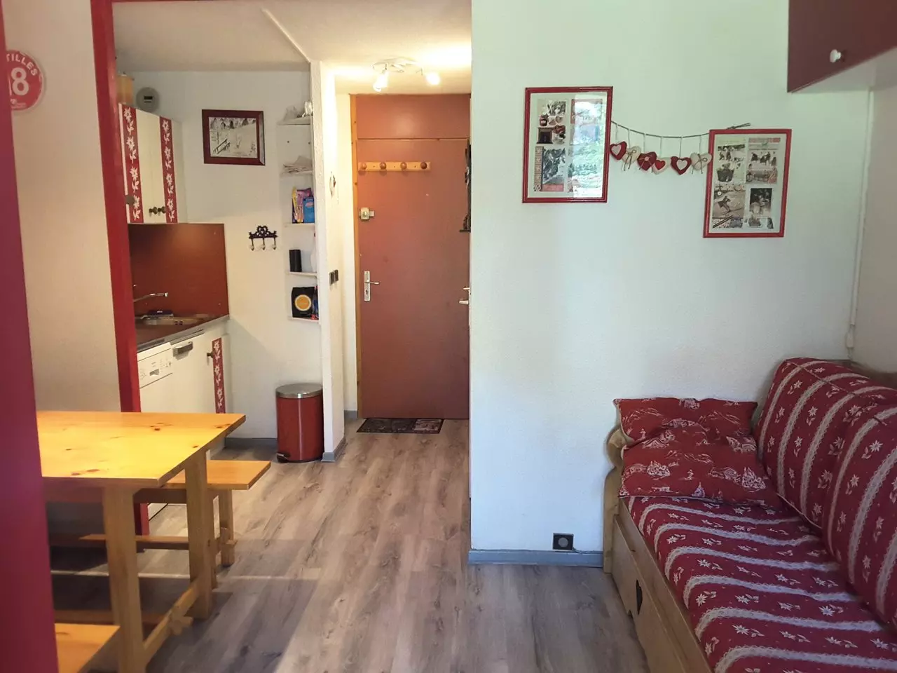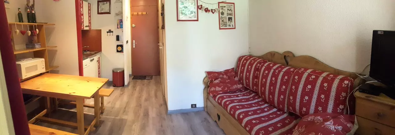 Appartement de 20m² dans une résidence proche des pistes et des commerces. Loué pour 2 adultes et 1 enfant maximum, l'appartement se compose d'une entrée avec rangement, d'un coin nuit avec un convertible (en 120cm) plutôt adapté pour un enfant, d'une salle de bain avec WC séparés, d'un coin cuisine donnant sur un salon équipé d'un ensemble de lits gigognes.