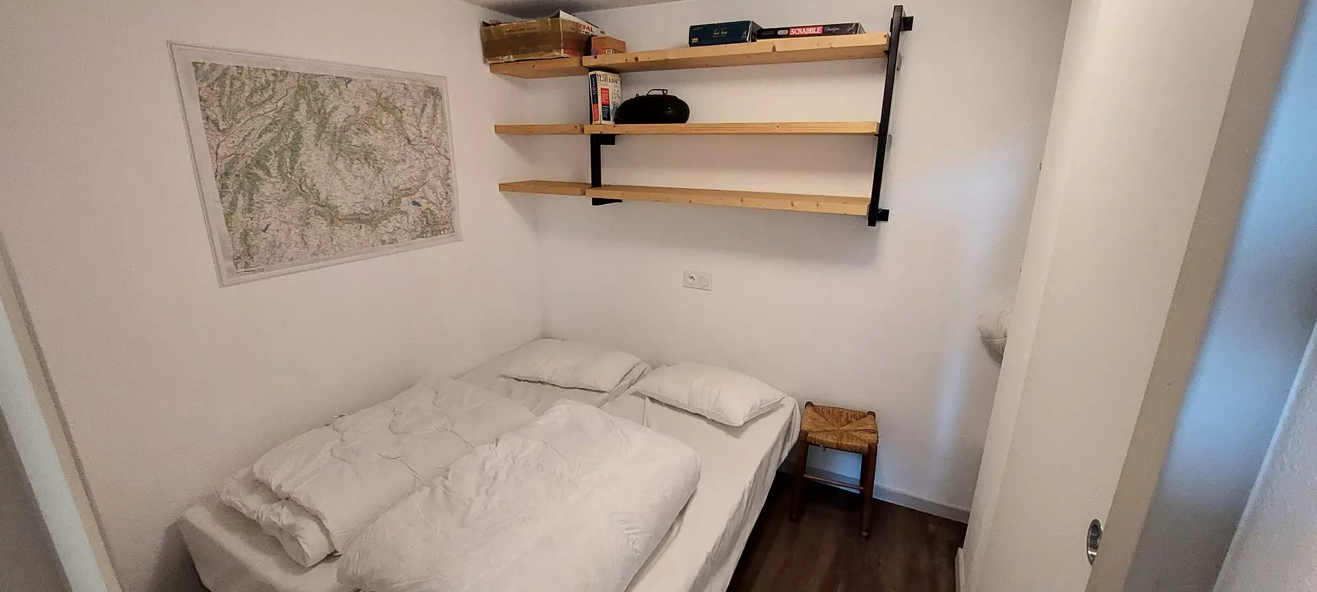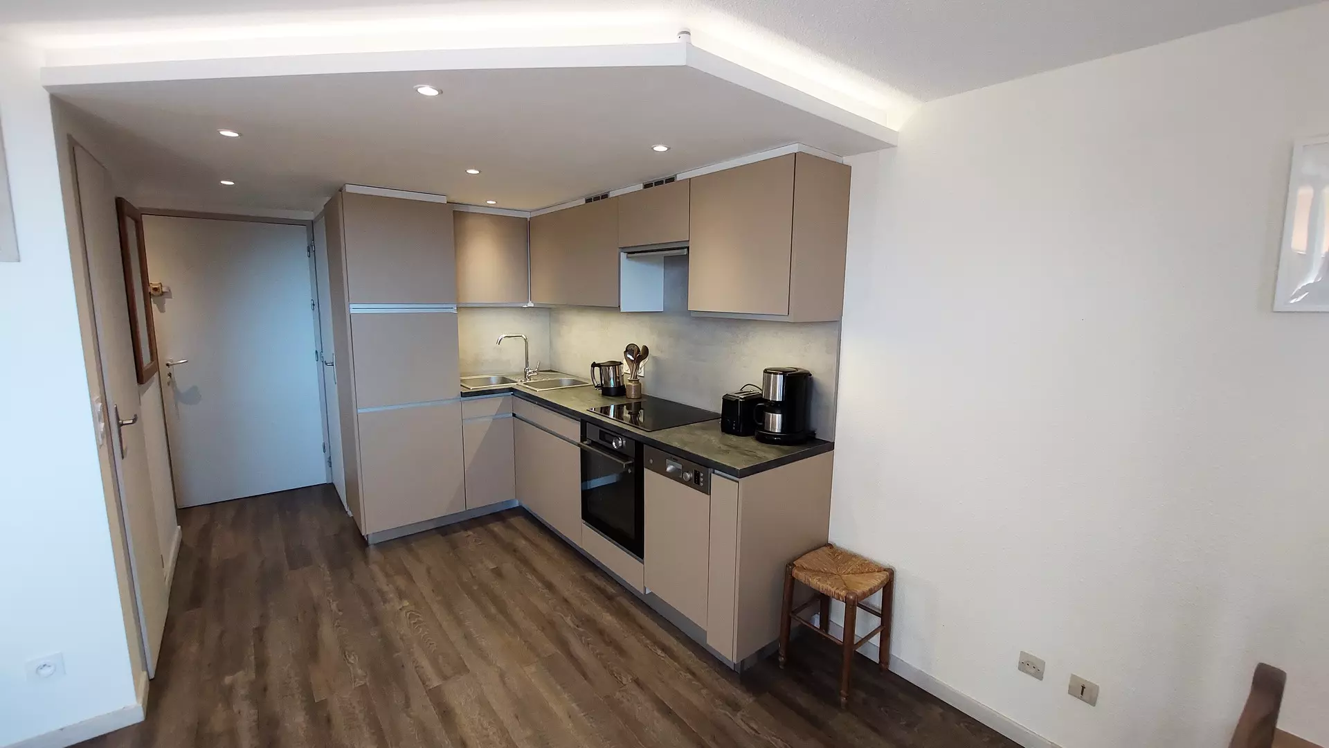 Loué pour 6 personnes, cet appartement est composé d’une chambre équipée d’un lit double avec un accès direct au balcon, d'une deuxième chambre borgne avec 2 lits simples et disposant de sa propre salle de douche, d'une cuisine ouverte donnant sur le séjour avec un canapé convertible, d'une deuxième salle de douche et d'un coin repas.