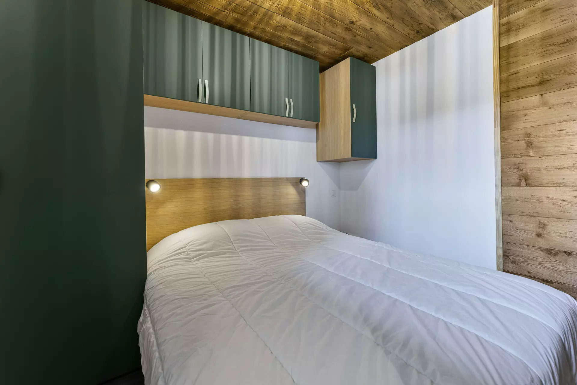 Il se compose d'une entrée avec rangement, une salle à manger - salon avec canapé convertible et télévision, une cuisine équipée avec notamment lave-vaisselle et four, une chambre séparée, un coin nuit, une salle de bain avec douche, WC séparés et un balcon avec salon de jardin.