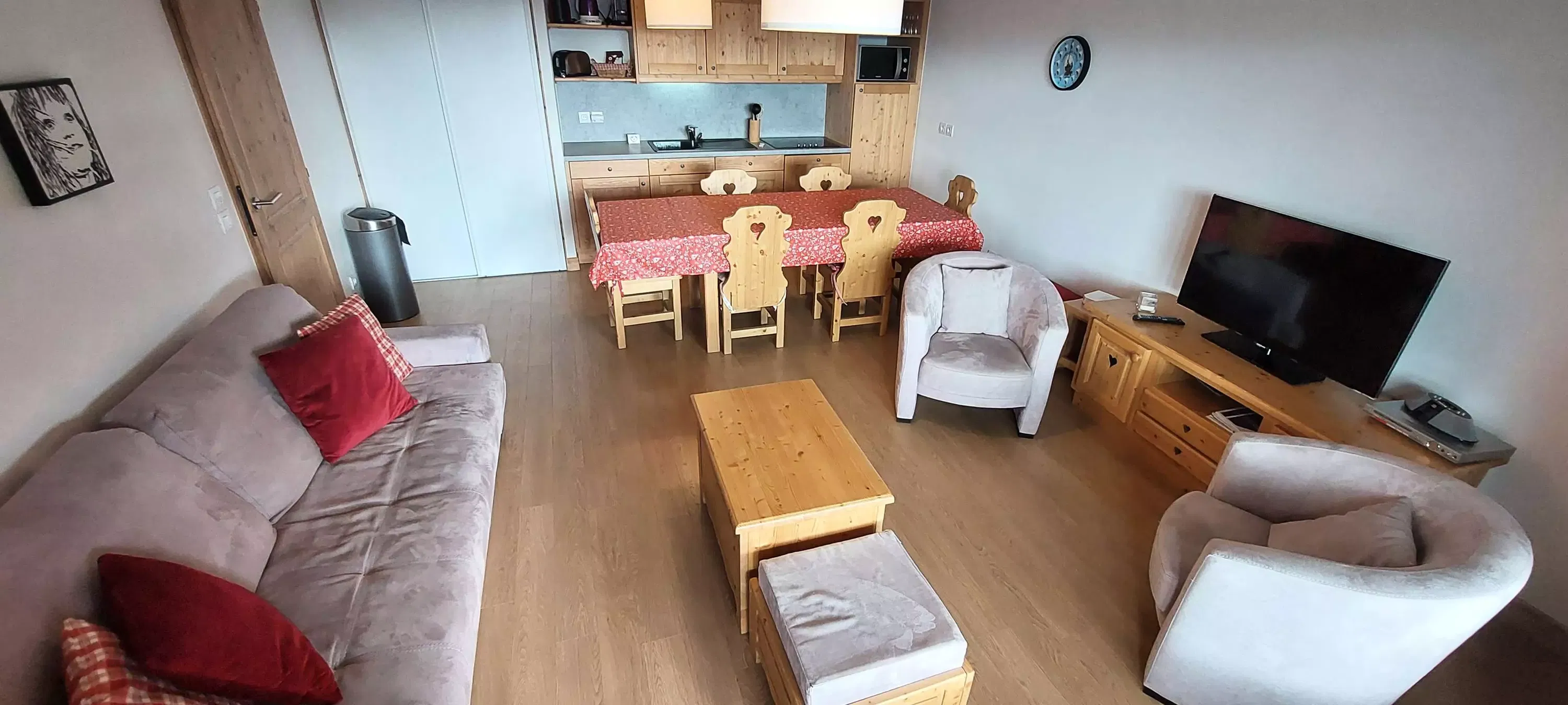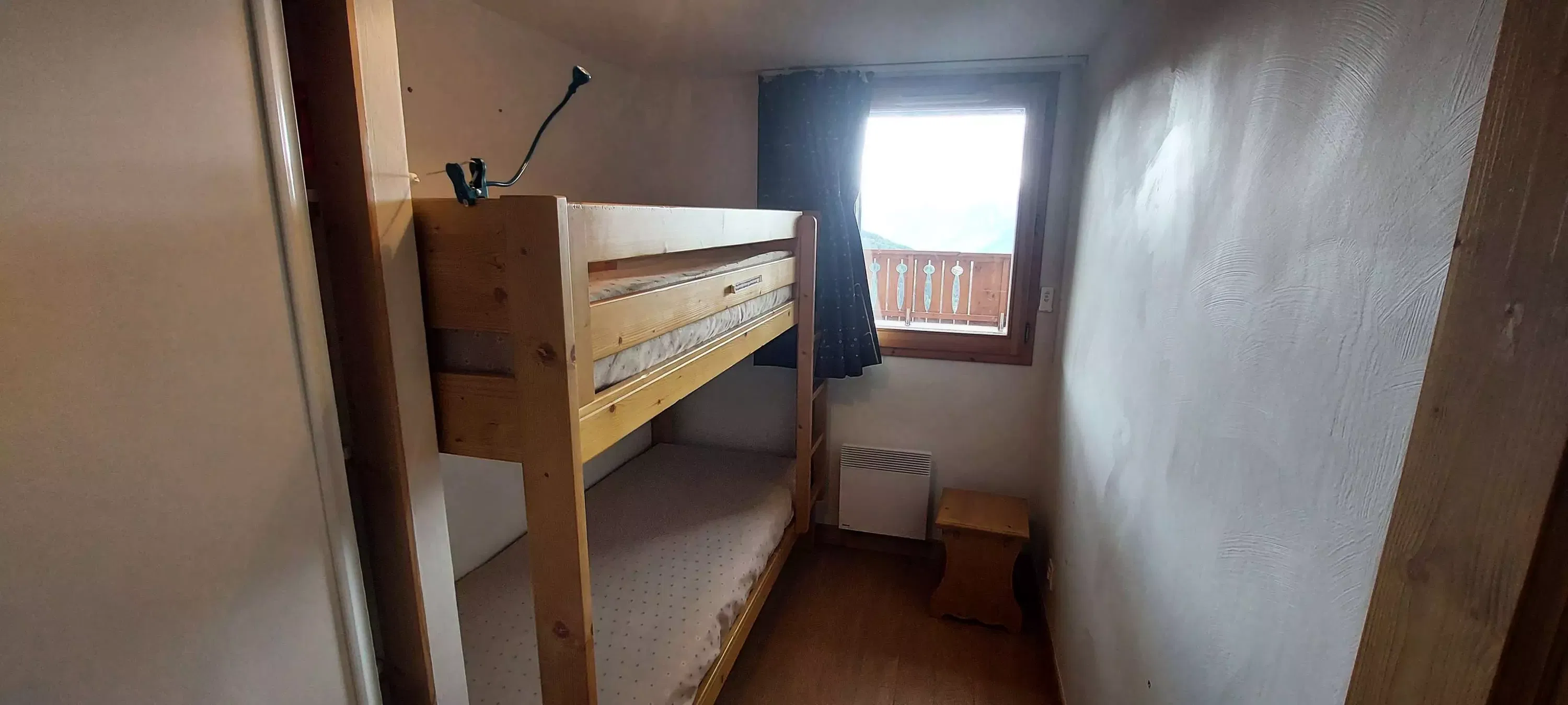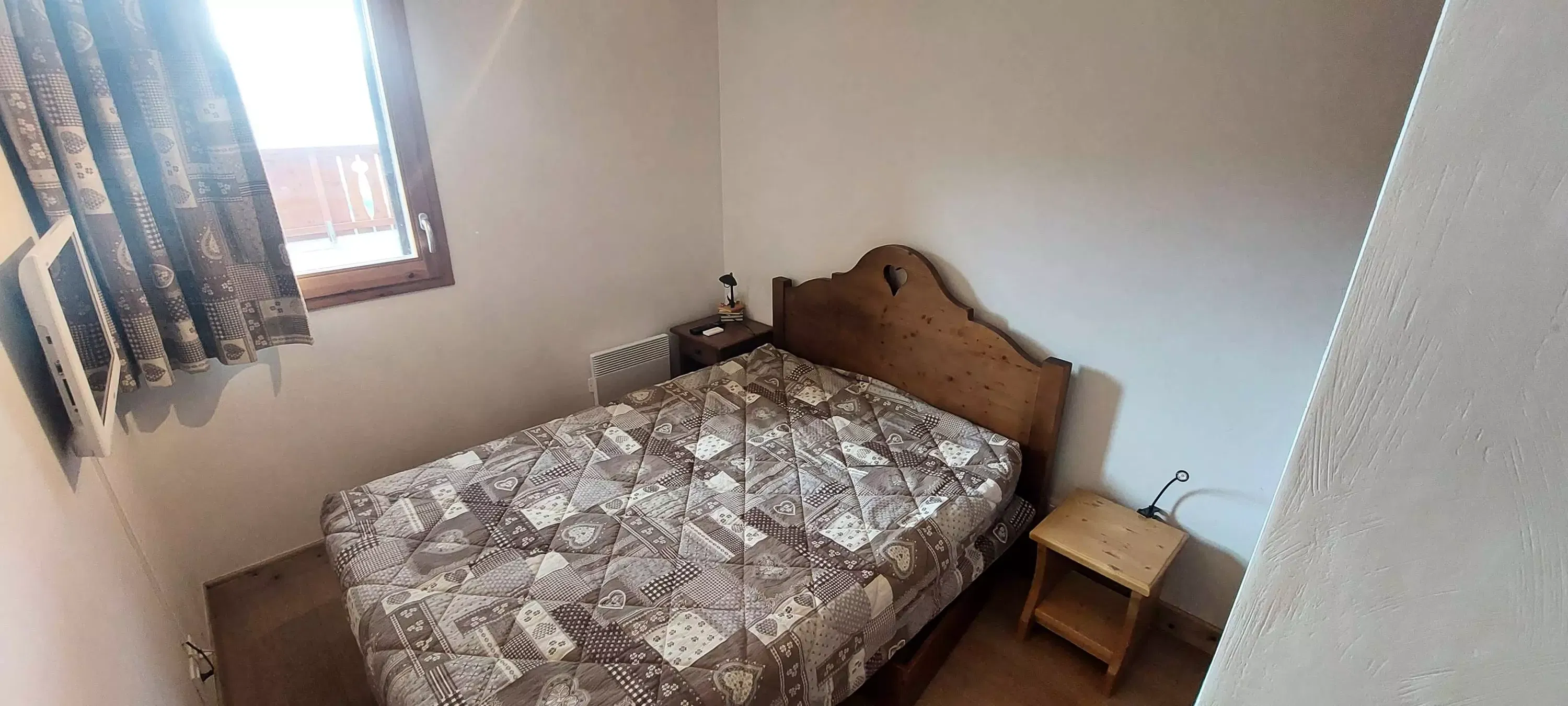 Bel appartement de 70m² composé d'une première chambre avec un ensemble de lits superposés, d'une deuxième avec lit double et d'un coin montagne avec un ensemble de lits superposés, d'une salle de bain avec lave-linge et d'une salle de douche avec WC séparé, d'une cuisine équipée et ouverte sur le séjour disposant d'un canapé convertible pour 2 personnes. Le séjour donne accès à une grande terrasse avec vue sur la vallée