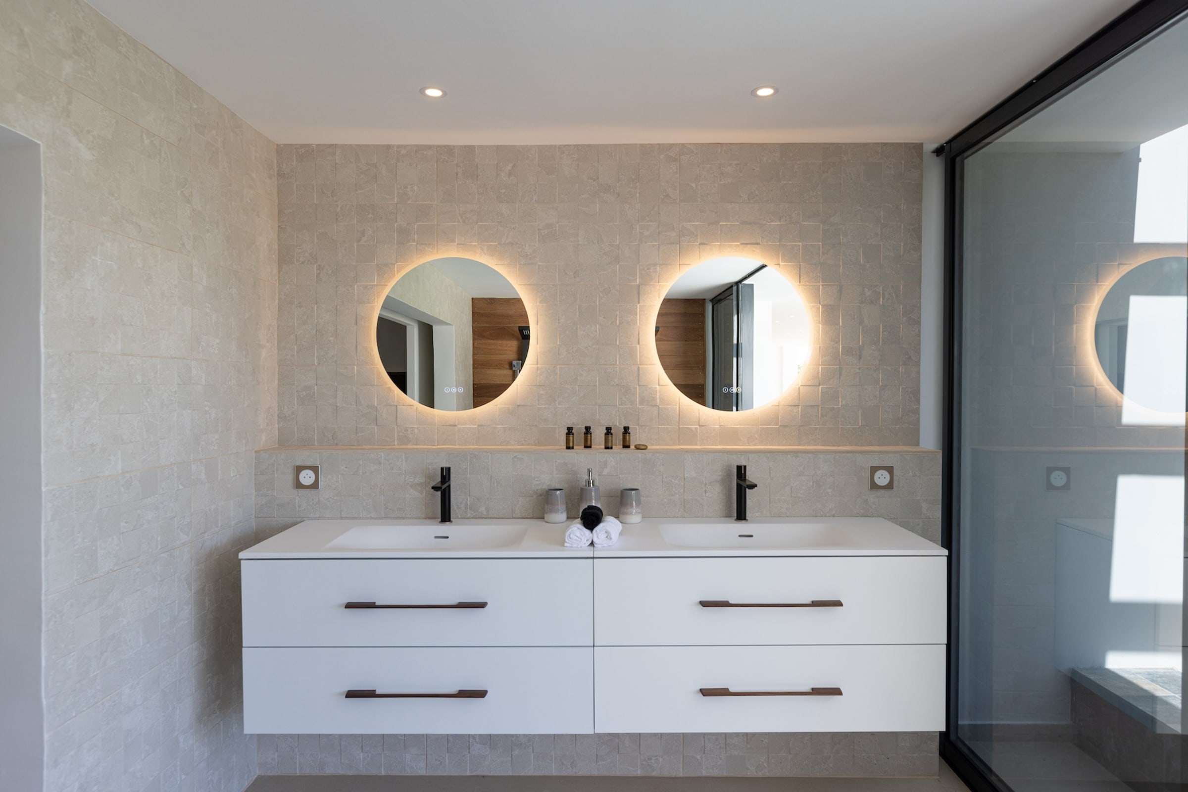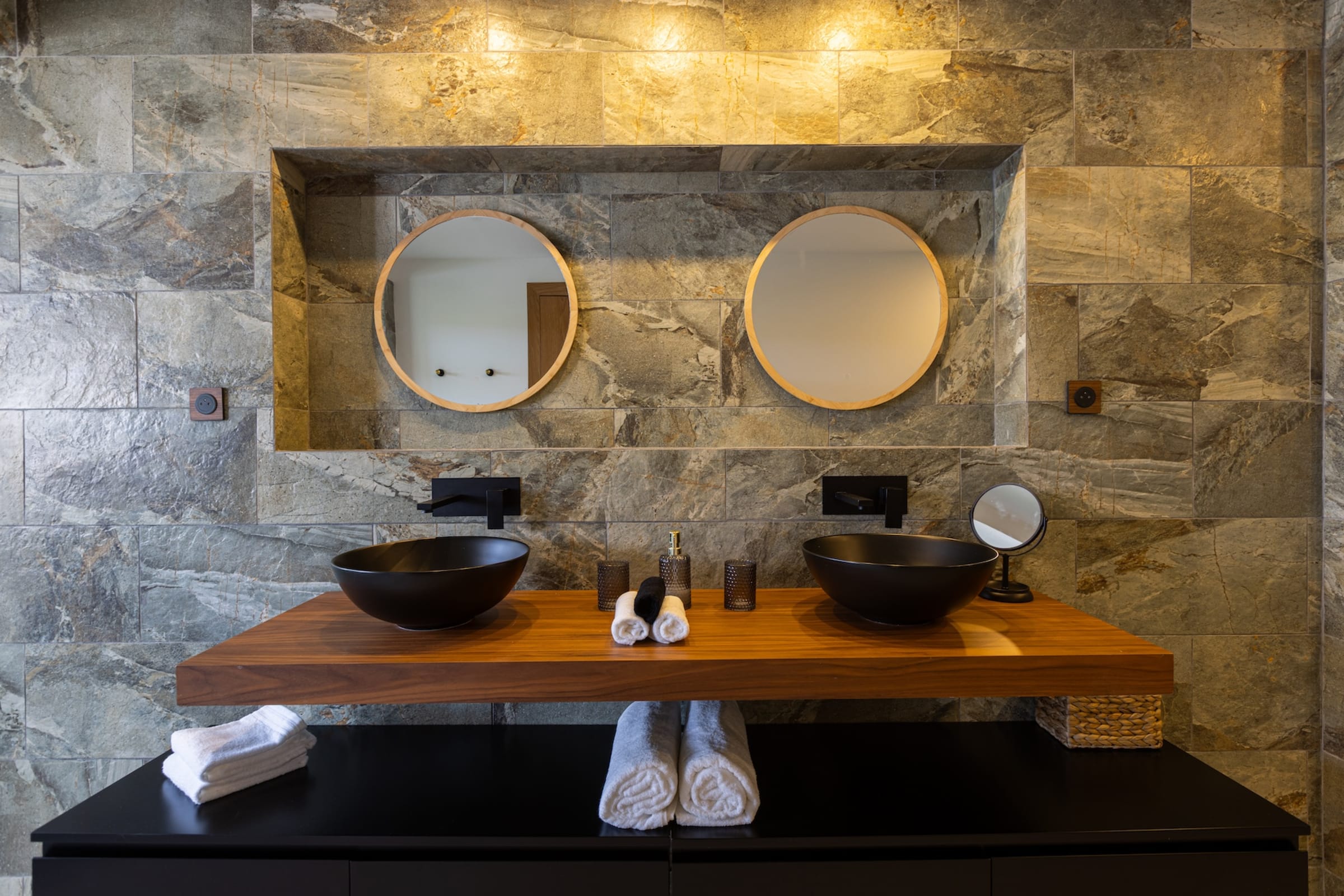 La Villa Nuit Jade propose cinq chambres élégantes, chacune avec sa propre salle de bain privative pour préserver l’intimité de chacun. Quatre chambres se trouvent au niveau principal : deux offrent une vue sur la piscine avec un accès direct à la piscine, tandis que les deux autres, orientées vers le jardin, bénéficient d’une douche extérieure et d’une terrasse privée pour un instant de sérénité absolue. La cinquième chambre est un studio indépendant accessible par l’extérieur. Véritable cocon exclusif, il comprend un salon, une cuisine équipée, une chambre avec salle de bain et dressing. Son lit est composé de twin beds pouvant être séparés selon vos besoins. Ce studio s’ouvre sur une terrasse privative avec transats, parasols et un jacuzzi, parfait pour des moments de relaxation en toute intimité.