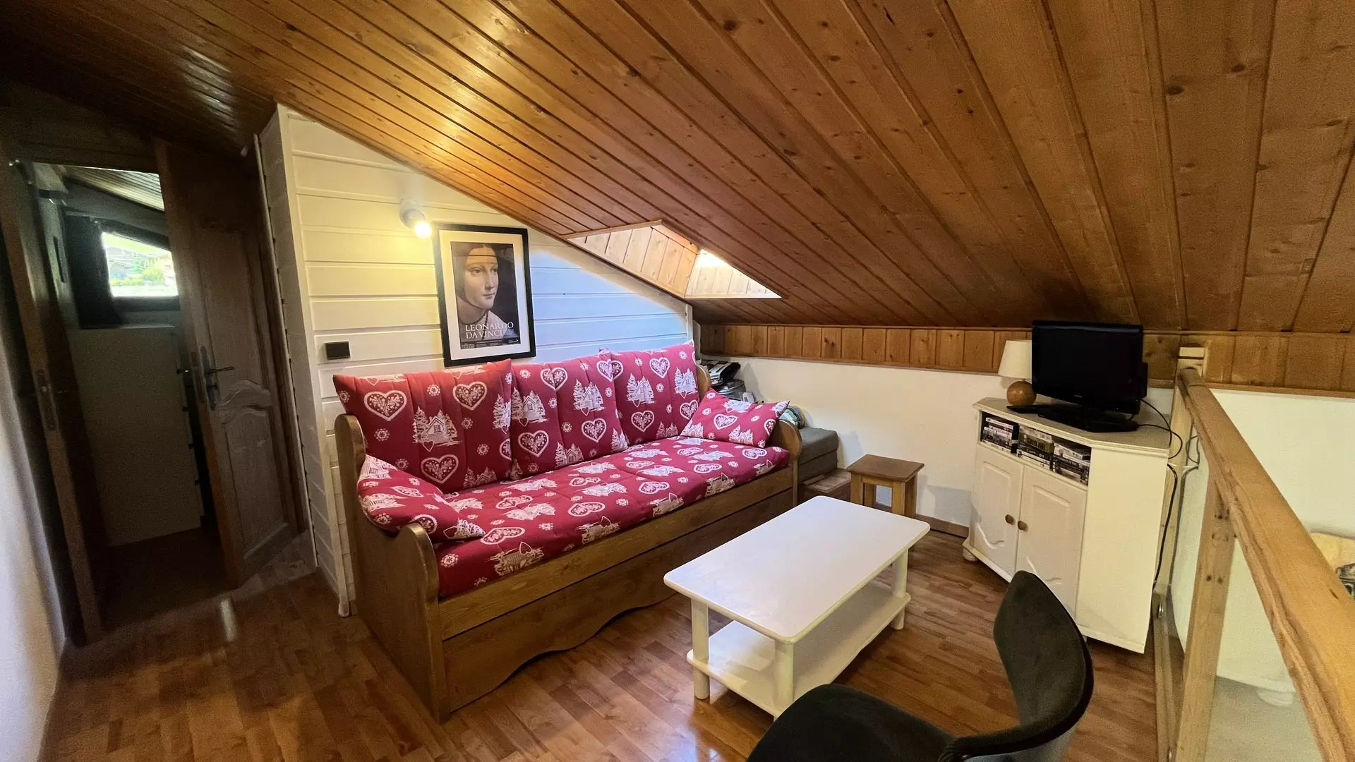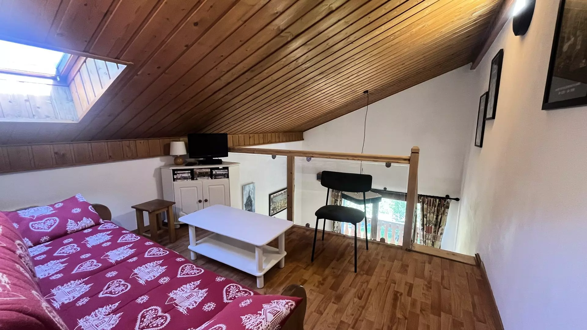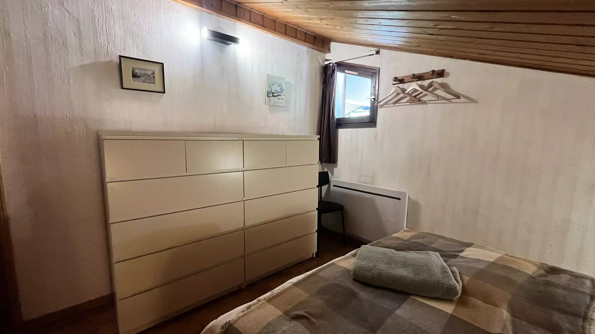 À l’entrée, vous trouverez un coin montagne avec 2 lits superposés. La chambre du rez-de-chaussée dispose d’un lit double, tout comme la chambre à l’étage. Un canapé clic-clac est installé dans la mezzanine.