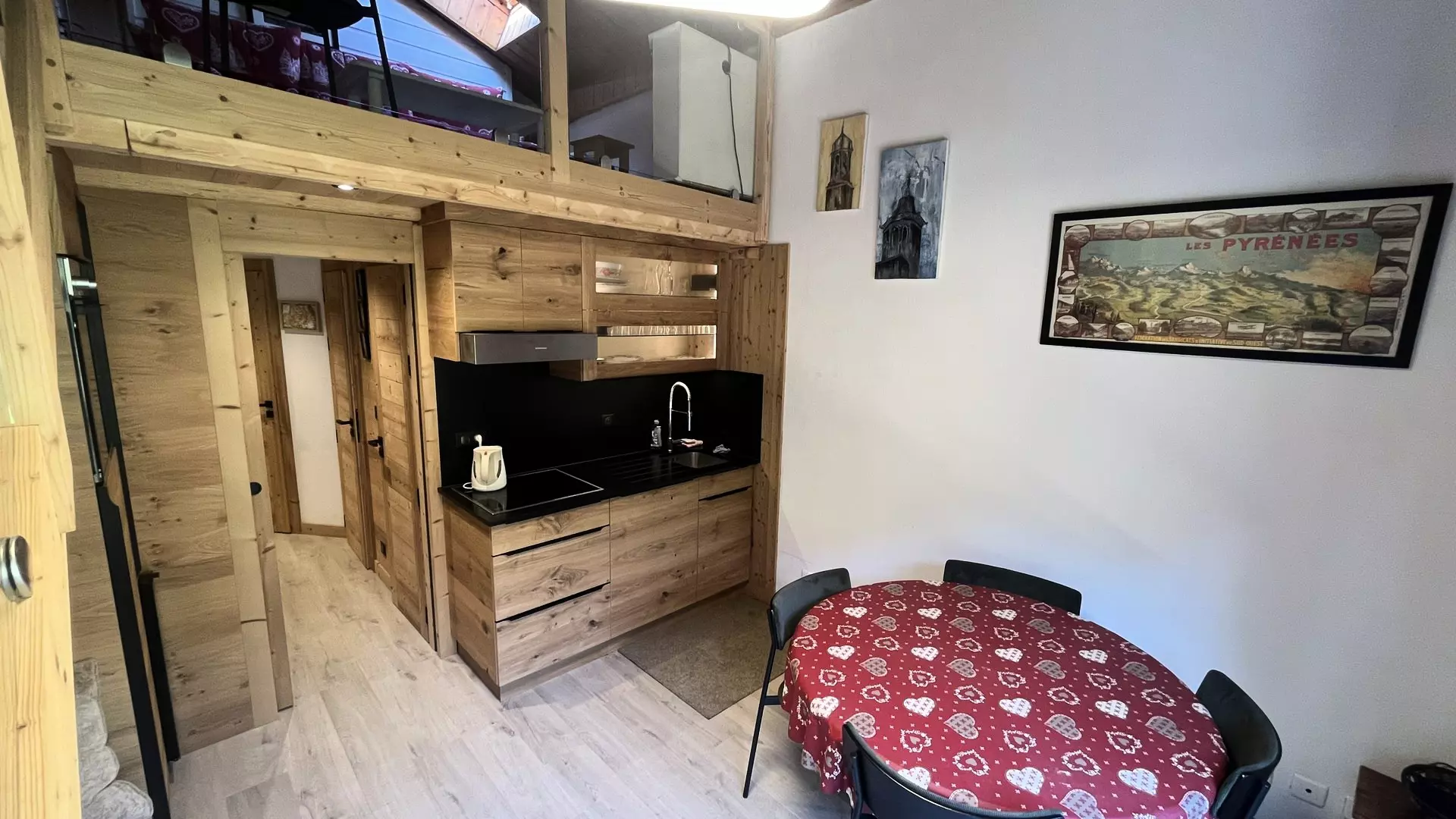 La cuisine est équipée d’une plaque de cuisson, d’un four, d’une cafetière à filtre, d’une bouilloire et d’un appareil à raclette.