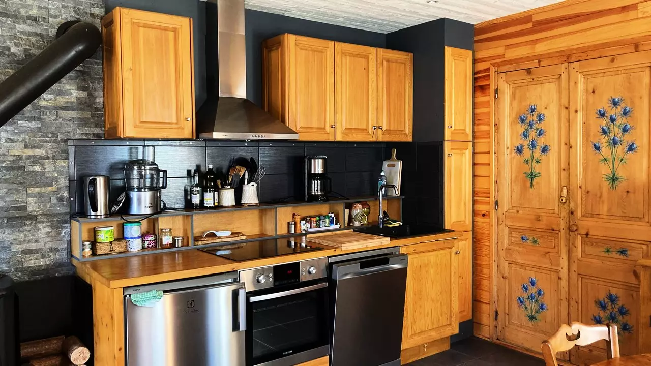 Ce cocon douillet, réparti sur trois niveaux, peut accueillir jusqu’à cinq personnes. Il dispose de deux chambres confortables, d’un séjour chaleureux agrémenté d’un poêle à bois, d’une cuisine entièrement équipée, d’une salle de douche et de deux WC. L’entrée se fait directement par le rez-de-chaussée, et une petite place de parking est disponible devant la maison. Son ambiance boisée et sa décoration soignée en font un véritable refuge après une journée en plein air.