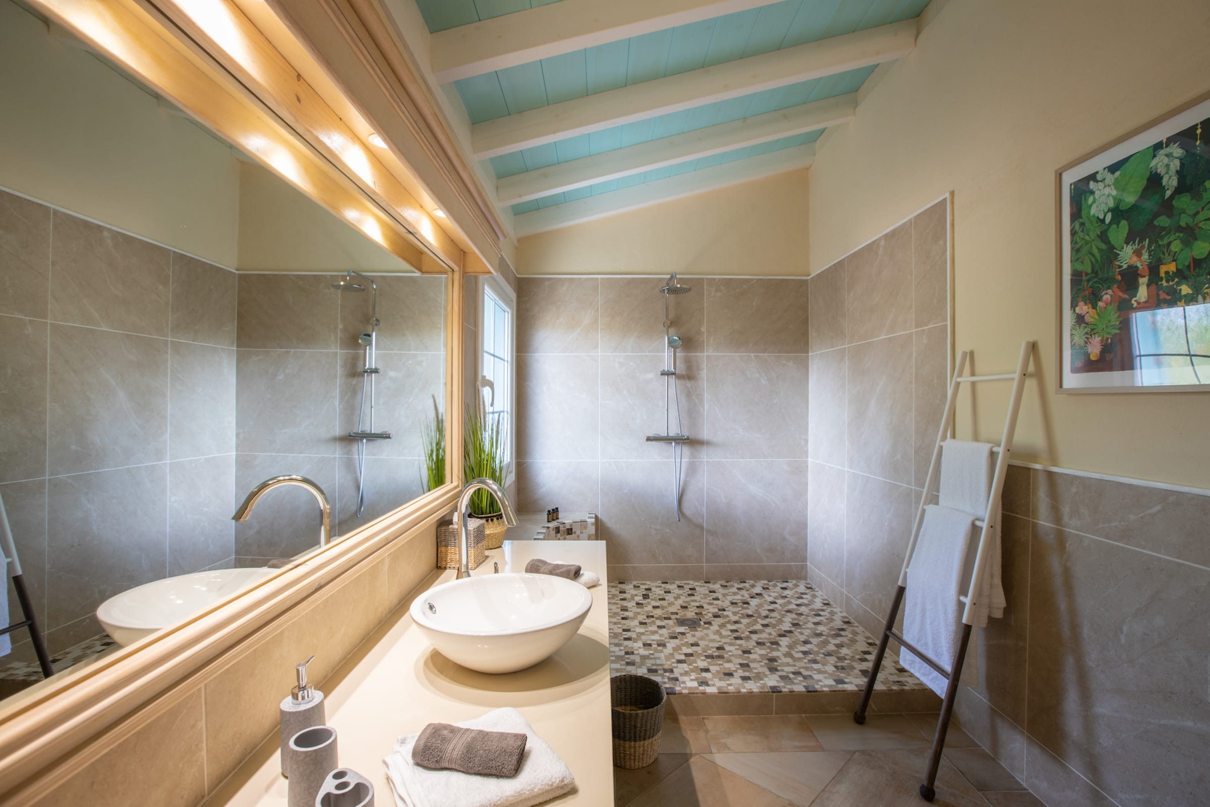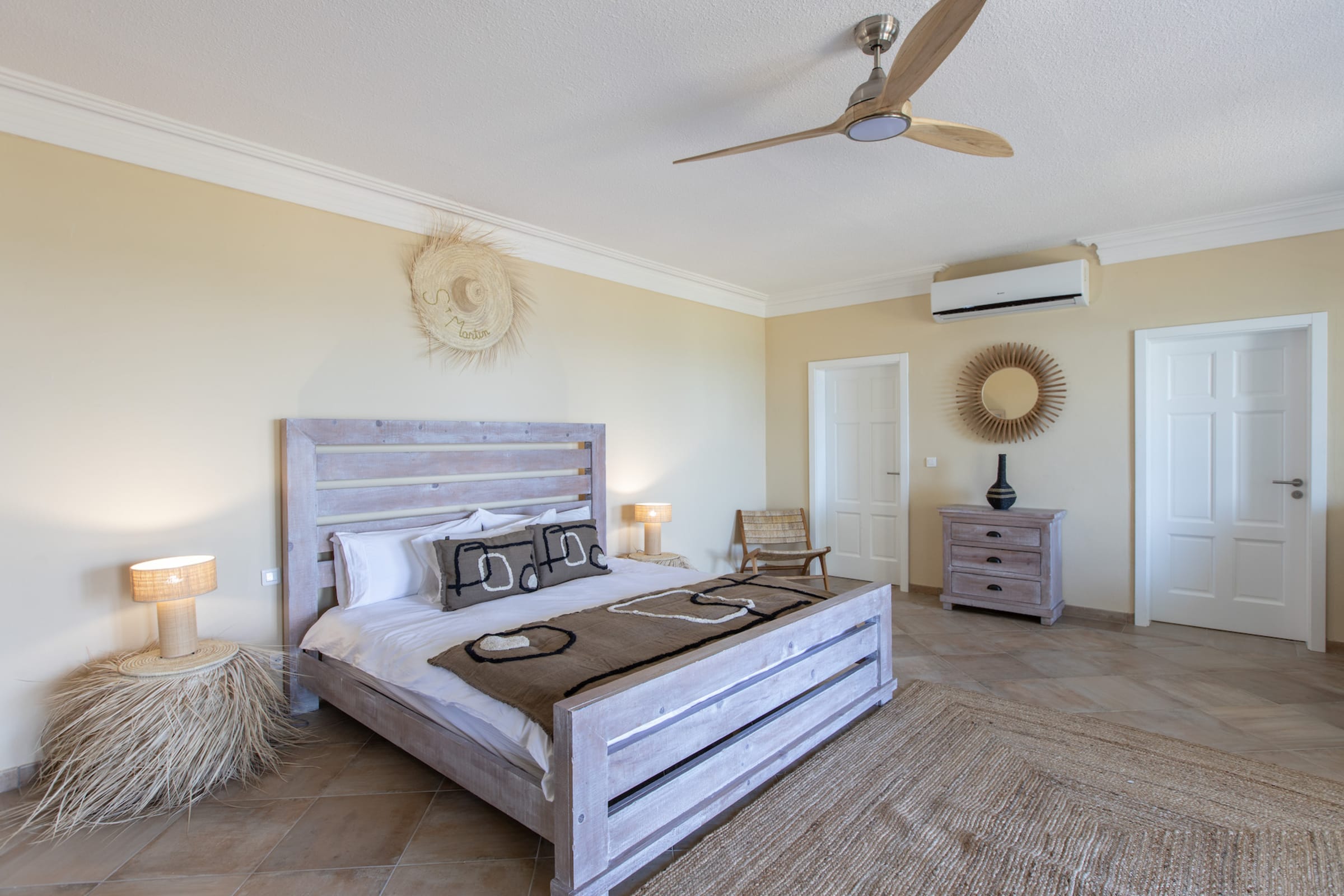 À l'intérieur de la villa, les clients trouveront un espace de vie spacieux et élégamment décoré, avec une atmosphère accueillante grâce à un décor et un mobilier aux couleurs chaudes, et des équipements modernes. La villa comprend quatre chambres, chacune avec sa propre salle de bains, ce qui offre beaucoup d'intimité et de confort aux clients. Les chambres sont climatisées et disposent d'une literie et de draps de qualité, garantissant un sommeil réparateur. Trois des chambres, dont la principale, sont situées au niveau principal et donnent accès à la piscine et à la terrasse. La quatrième chambre se trouve au niveau inférieur, accessible depuis l'extérieur, et offre un peu plus d'intimité. C'est l'option idéale pour ceux qui préfèrent être un peu plus à l'écart des espaces de vie principaux de la villa.
