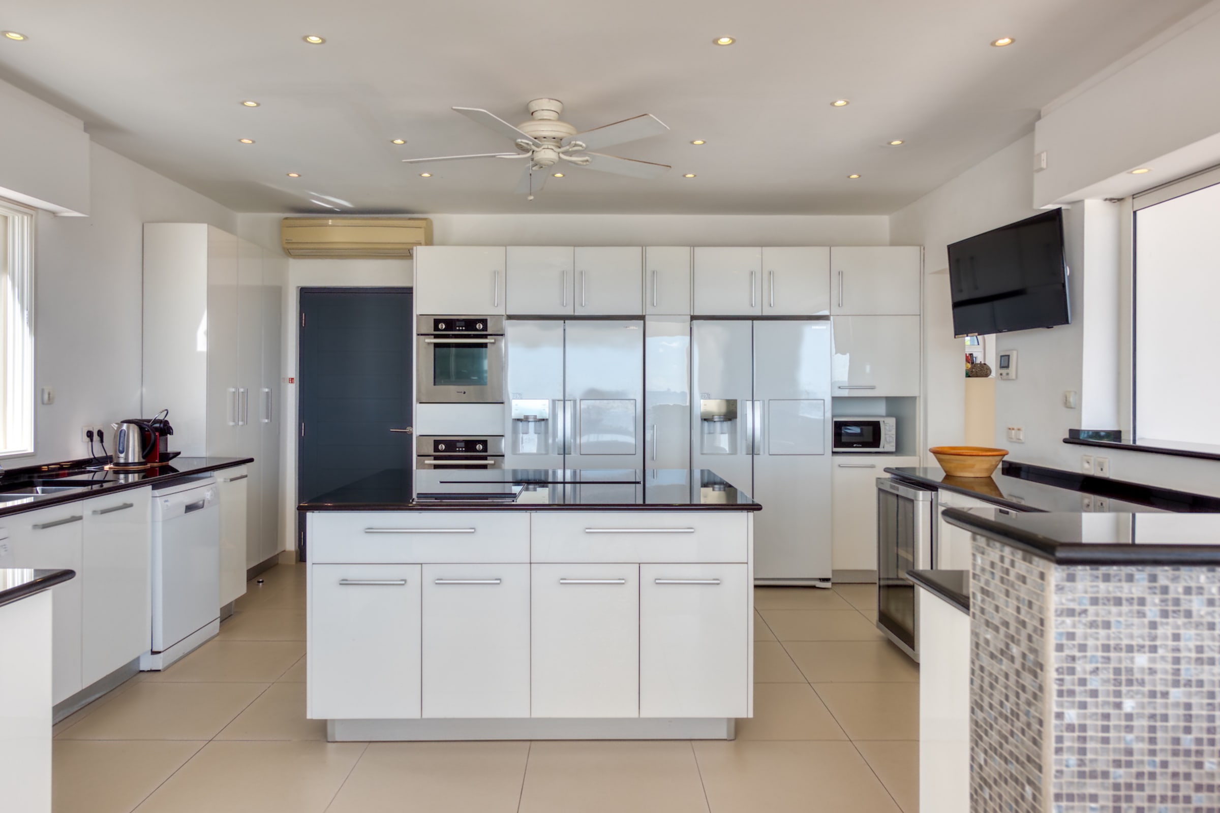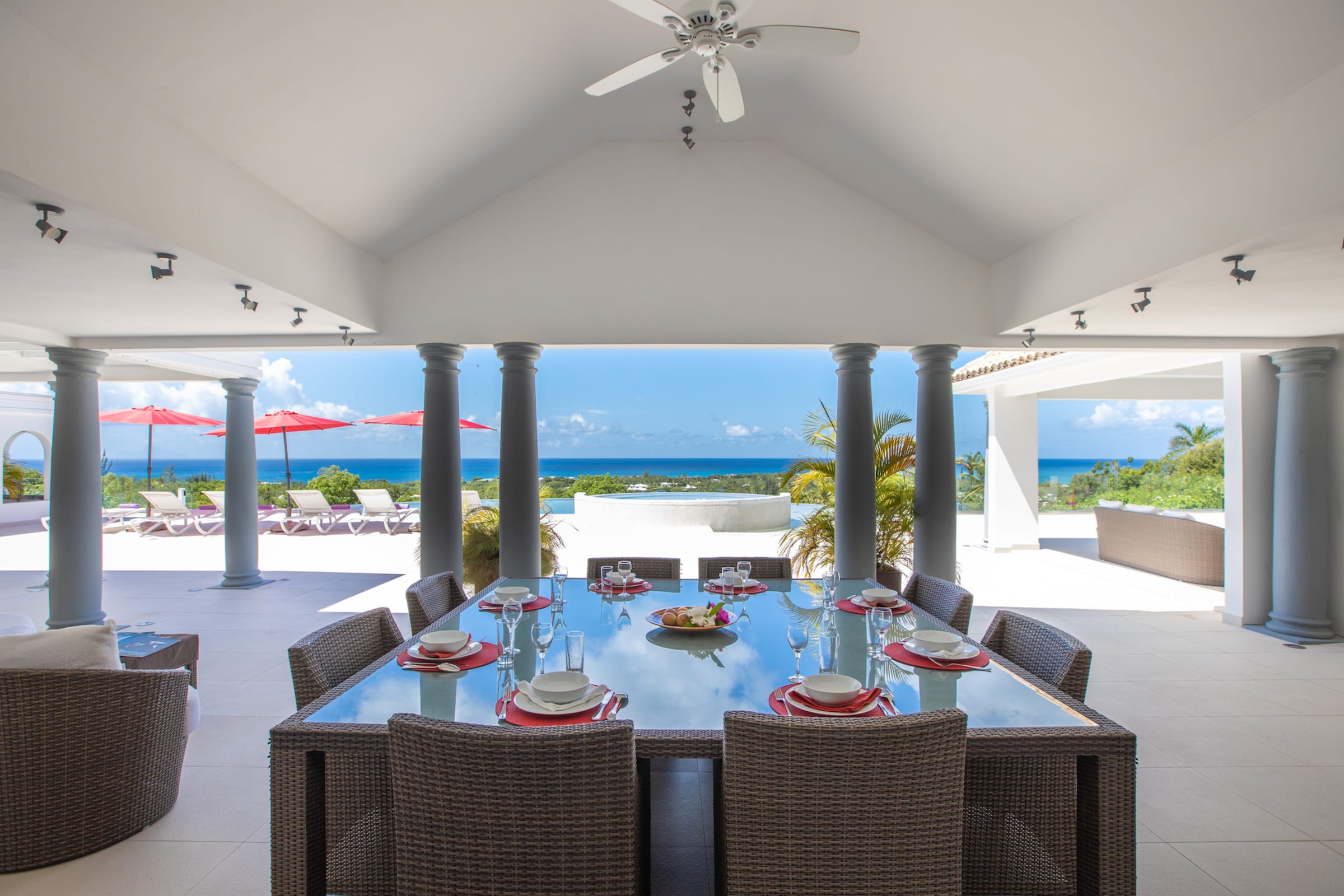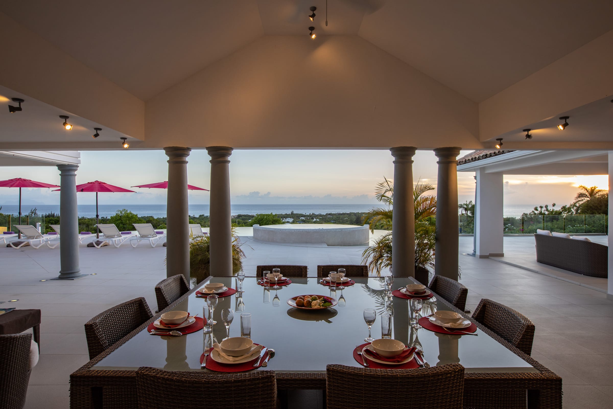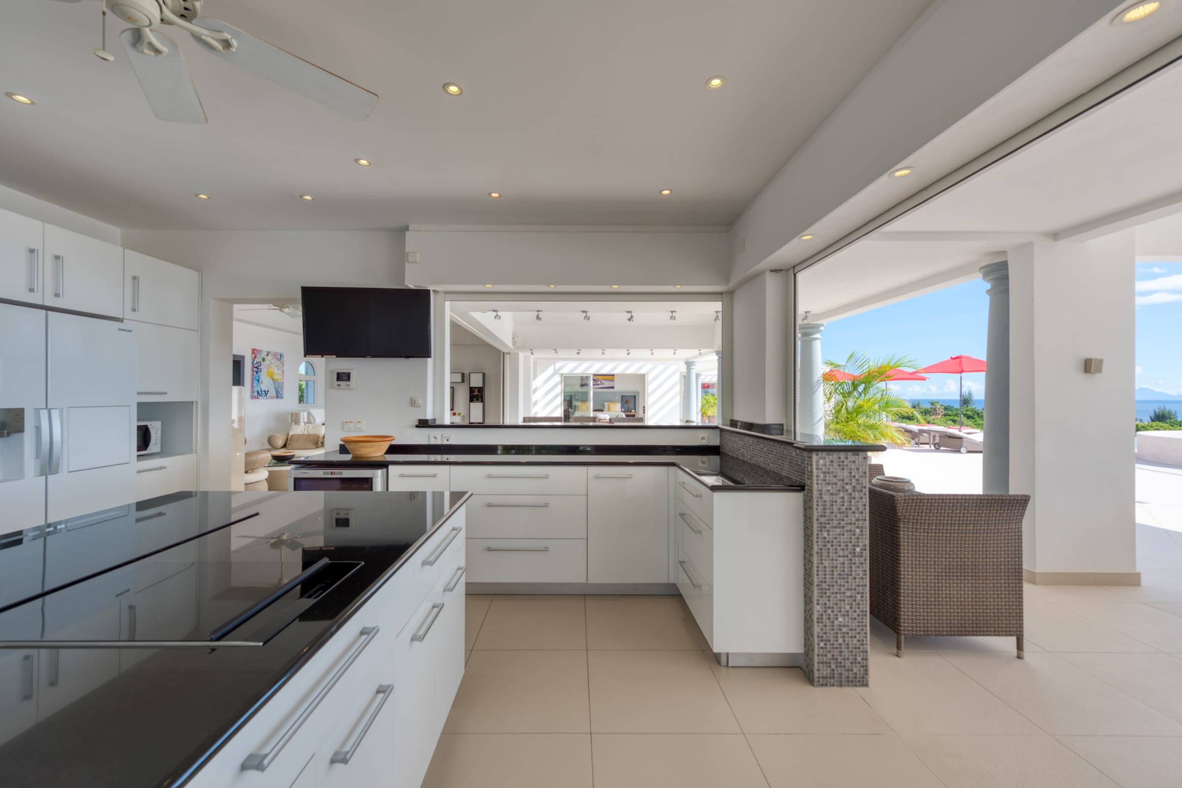 Les espaces de restauration et de détente sont stratégiquement positionnés pour observer la vue. La superbe piscine à débordement s'enroule comme une coquille de nautile dans un bassin à débordement.Une cuisine équipée moderne s'ouvre sur la vue, reliant le chef aux invités.