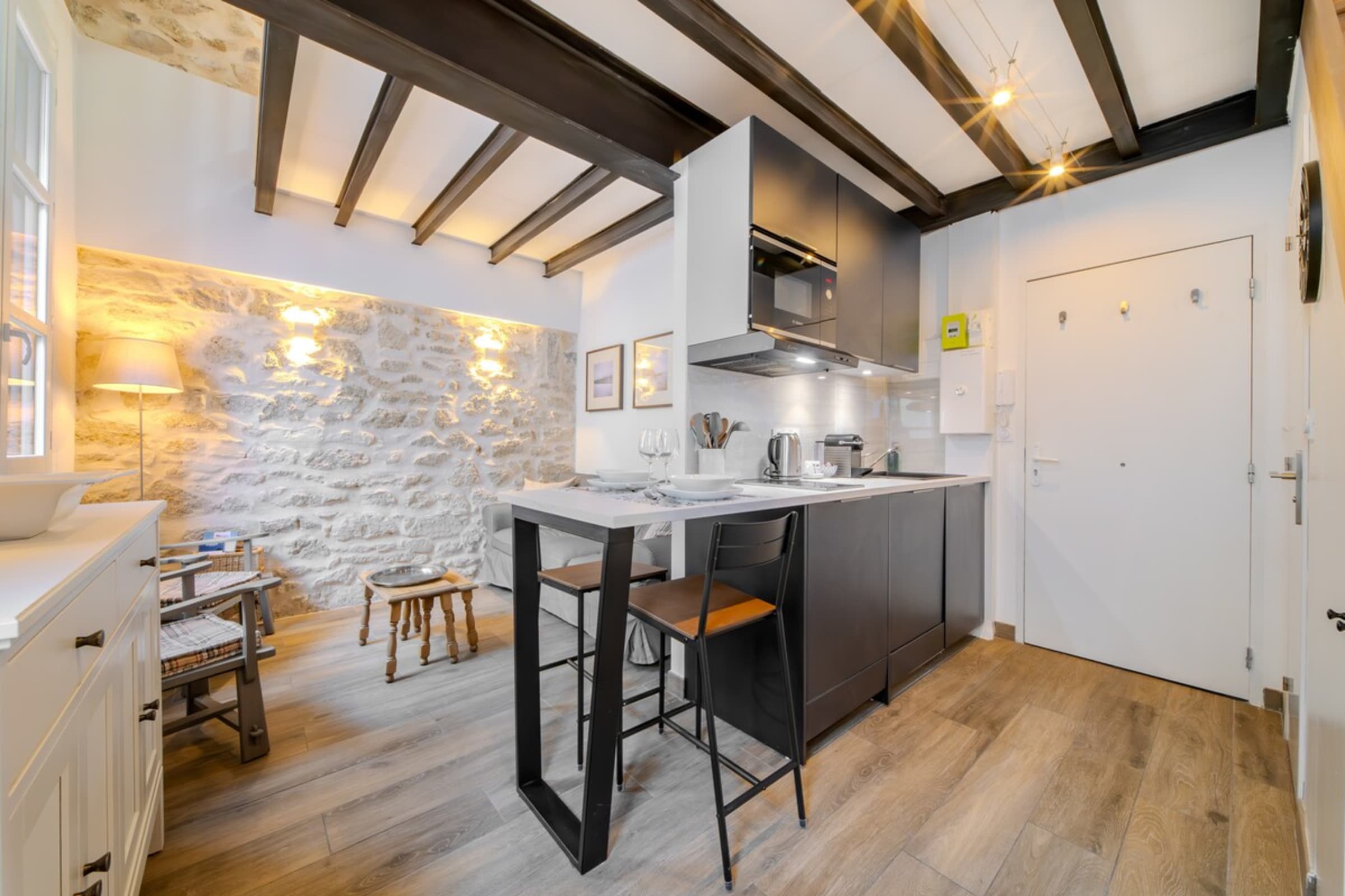 Vous trouverez un espace de vie lumineux comprenant une cuisine équipée ouverte sur un salon confortable. À l'étage, la chambre avec lit double (160x190) et smart TV face au lit vous offre un espace intime et relaxant. La salle d'eau attenante, moderne et fonctionnelle, complète ce loft idéal pour un séjour agréable. Le logement est totalement climatisé.