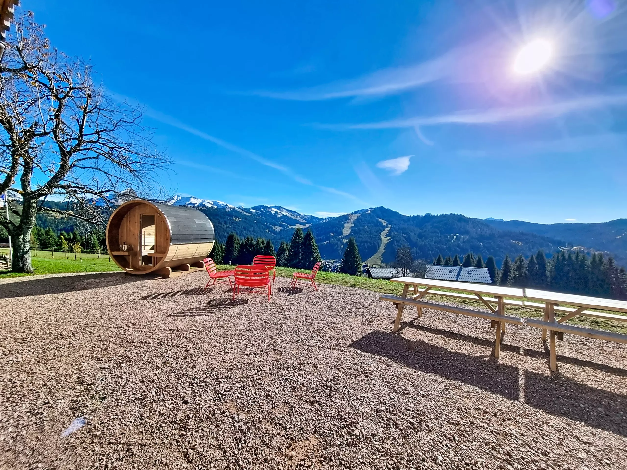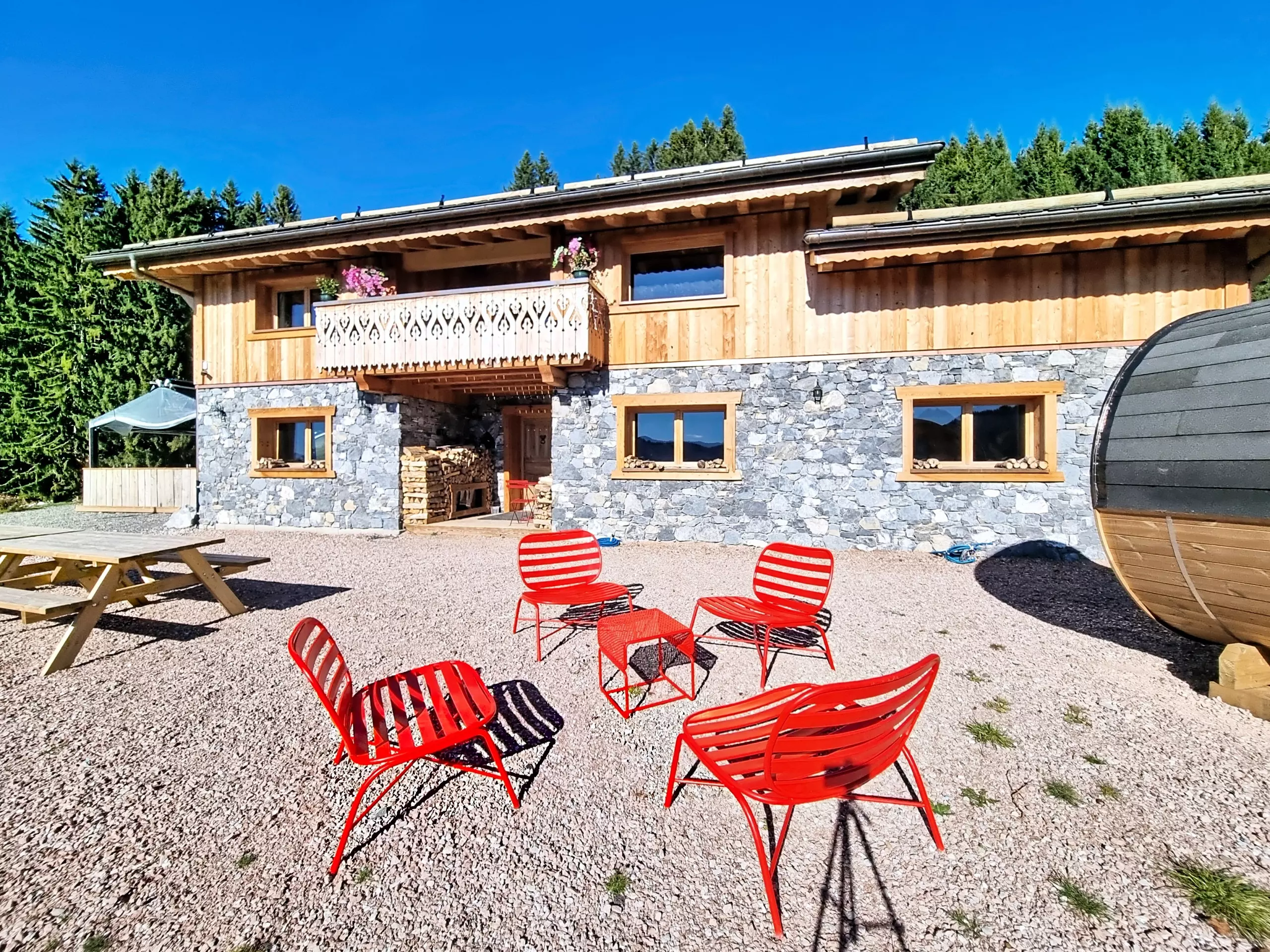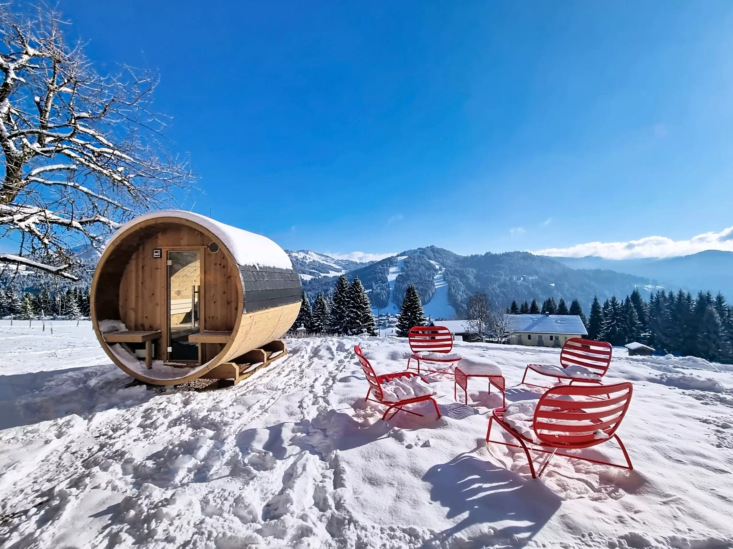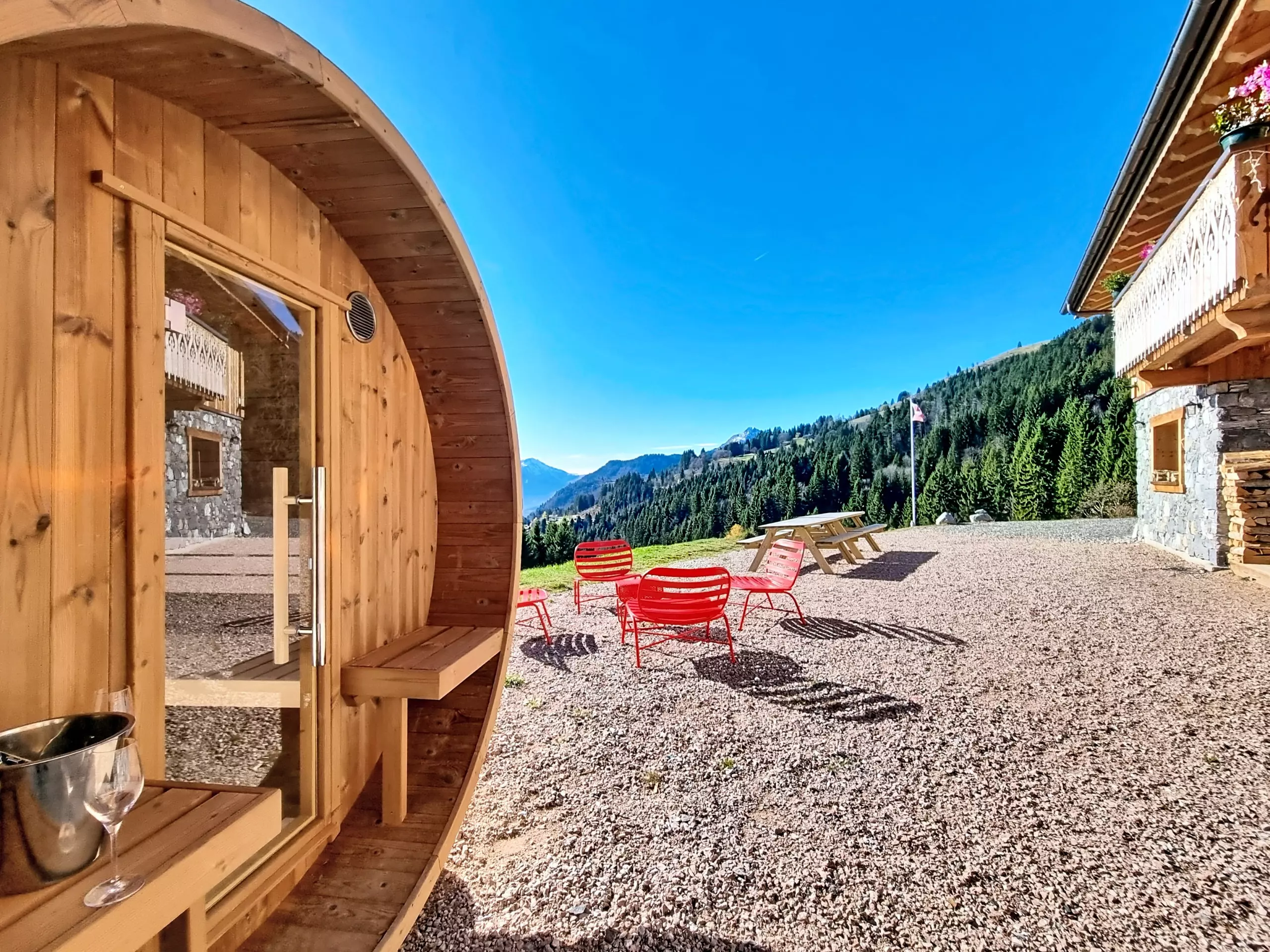 Construit en bois et en pierre, le chalet offre une ambiance cosy et typiquement alpine, parfaite pour se retrouver en famille ou entre amis après une journée sur les pistes. Pour prolonger ces moments de détente, vous pourrez également profiter d’un sauna tonneau extérieur, pouvant accueillir jusqu’à 6 personnes, installé au cœur du jardin pour une expérience bien-être unique face aux montagnes.