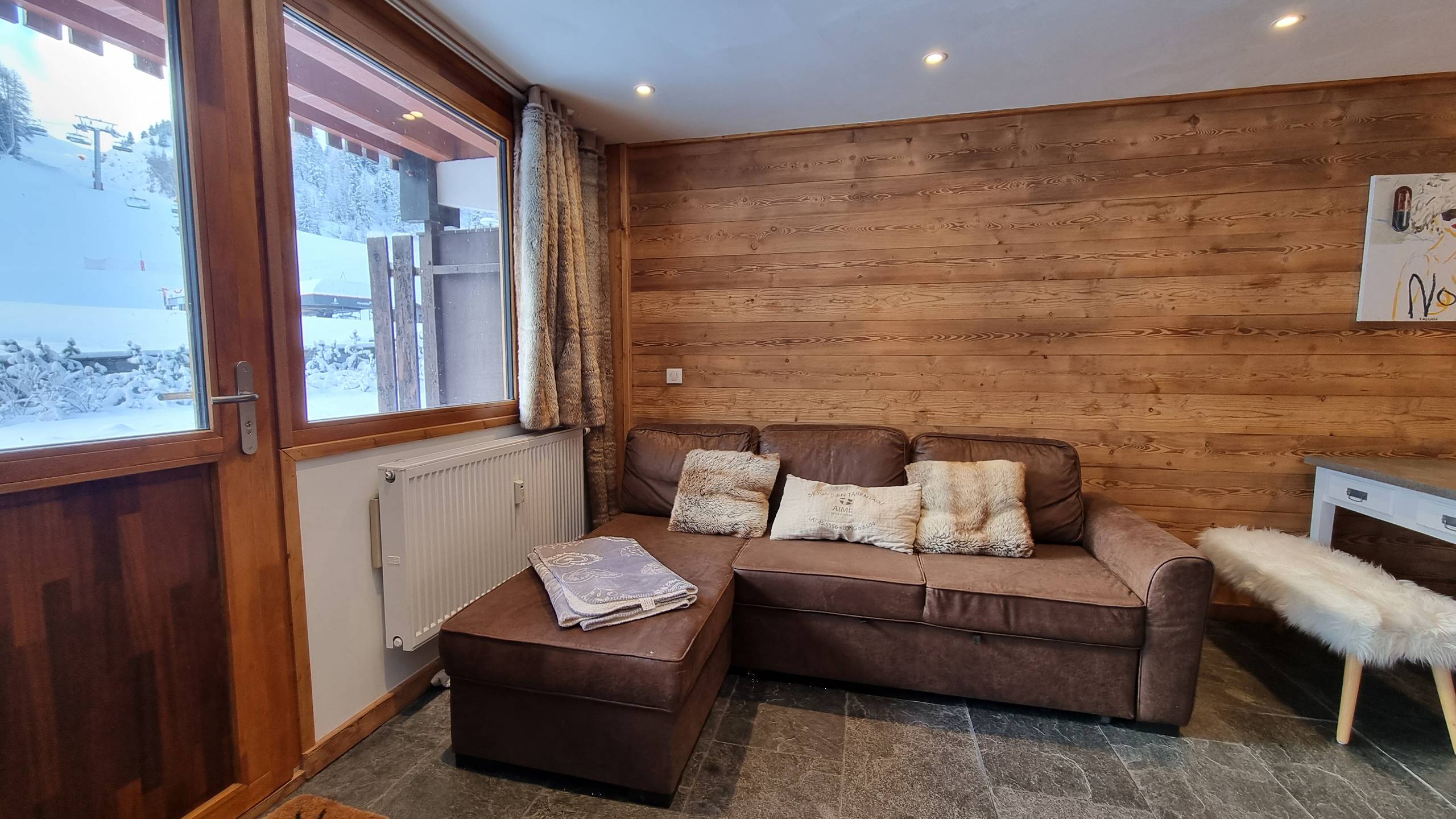 PLAGNE CENTRE – Résidence Makalu. Grand studio cabine, entièrement rénové, exposé plein Sud, avec terrasse et vue sur le front de neige. La résidence vous offre un accès direct aux commerces par une galerie intérieure. Départs et retour skis aux pieds !