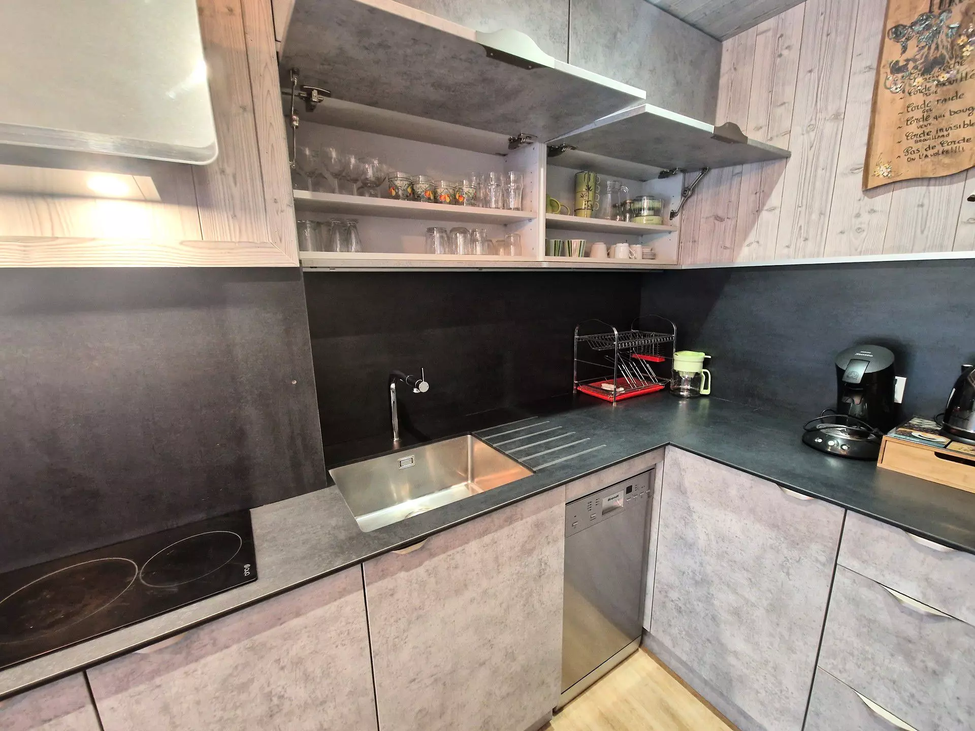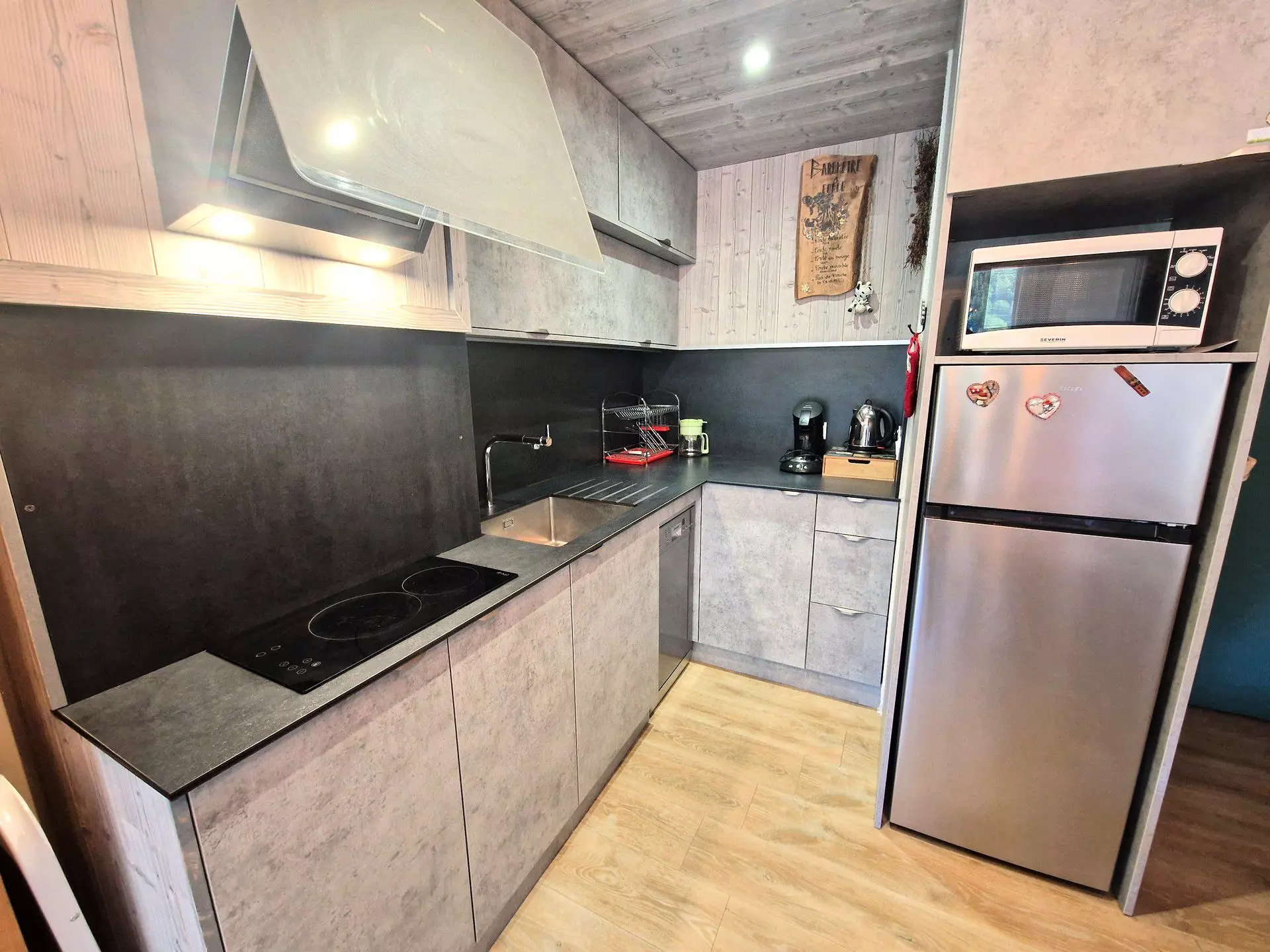 - Coin cuisine avec 2 plaques chauffantes, réfrigérateur, four micro-ondes, lave-vaisselle.