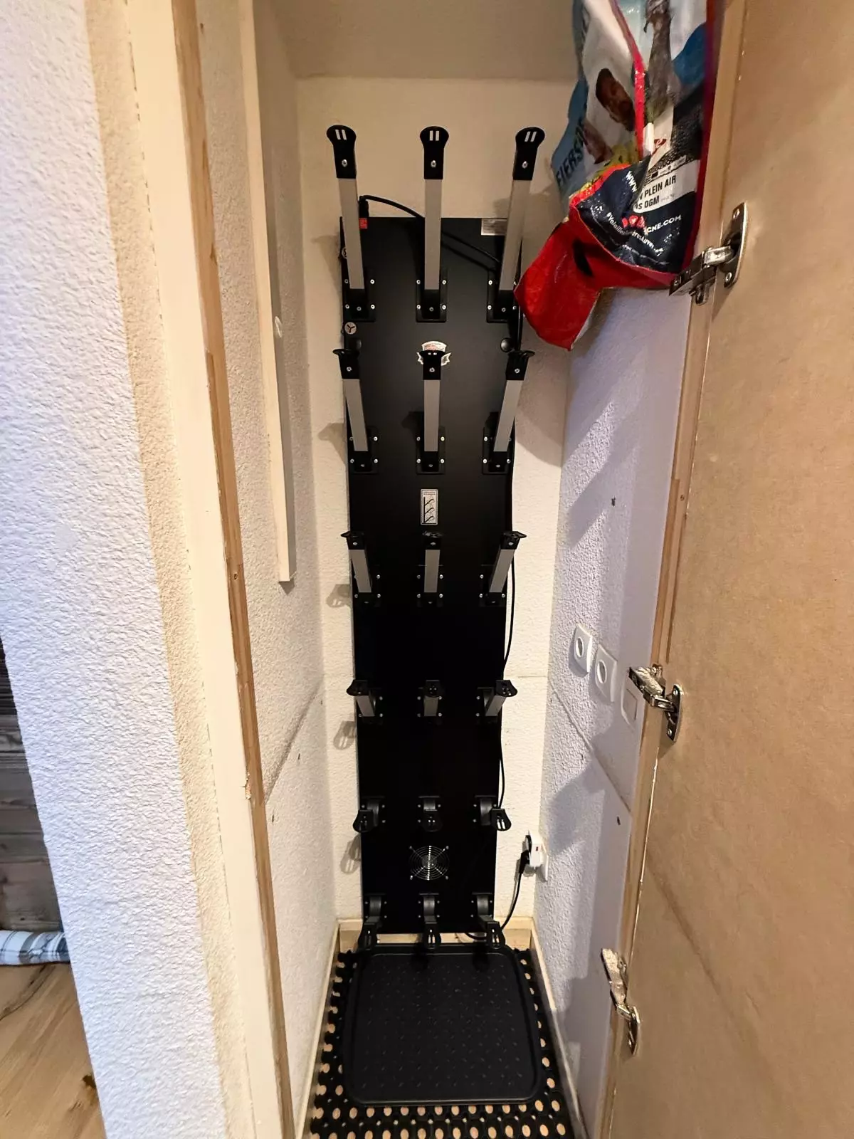Hall d'entrée avec sèche chaussures de ski, rangements et machine à laver.