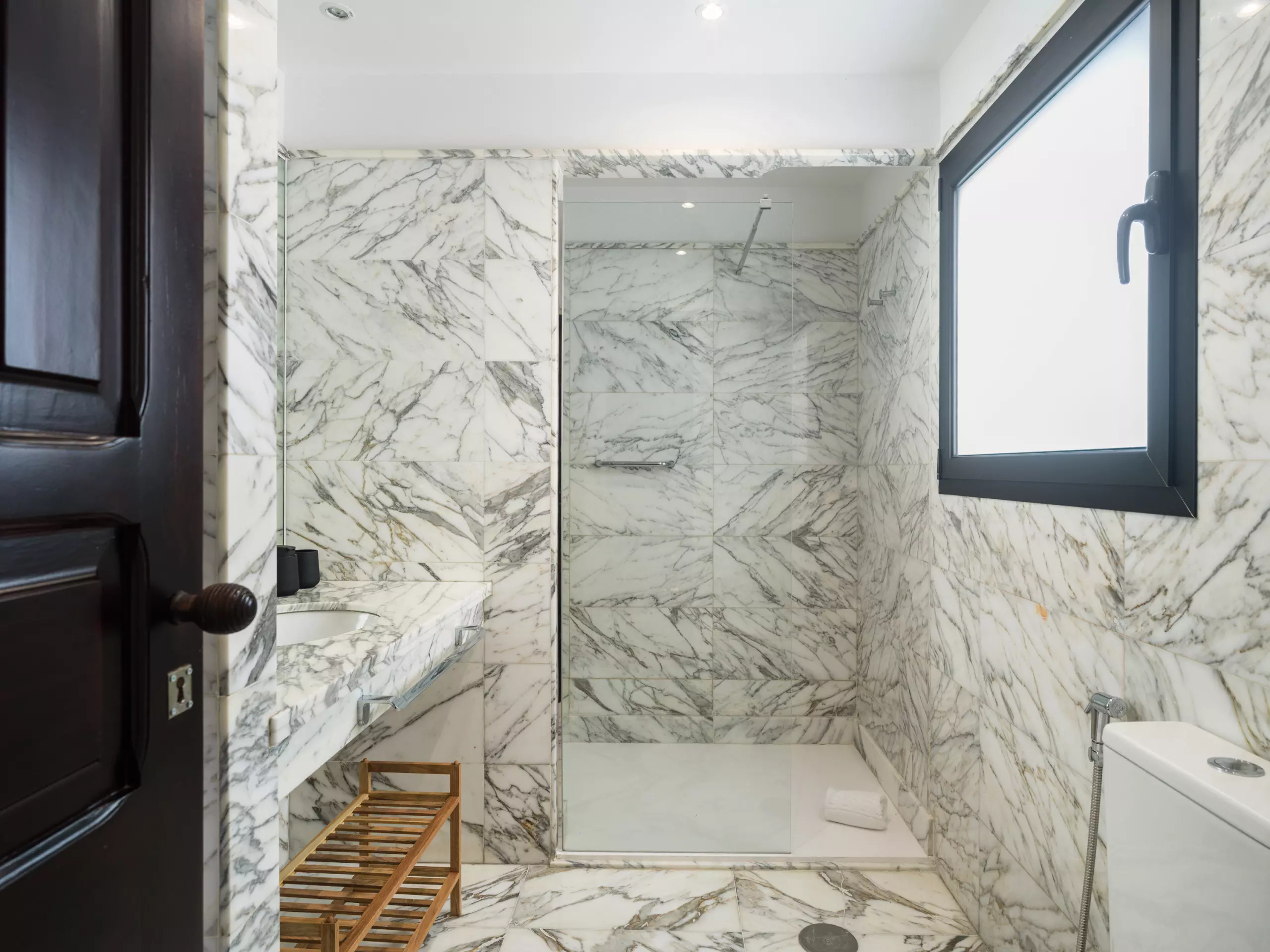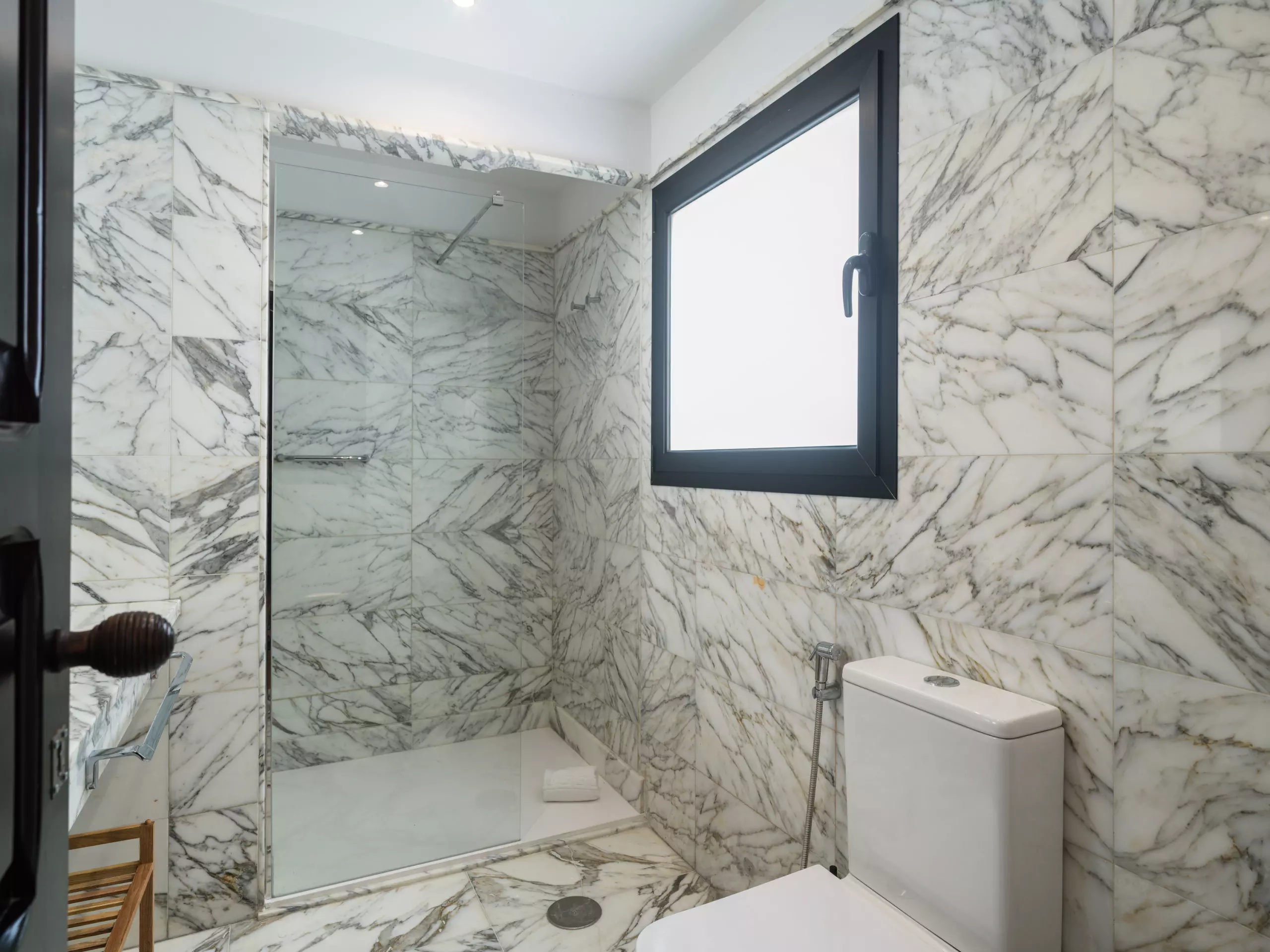 Salle de bain spacieuse avec une douche moderne, bien ventilée et équipée de matériaux de qualité.