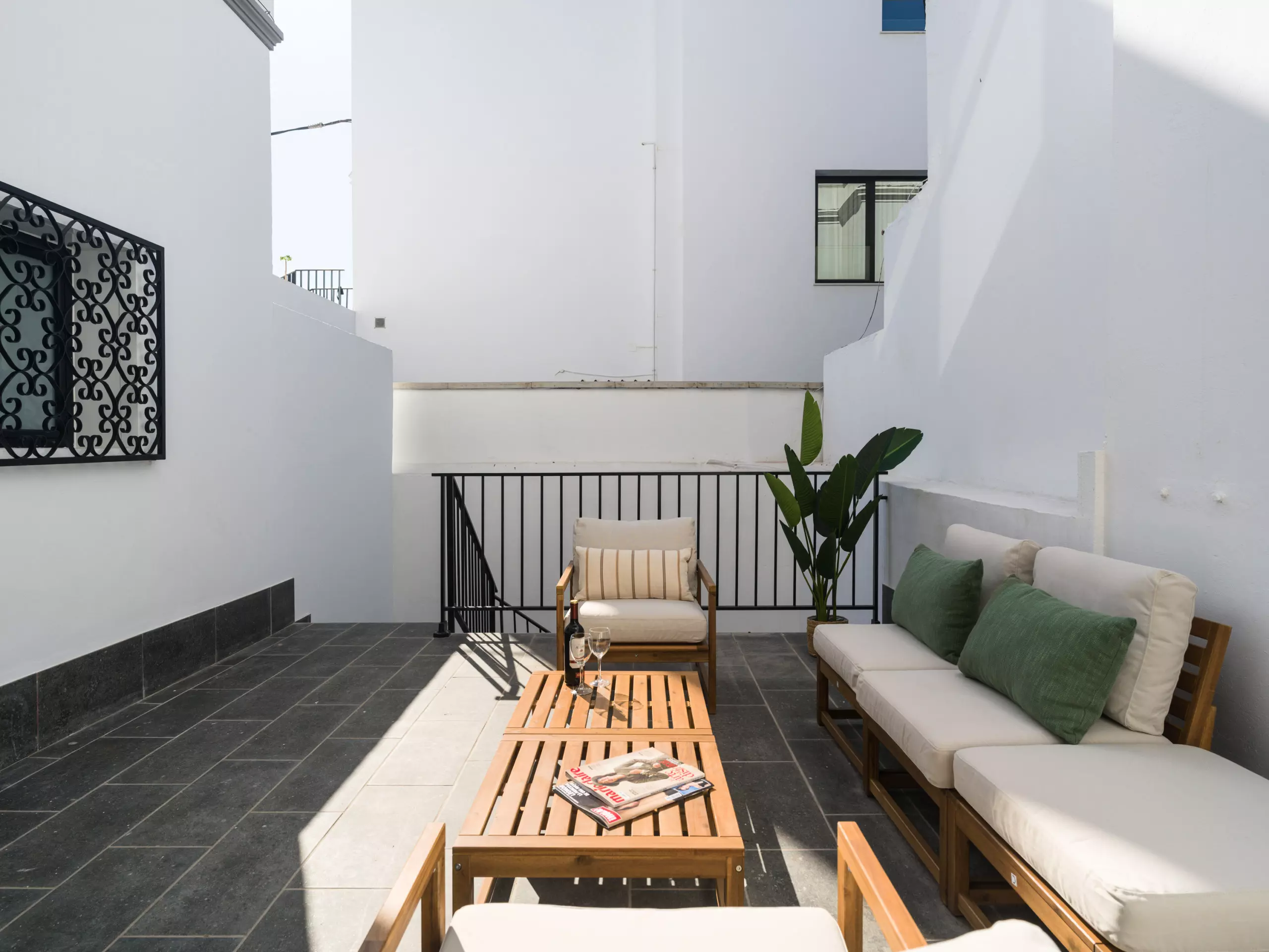 L'un des coins les plus spéciaux est sa grande terrasse d'environ 40 m², équipée de fauteuils confortables et de zones d'ombre et de soleil. Un espace parfait pour lire, prendre un bain de soleil, profiter d'une conversation tranquille ou simplement se détendre en plein air, dans une totale intimité.