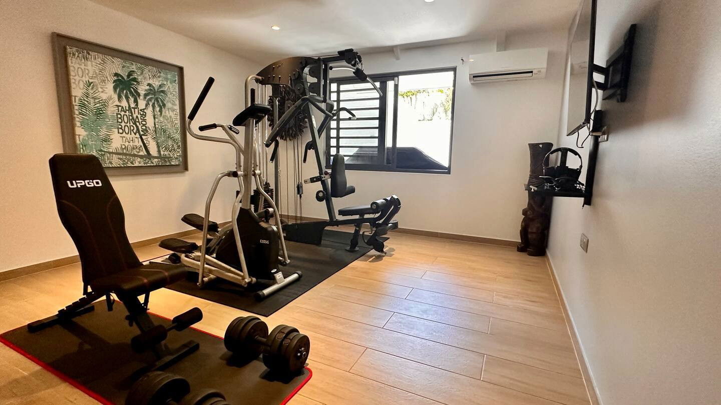 Le confort de la villa s’étend jusqu’à sa salle de sport privée, élégamment aménagée avec des équipements haut de gamme pour vos entraînements quotidiens.