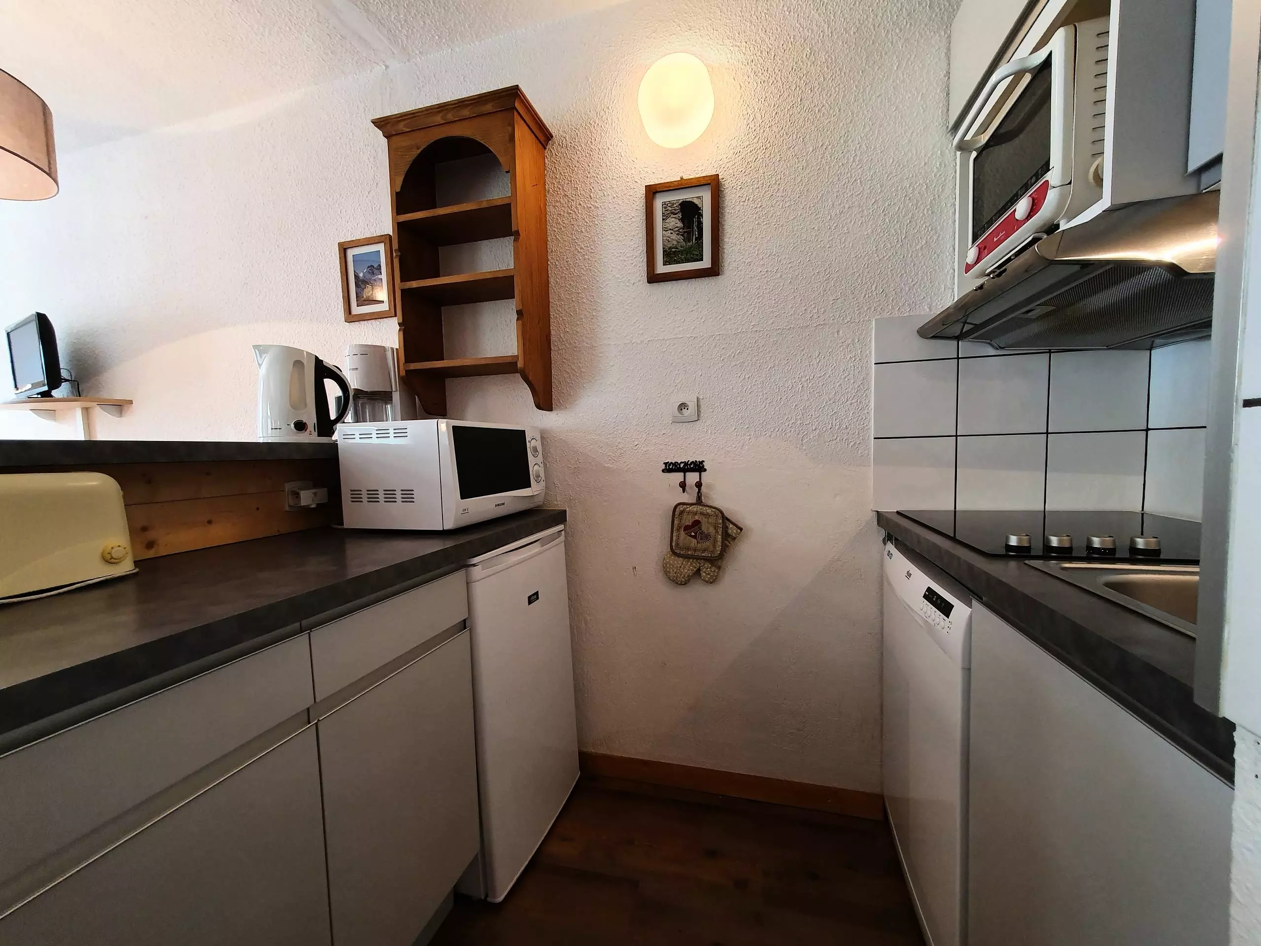 - un coin cuisine composé de 1 mini four, 1 lave vaisselle, 1 micro-ondes, 4 plaques vitrocéramique, 1 réfrigérateur, bouilloire électrique, cafetière, grille pain, service à raclette
