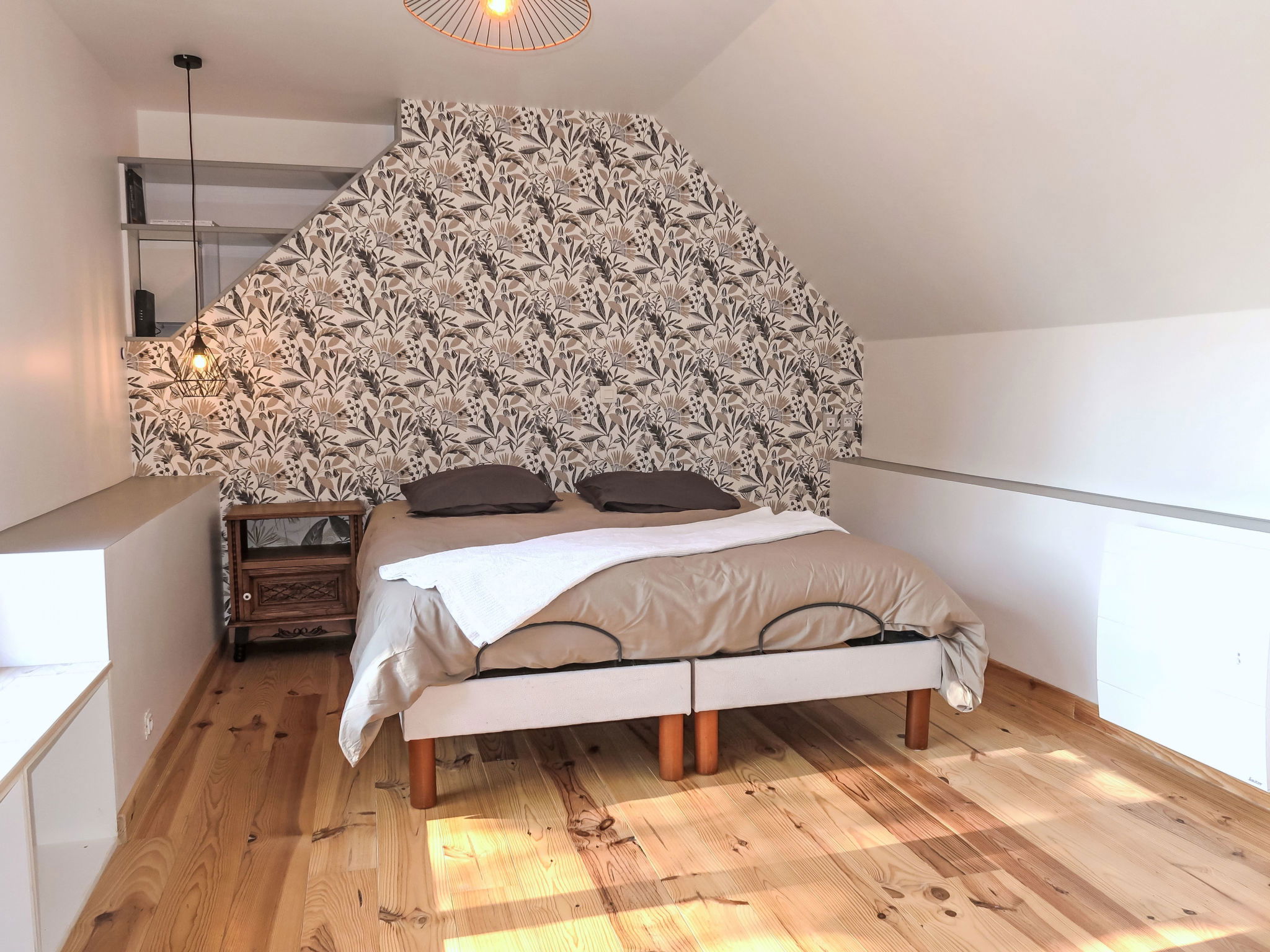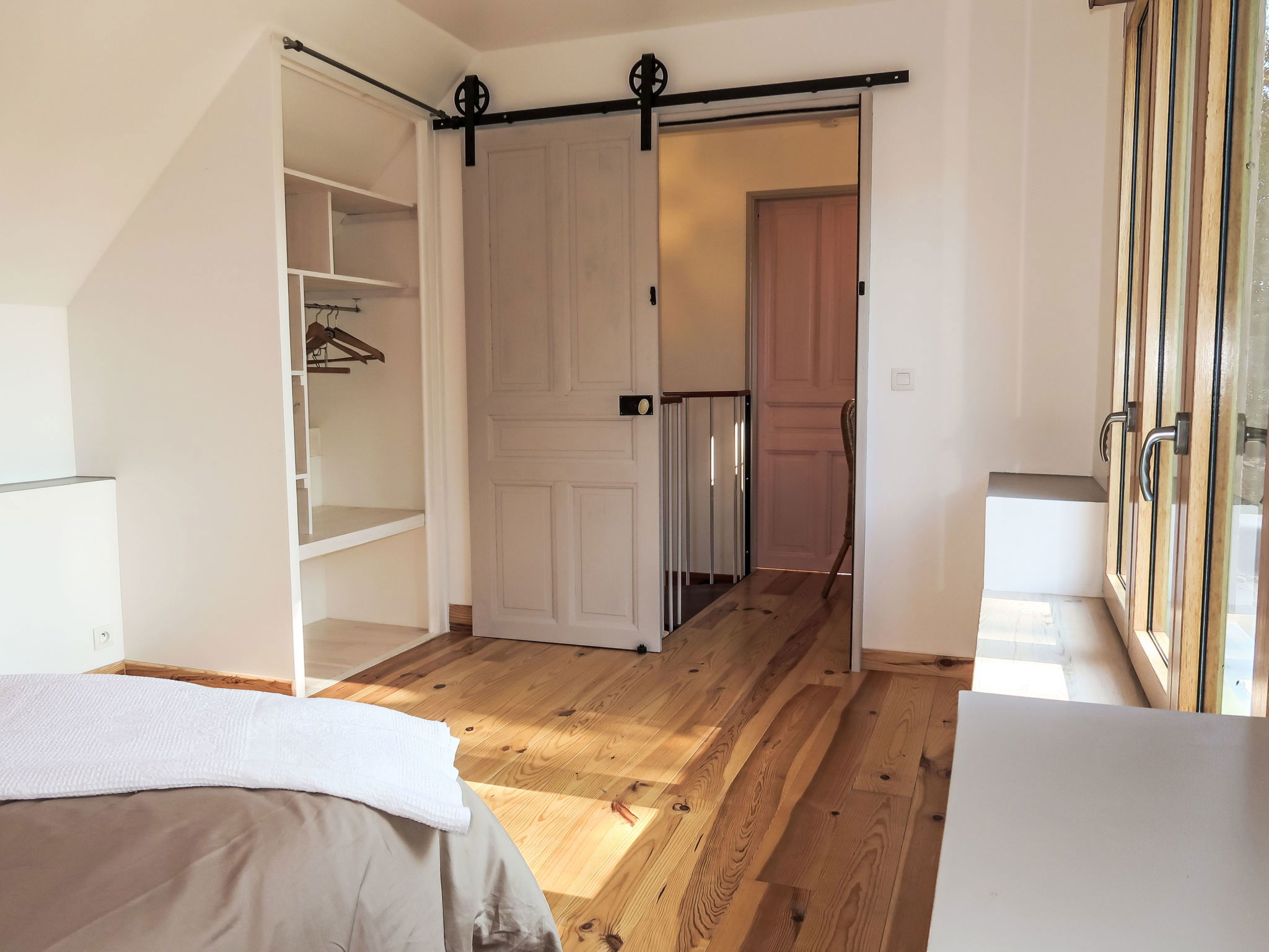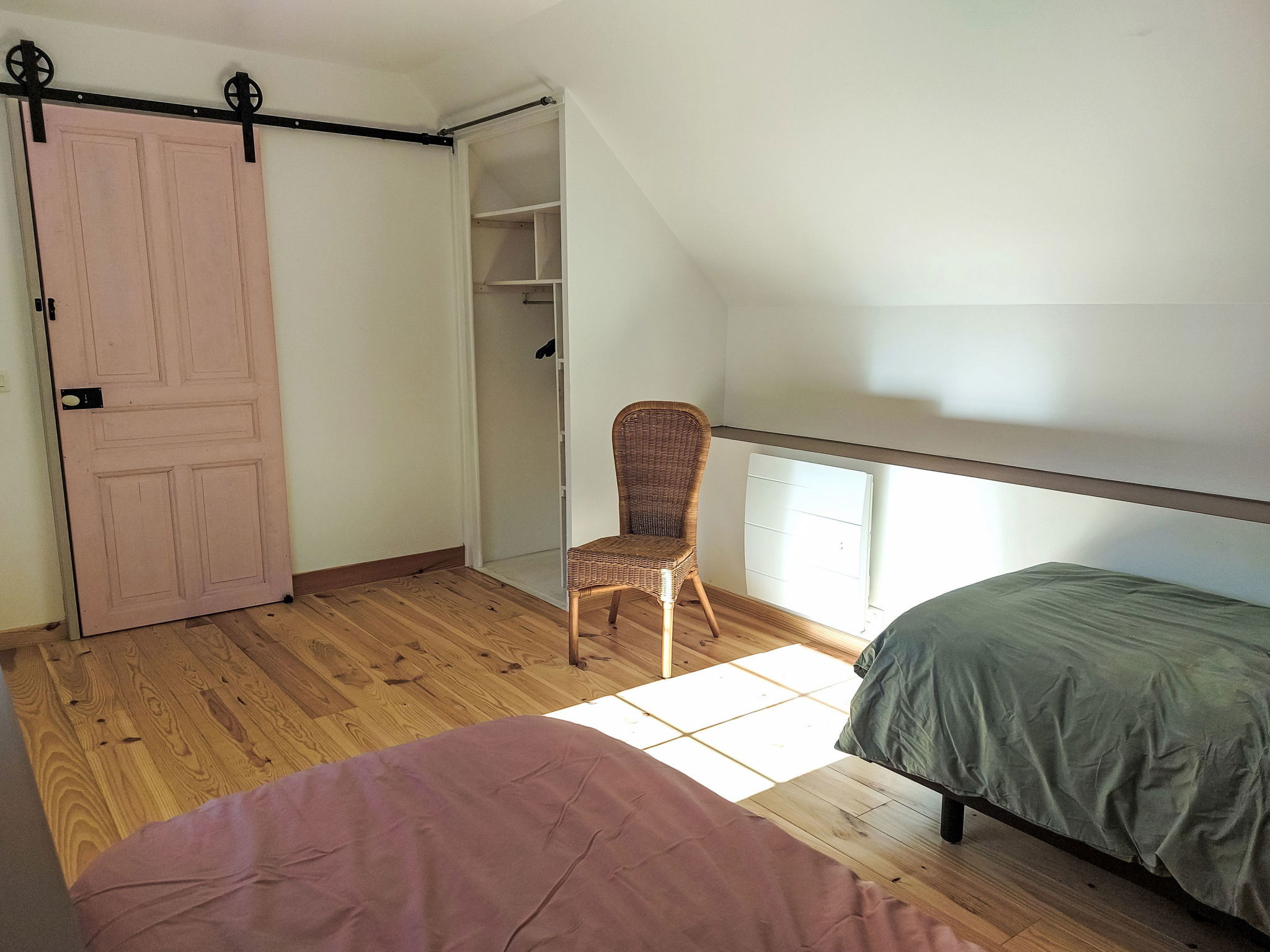 "La Longère", maison 4 pièces 70 m2 sur 2 niveaux. Clair, complètement rénovée en 2025, aménagement agréable et plaisant: séjour/salle à manger 30 m2, ouvert avec TV, écran plat et poêle à bois. Sortie sur le jardin, sur la terrasse. Cuisine ouverte (four, lave-vaisselle, 4 plaques à induction, grille-pain, bouilloire électrique, micro-ondes, congélateur, cafetière électrique). Sortie sur le jardin, sur la terrasse. Douche, WC séparé. À l'étage supérieur: 1 chambre 15 m2, mansardée avec 1 lit double (90 cm, longueur 190 cm). 1 chambre avec 2 lits (90 cm, longueur 190 cm). A disposition: lave-linge, lit bébé jusqu'à 2 ans, sèche-cheveux. Internet (Connexion WIFI, gratuit). Veuillez noter: maison non-fumeur. Maximum 1 animal/ chien de petite taille autorisé. Détecteur de fumée. Annonce d'un particulier (art 155, IV du CGI).