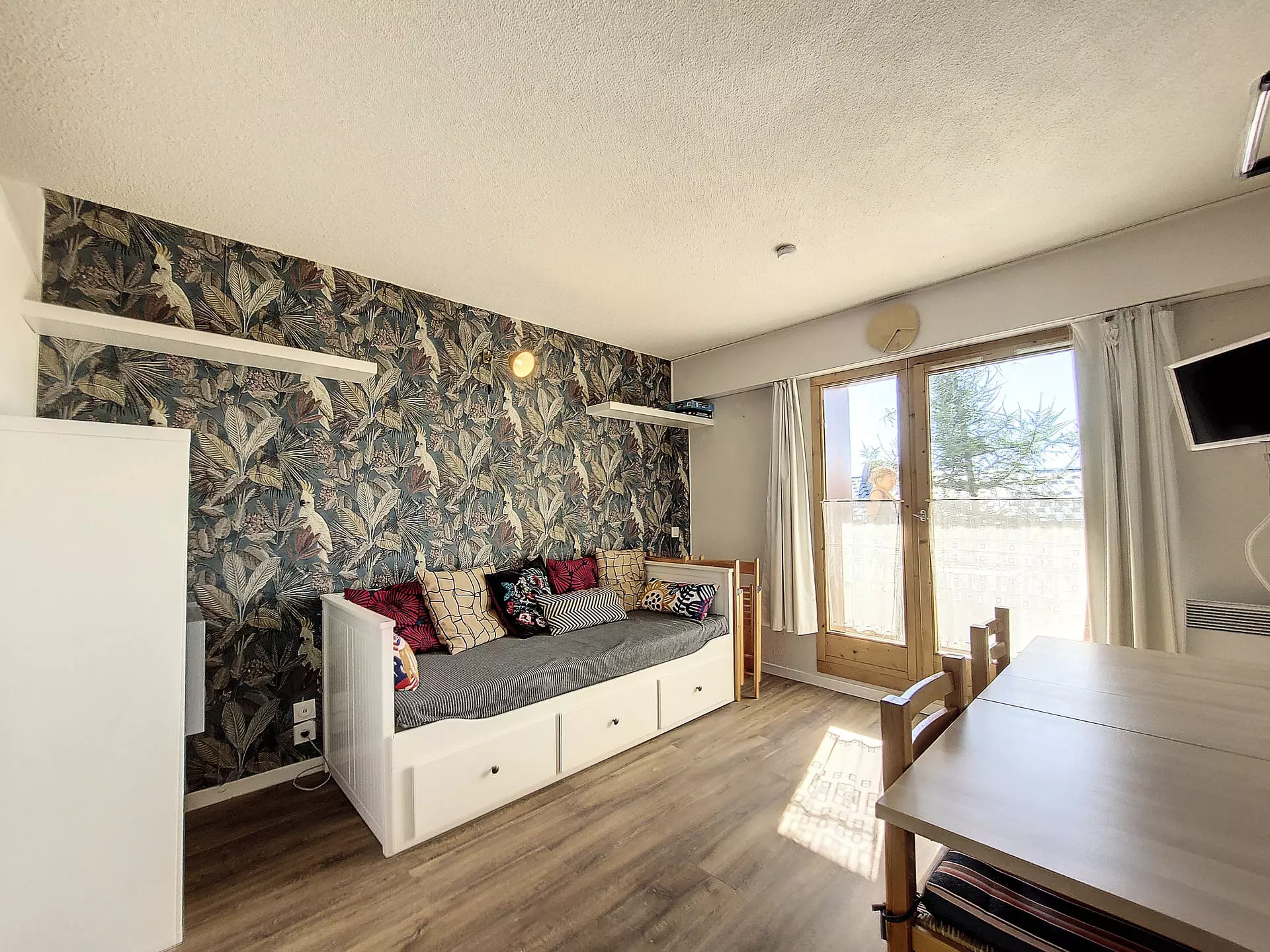 Le séjour comprend canapé gigogne 2x80cm, télévision et coin repas.