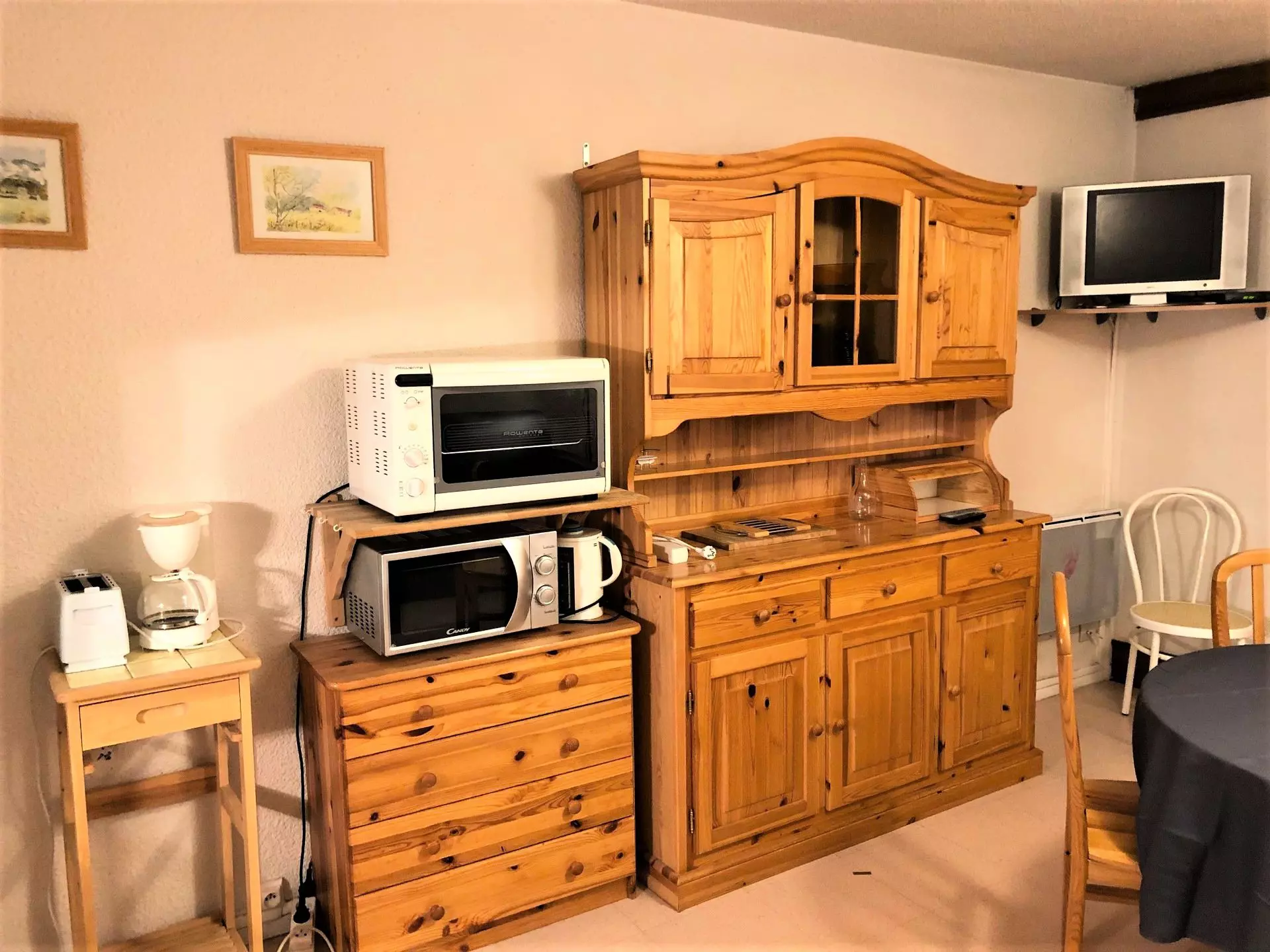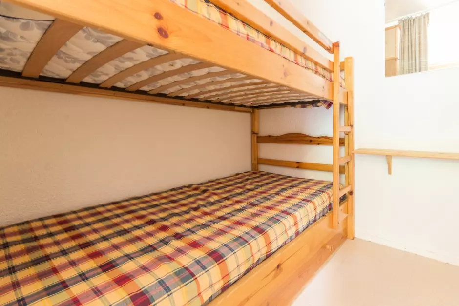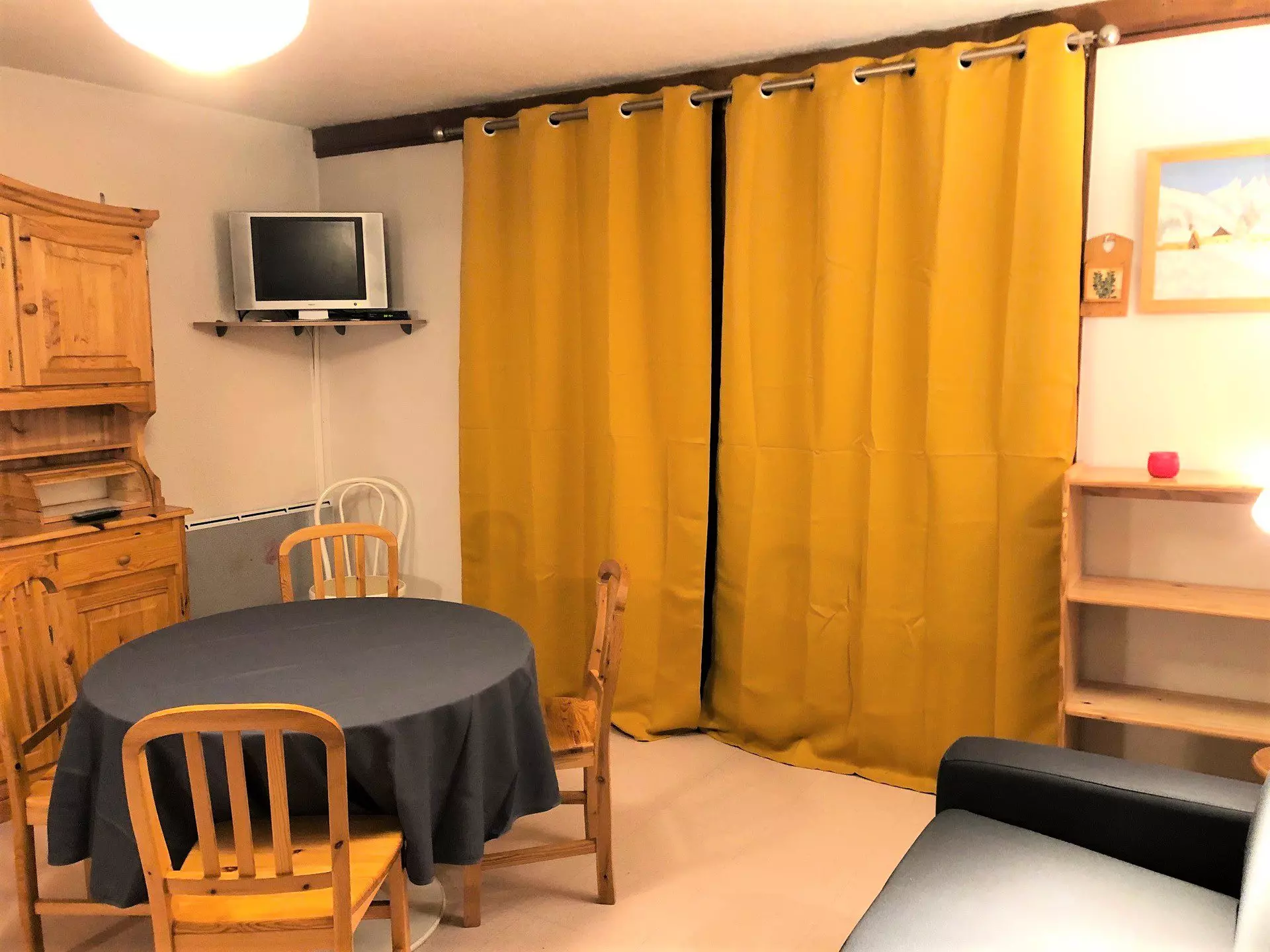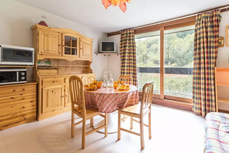 Le séjour est agréable et décoré de mobilier en pin, il est équipé d'1 canapé double rapido, d'une télévision et la grande baie vitrée du séjour donne sur les pistes. Composé également d'une alcôve séparée avec 2 lits superposés.