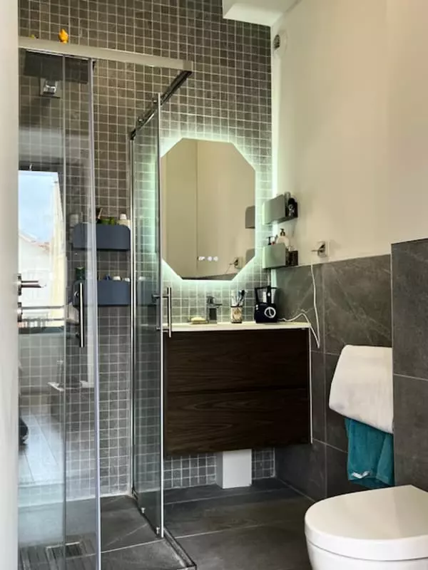 L’appartement comprend une chambre avec un lit double de 180 x 200 et un salon avec un canapé convertible de 140 x 200, offrant un espace agréable pour se détendre après vos journées de visites. La cuisine entièrement équipée vous permet de préparer vos repas facilement, et la salle de douche/bain assure un confort optimal.