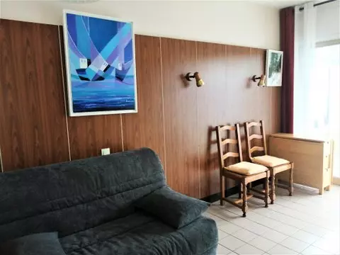 Pièce Principale (carrelage) donnant sur Terrasse Ouest : 1 canapé , 1 table, chaises, 1 télévision écran plat, 1 literie escamotable en 160cm.