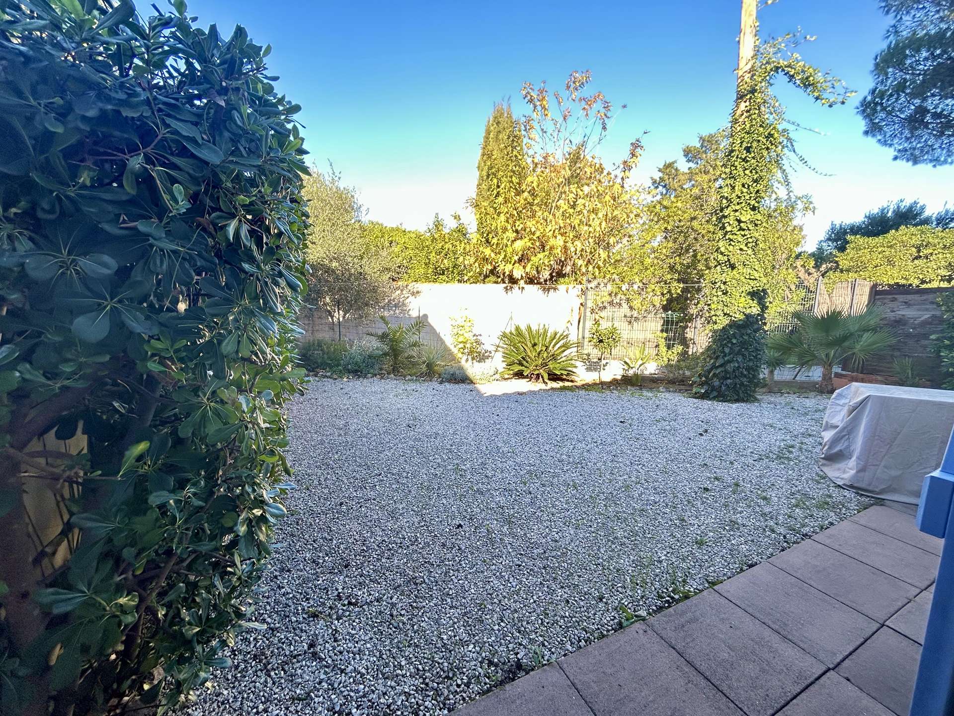 Le jardin luxuriant déborde d’essences et de fleurs. Il est arboré de pins parasols, chênes, et oliviers, le tout clôturé.