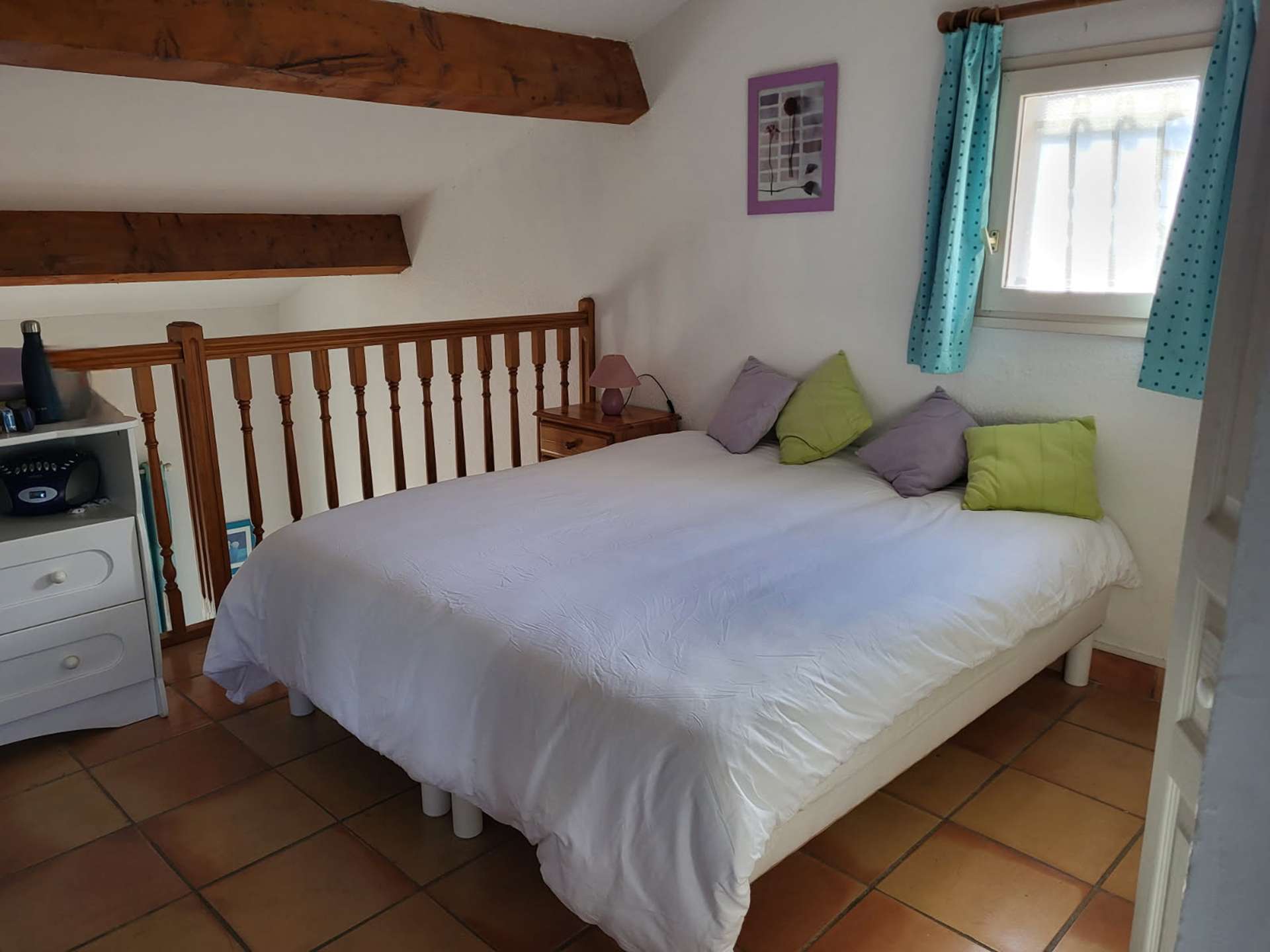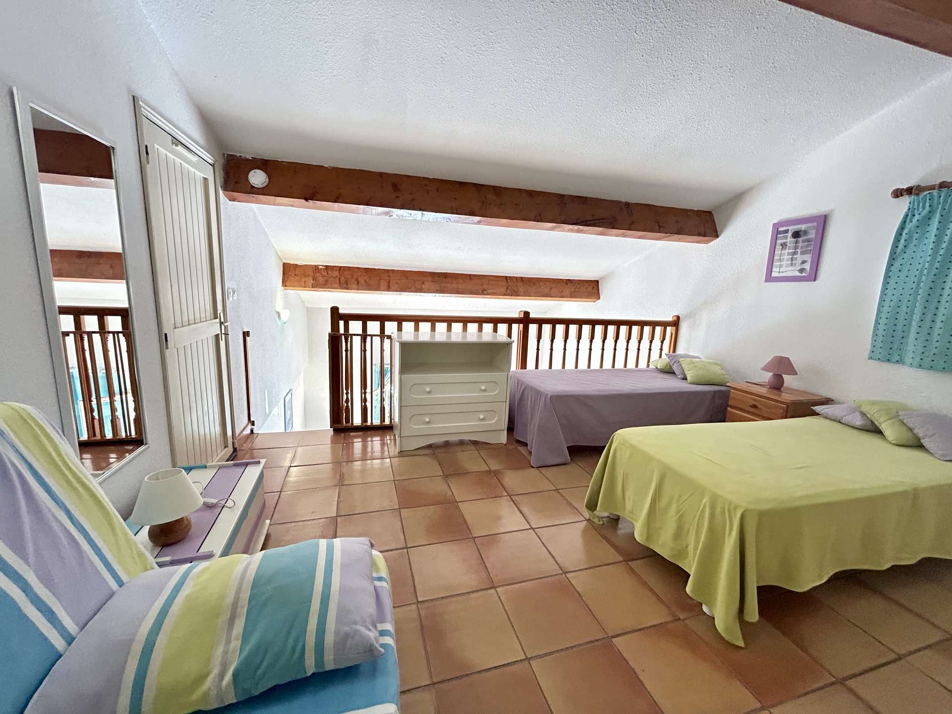 A l'étage en mezzanine: deux lits simples pouvant être rapprochés pour faire un lit double de 160 et une salle d'eau avec wc.