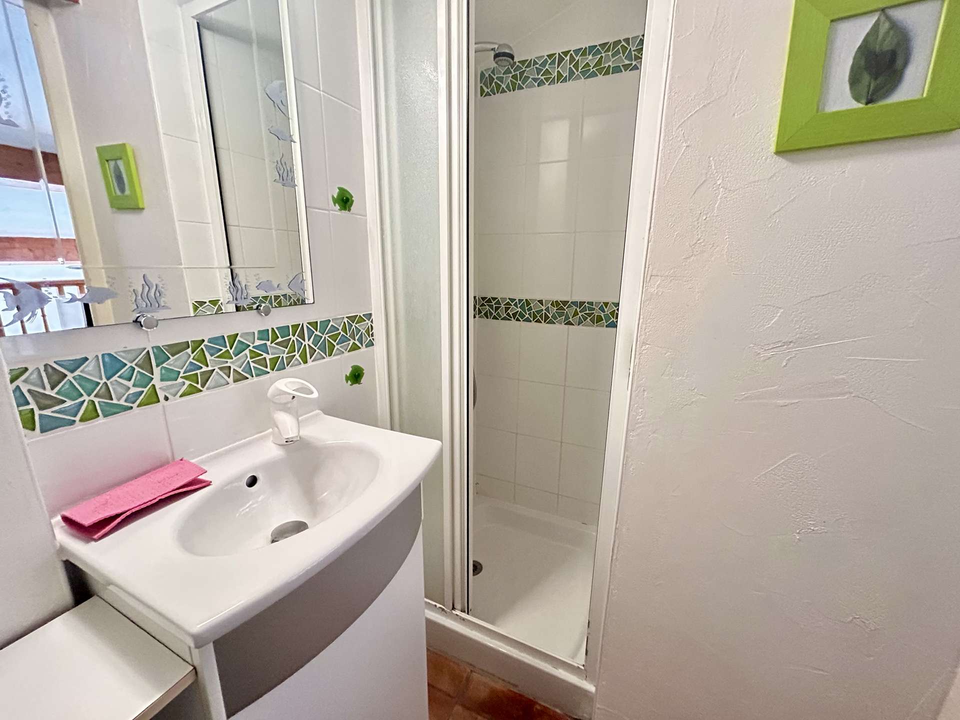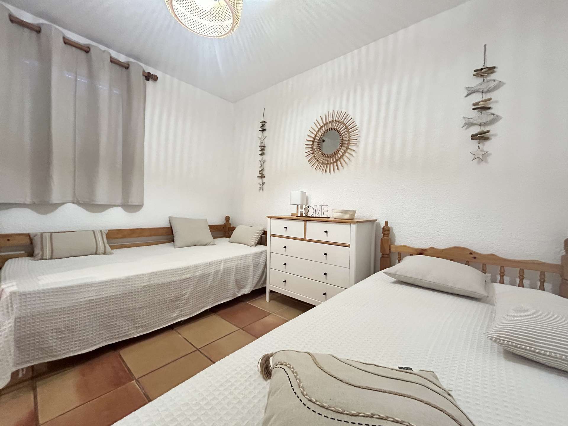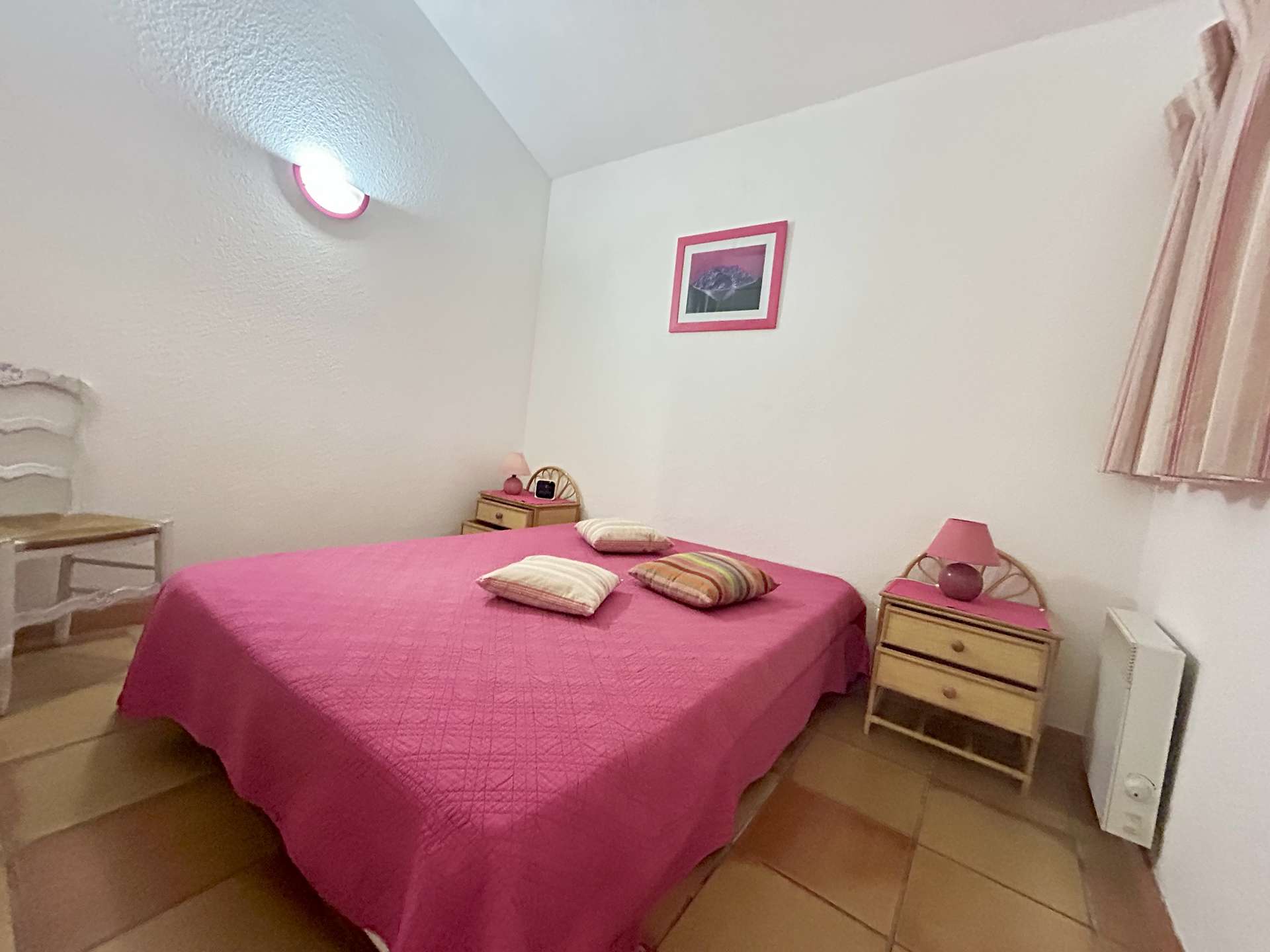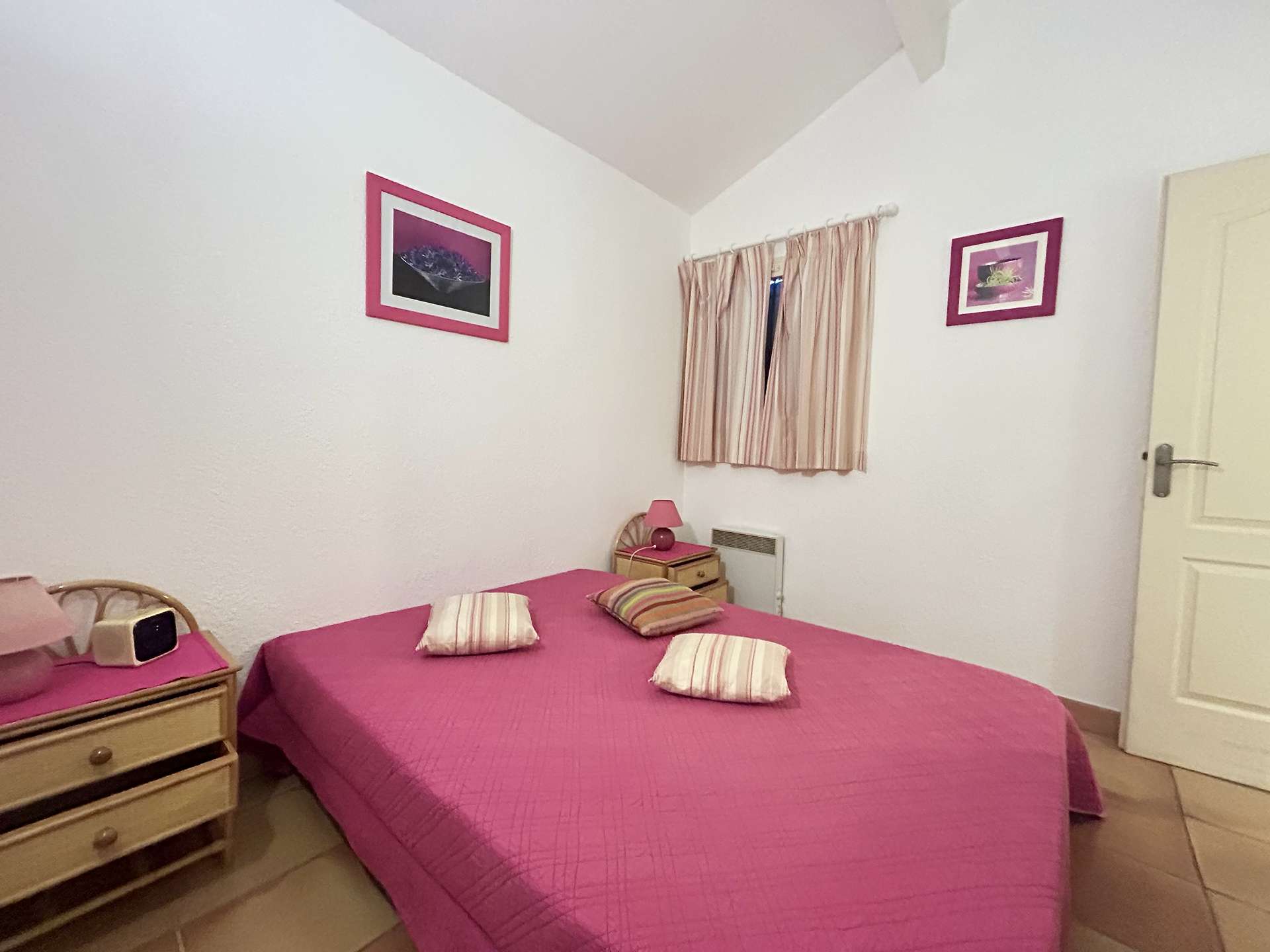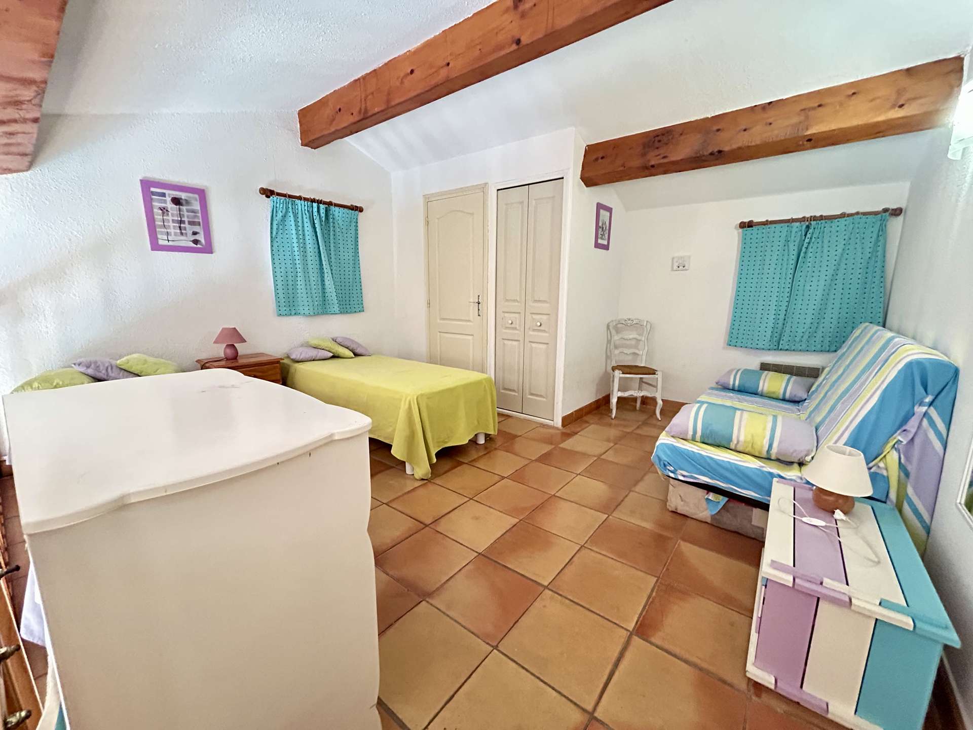 Meublée au style provençal et ouverte sur l’extérieur, elle comprend, une entrée, un beau séjour lumineux avec une cuisine équipée séparée, vous disposerez en rez de chaussée de deux chambres, une avec un lit double de 140cm, une avec deux lits simples, douche à l'italienne. WC indépendant. Un coin nuit également avec un convertible clic-clac.