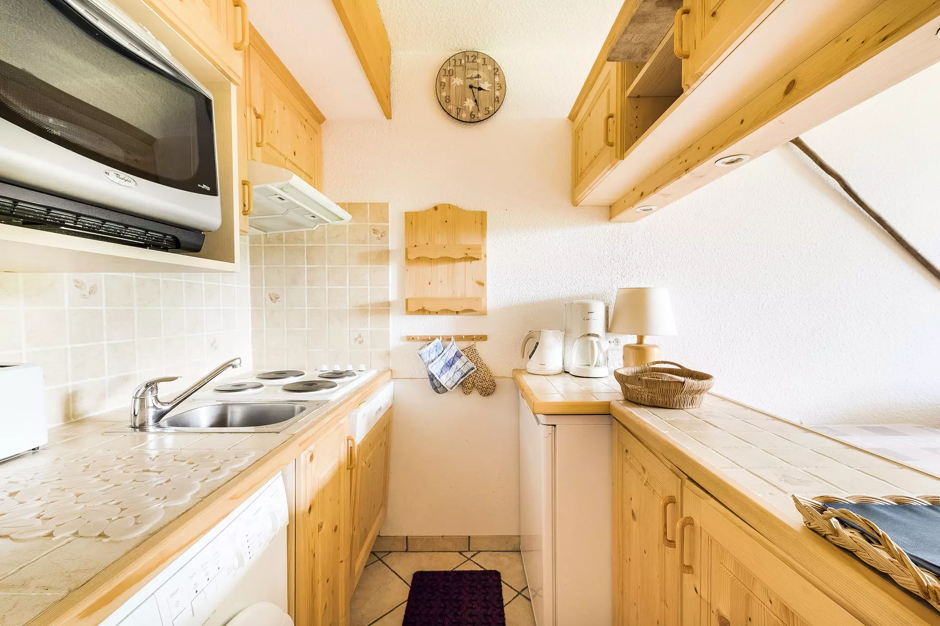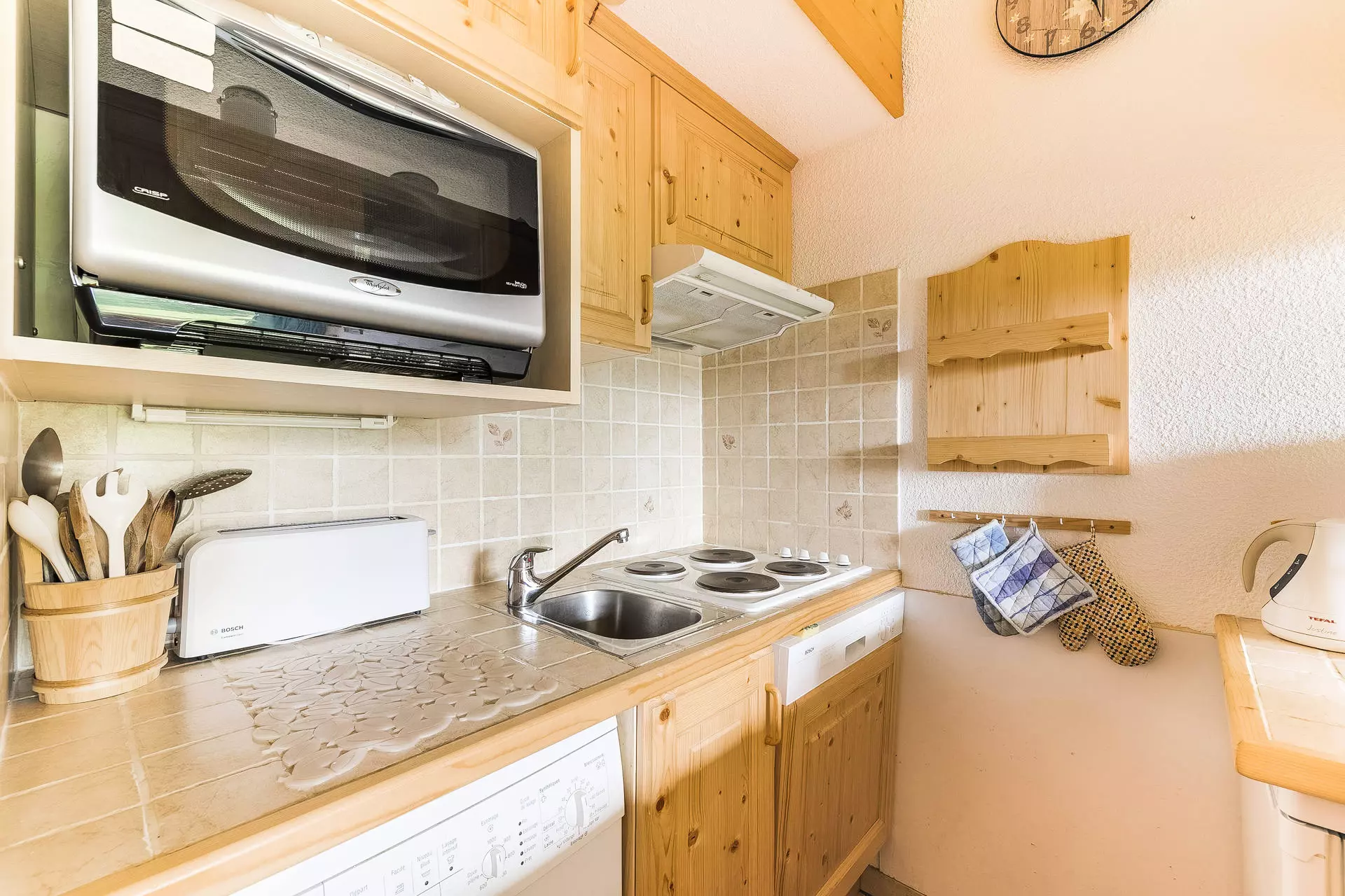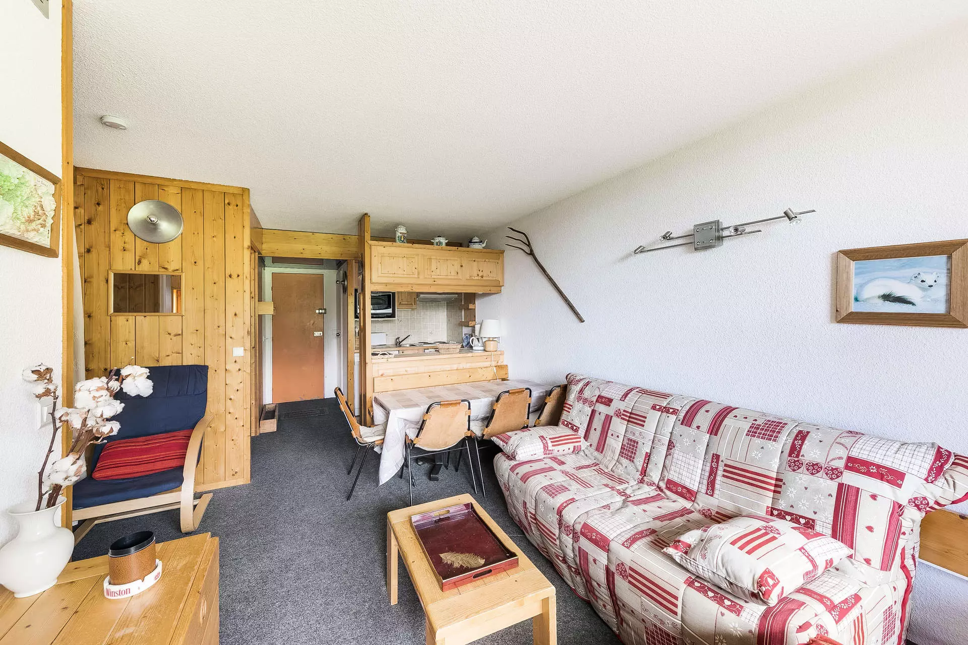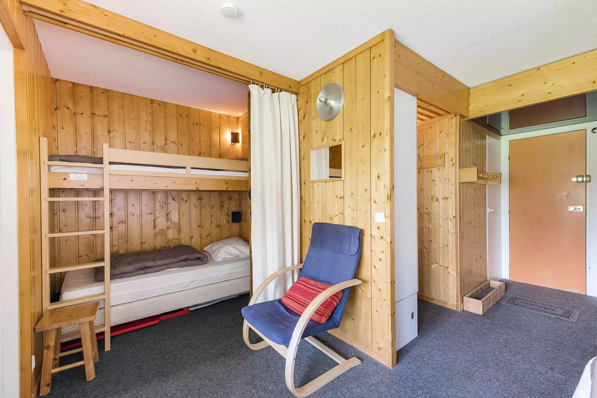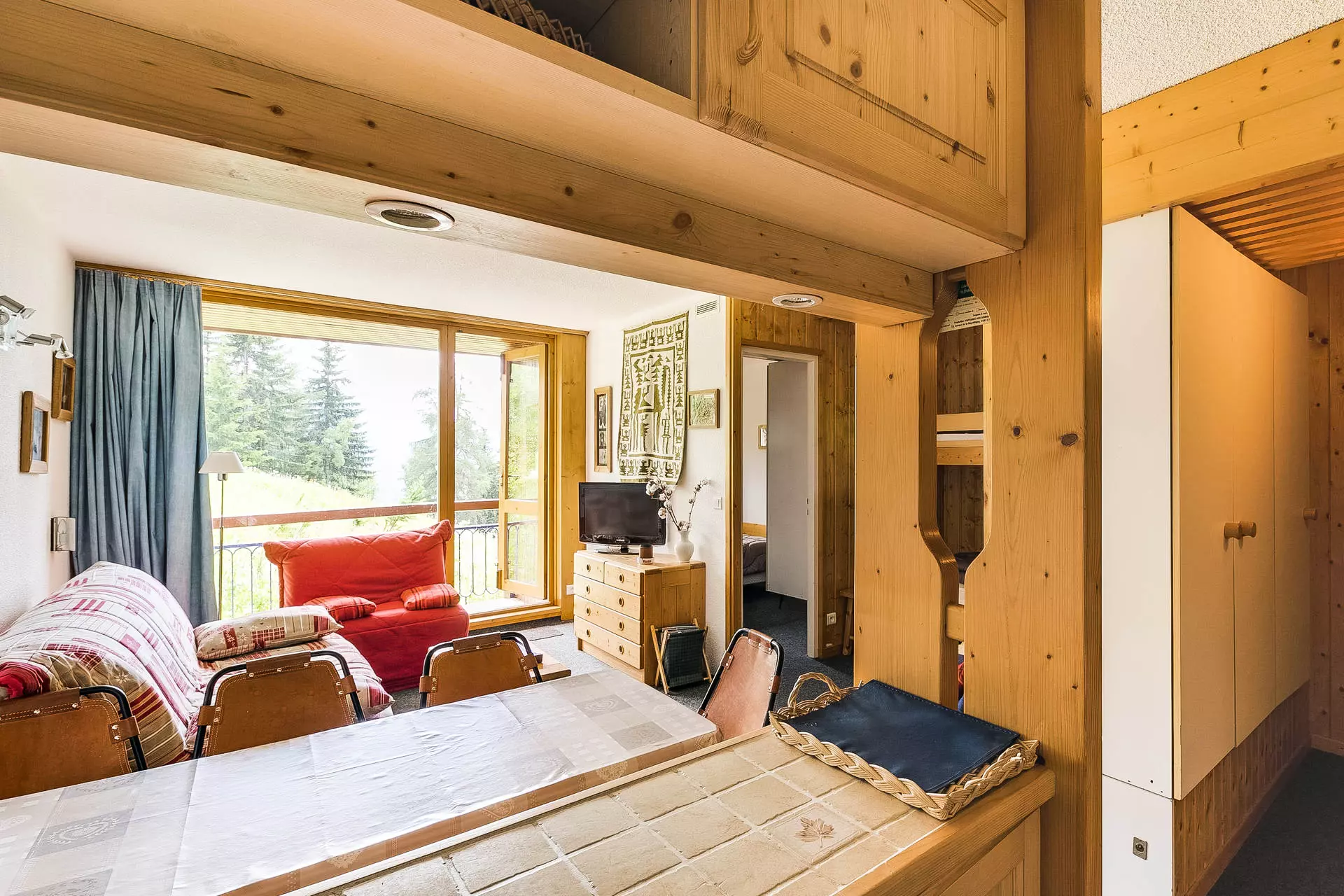 Pour vos vacances au ski ou vos vacances d'été aux Arcs 1800, réservez cet appartement 2 pièces qui bénéficie d'un balcon exposé Sud-Ouest avec une vue sur les montagnes et la vallée.