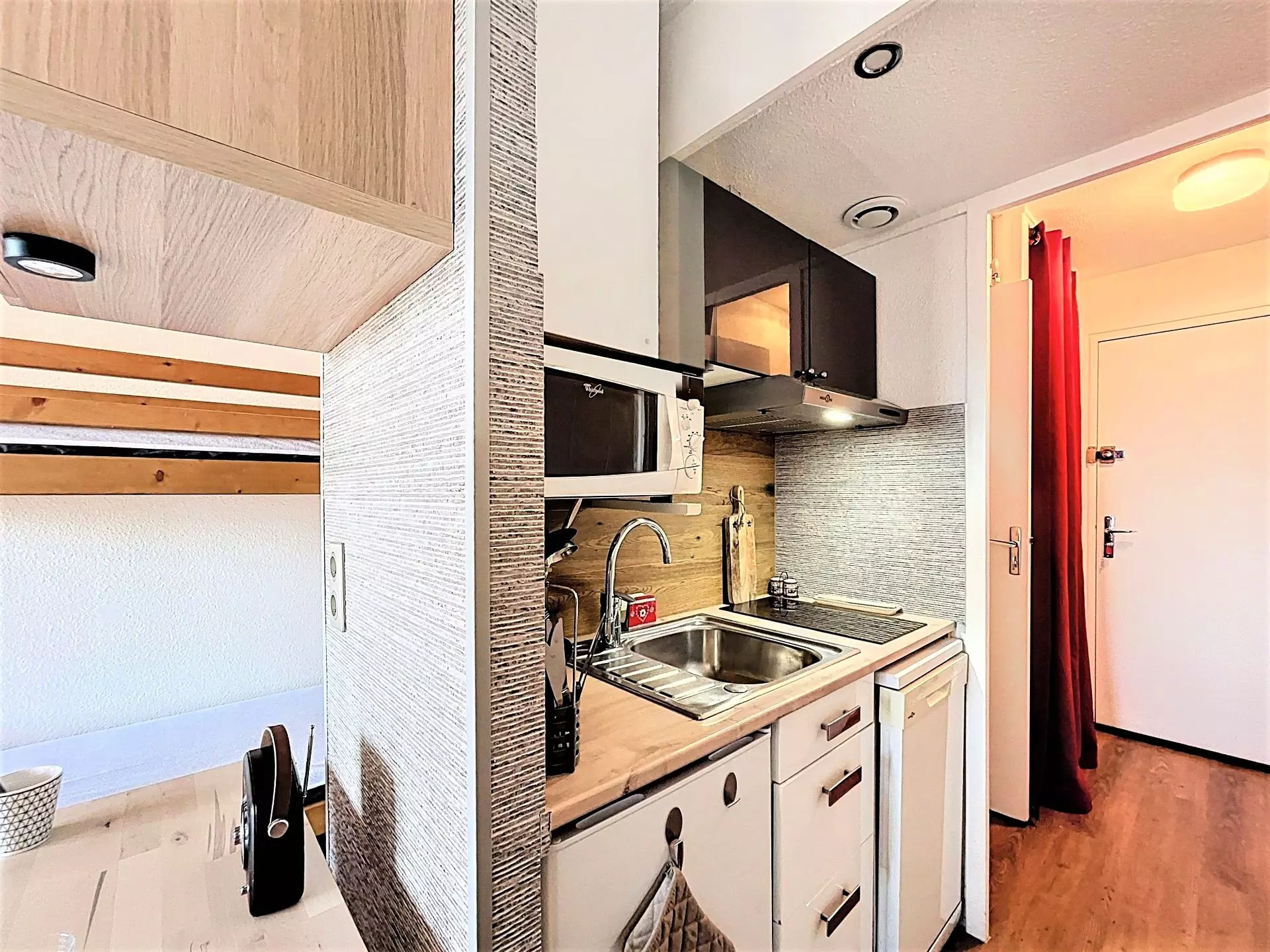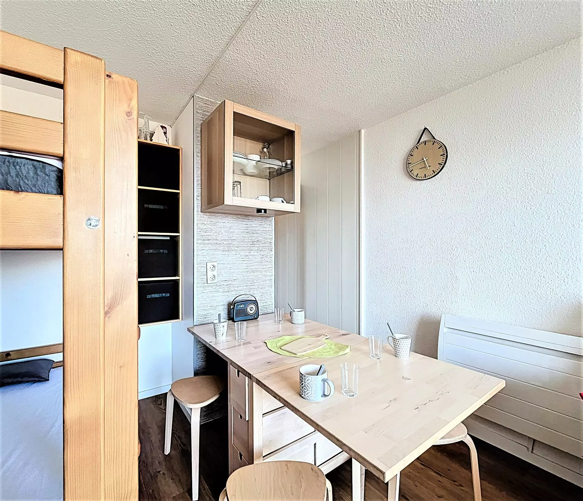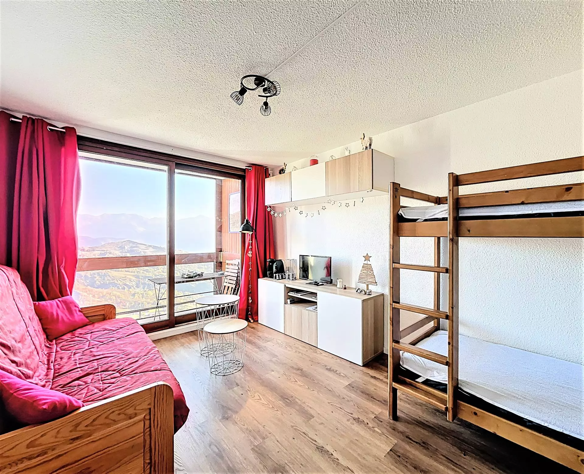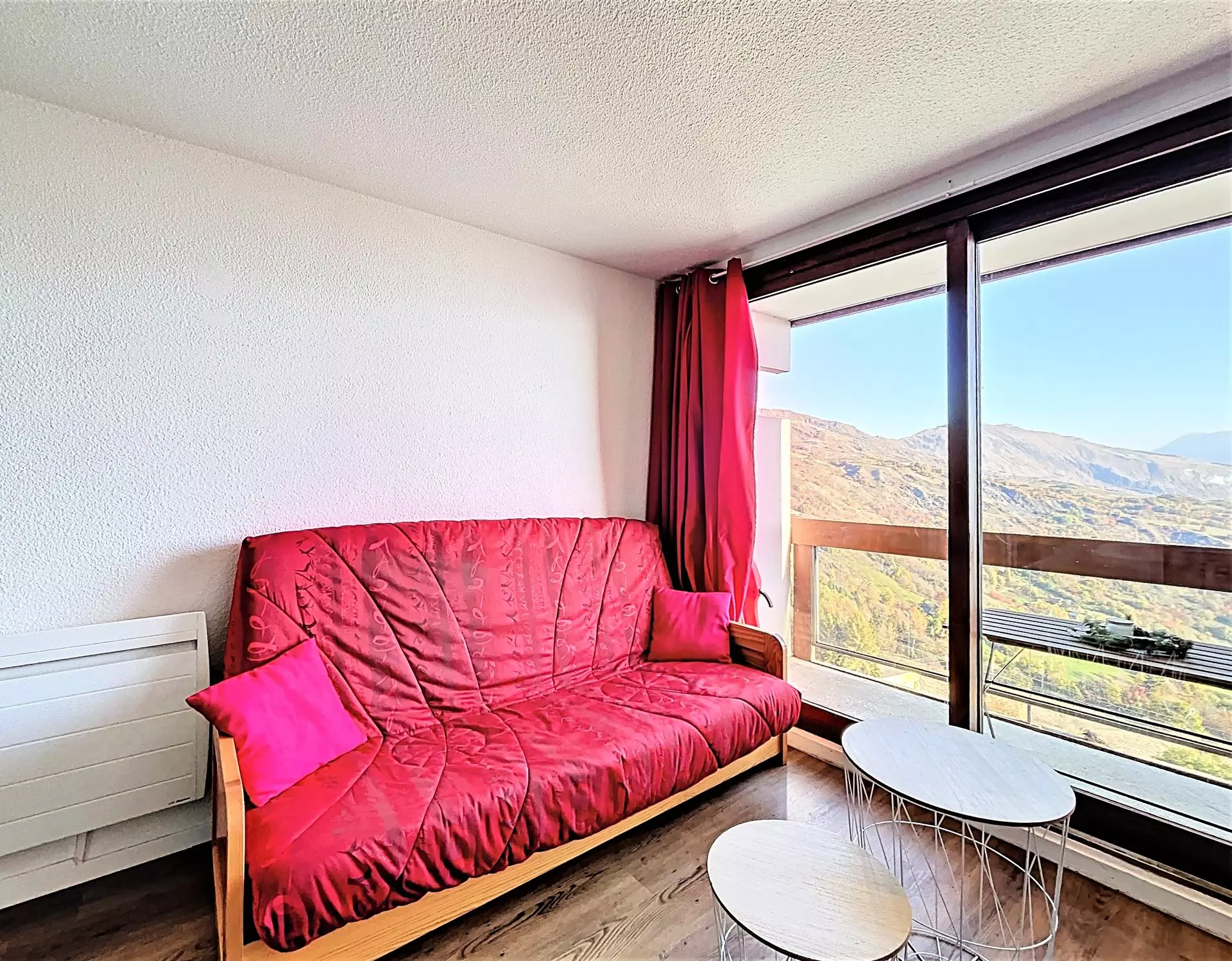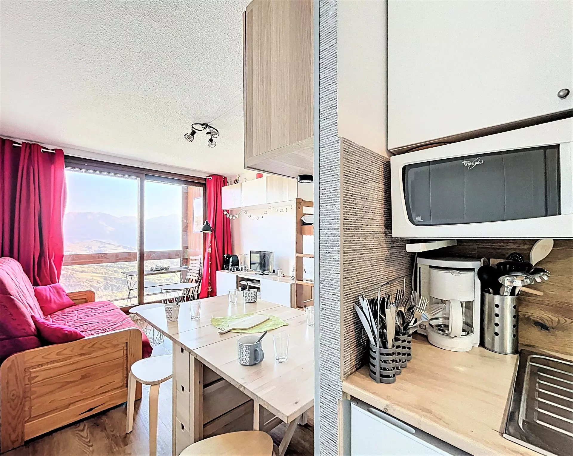 Beau studio de 22m², entièrement rénové, pour 4 personnes, Situé Résidence Soyouz, au 18ème étage, Balcon orienté nord, Vue montagne
