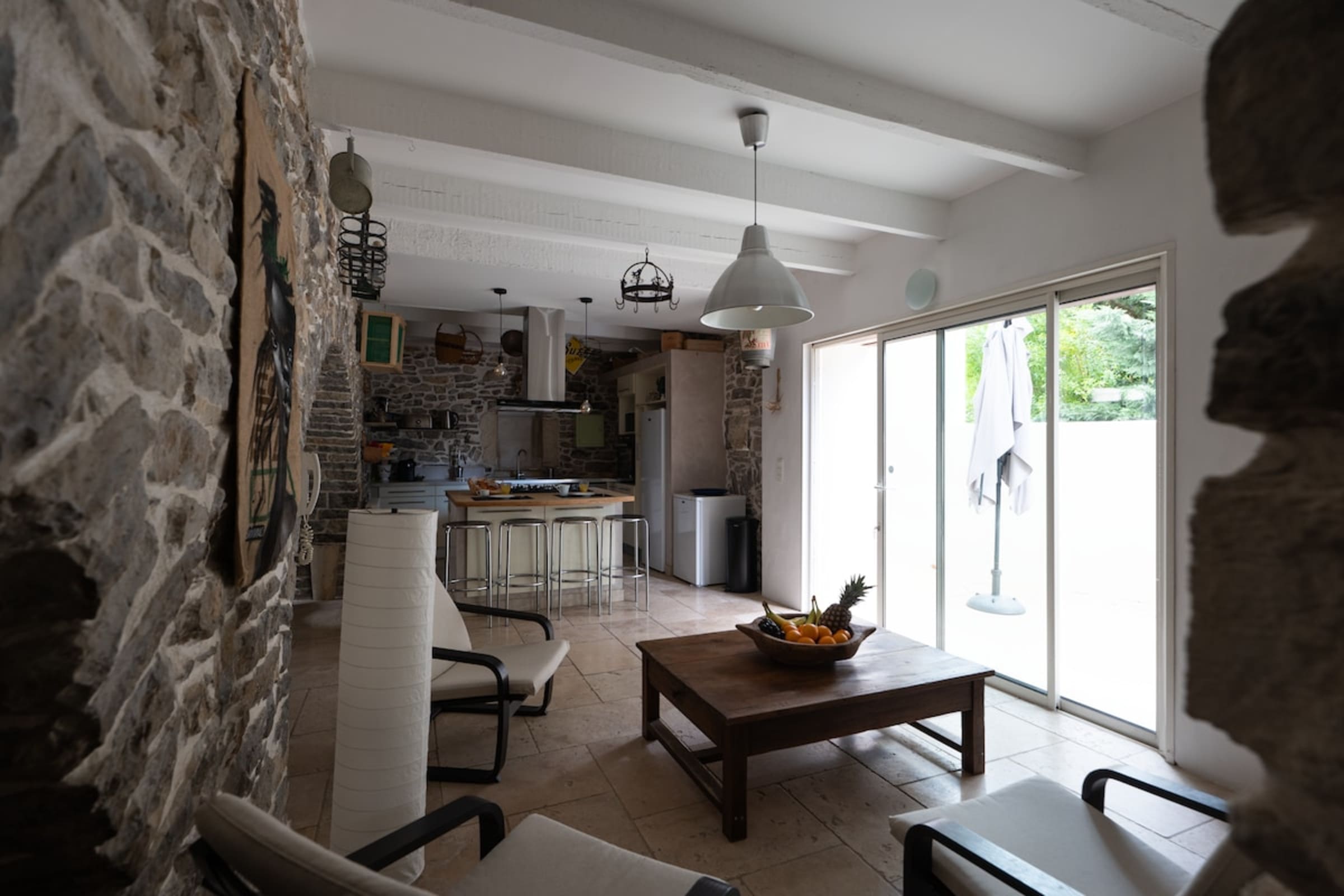 La maison offre une grande pièce de vie lumineuse avec salon, salle à manger et cuisine ouverte.