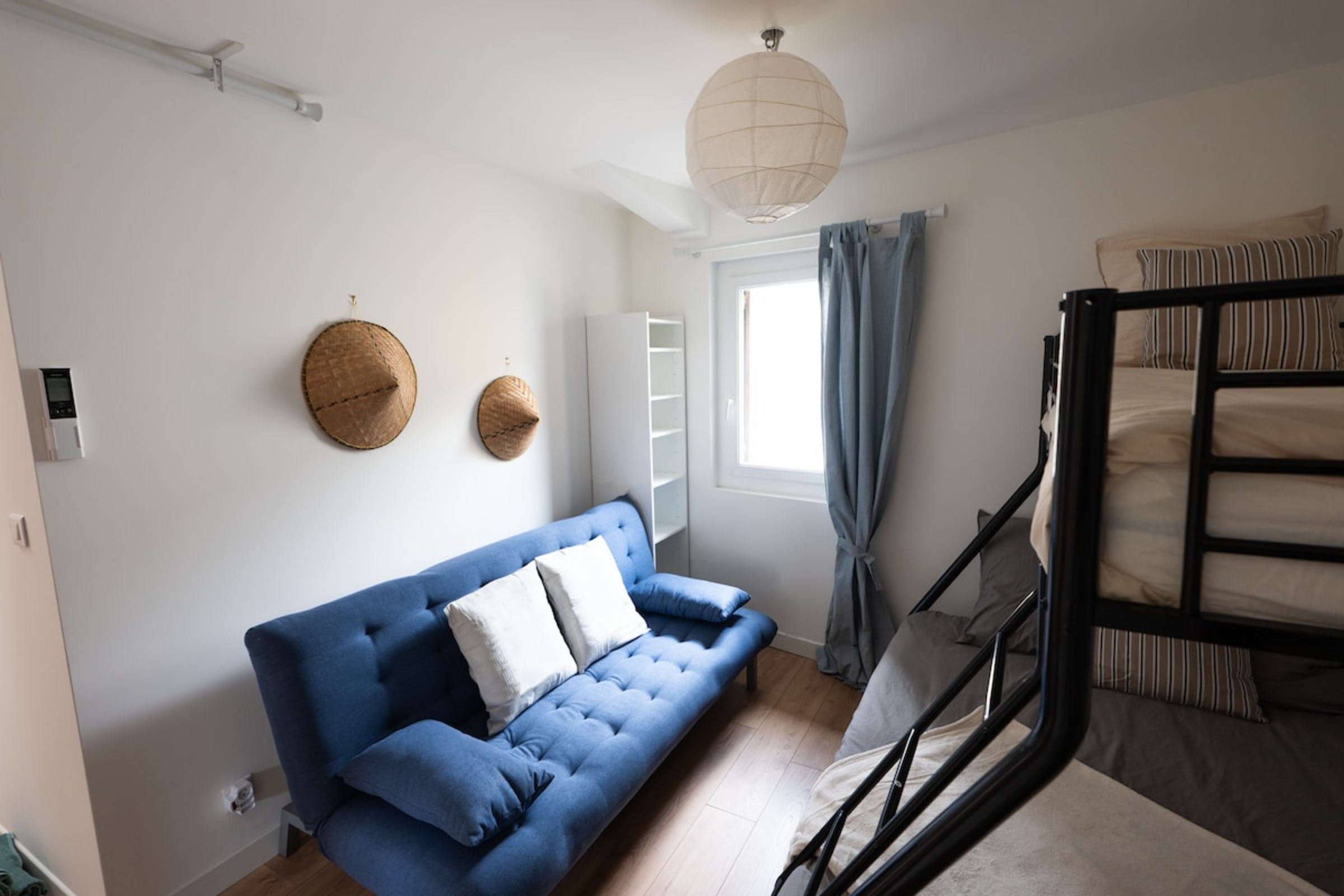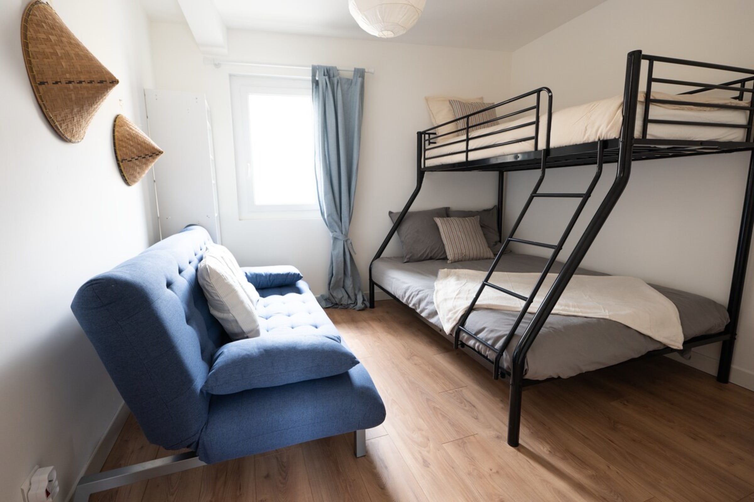 Chambre 4 : lit superposé (double 140×190 cm + simple 90×190 cm) + canapé-lit double (140×190 cm)
