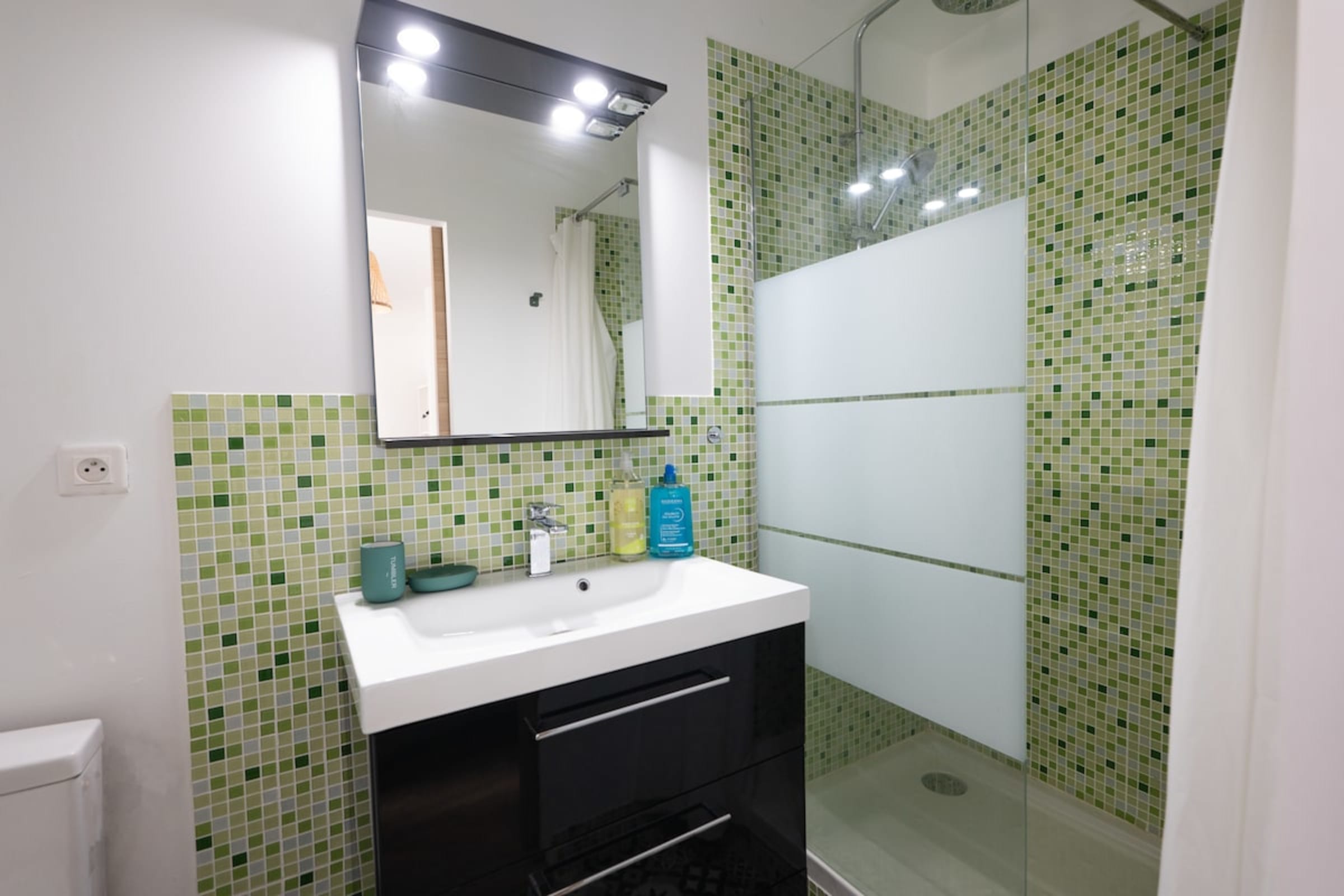 Chambre 3 : lit queen size (160×200 cm) + canapé-lit double (140×190 cm), salle d’eau privative avec douche et WC
