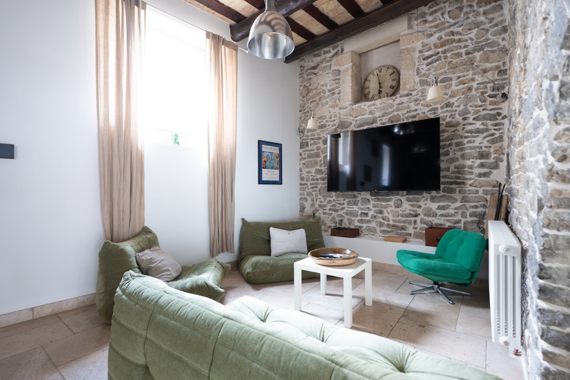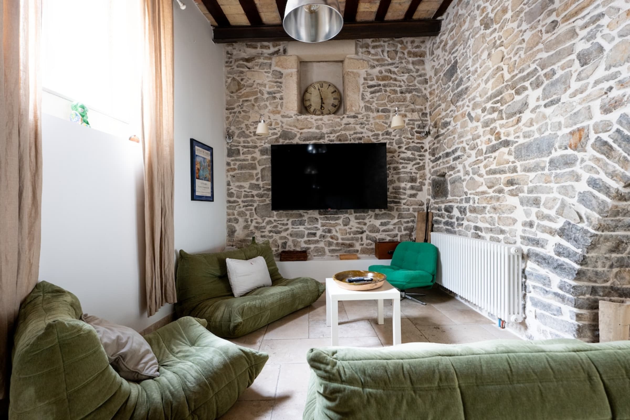 Salon : grand canapé, télévision grand écran, espace détente convivial