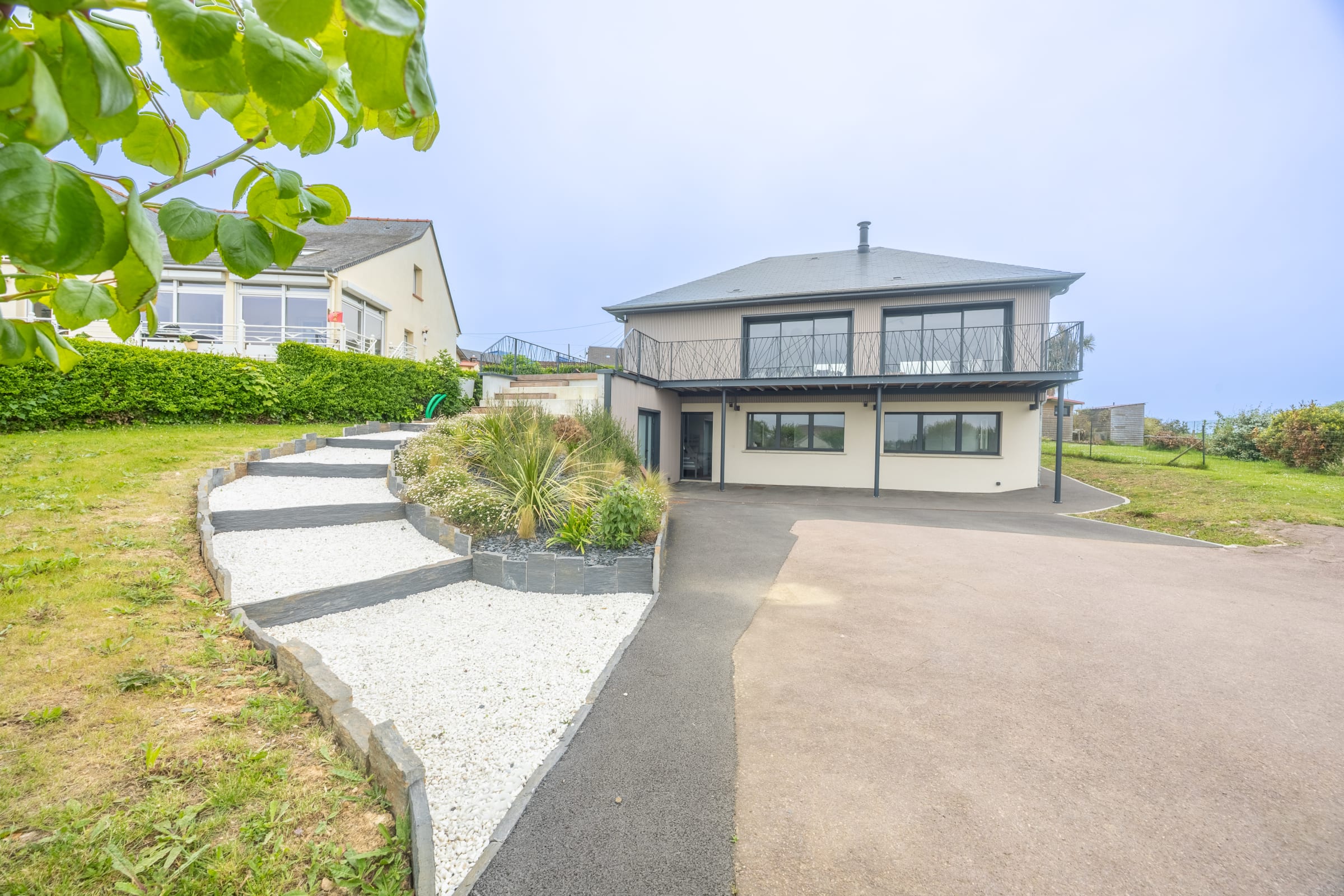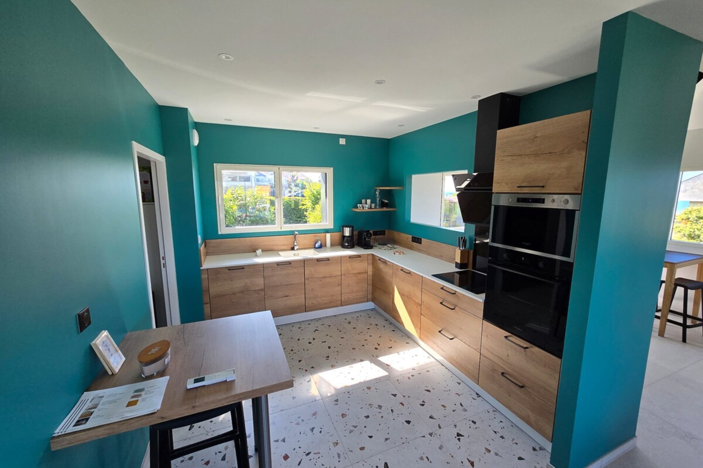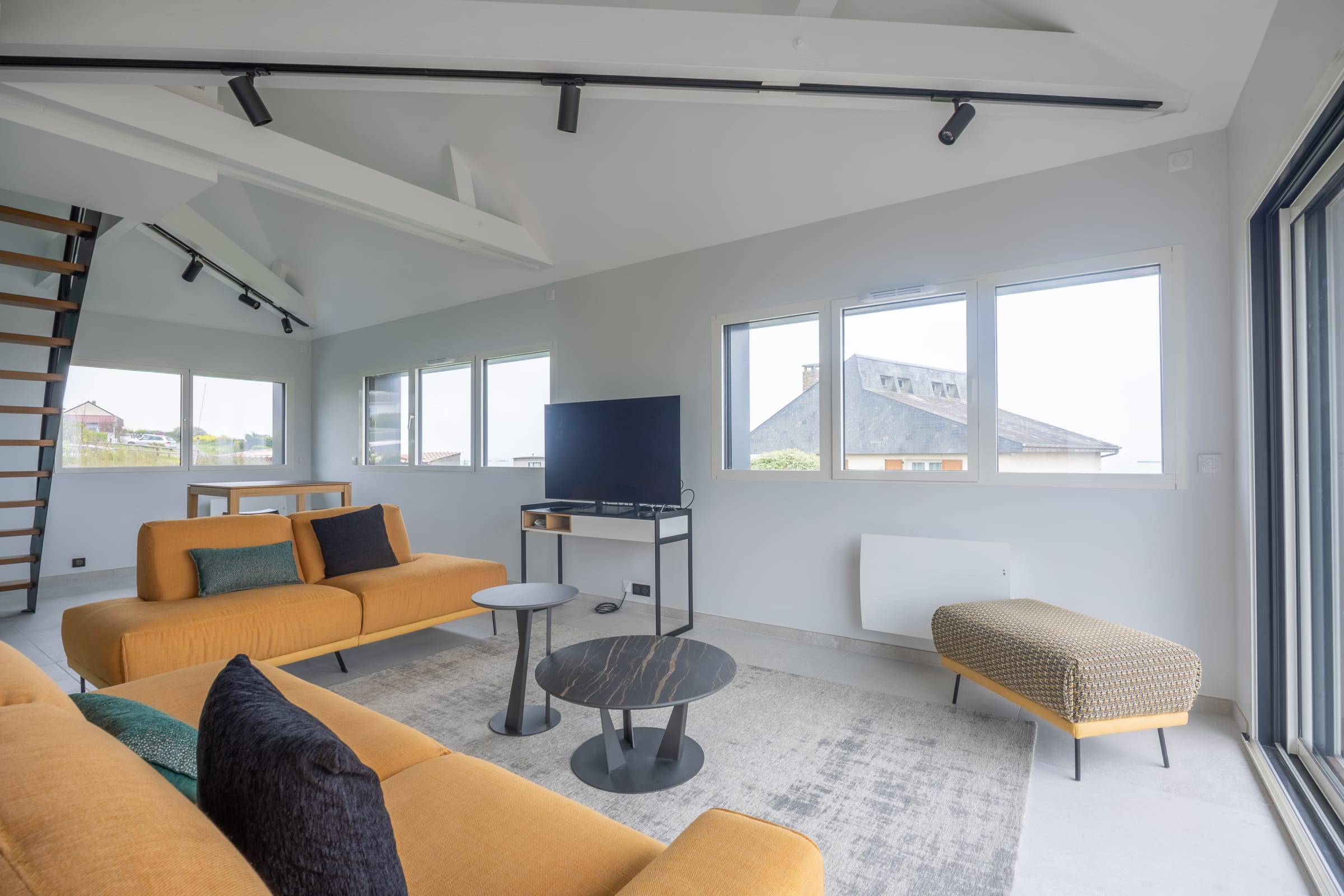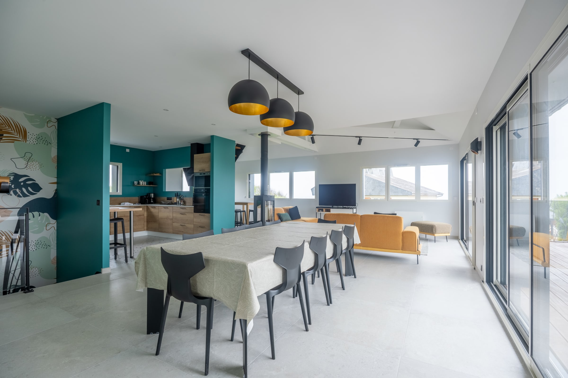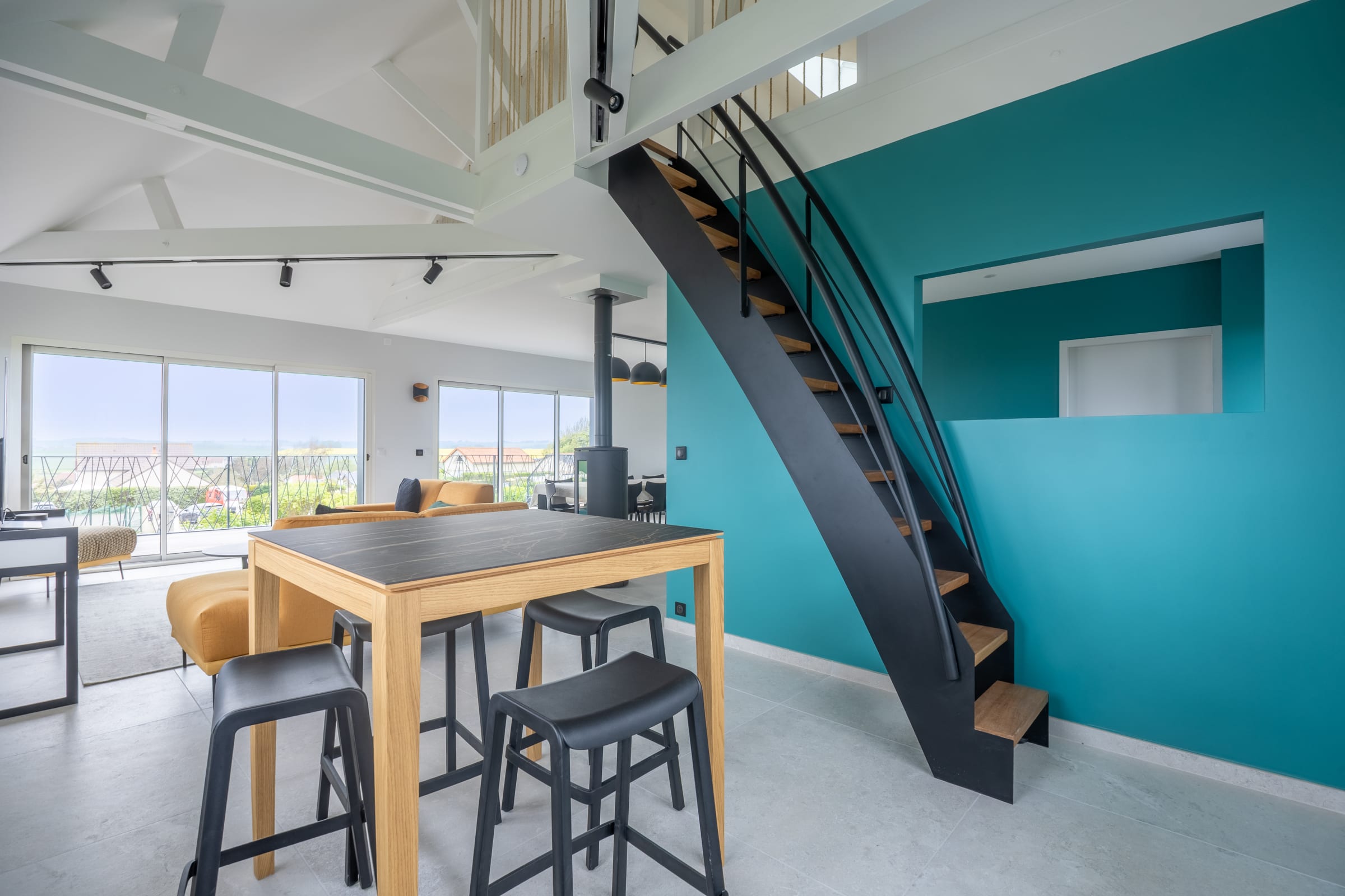 Le RDC est dédié aux espaces de vies avec une cuisine tout équipée ouverte sur la salle à manger et le salon pour plus de convivialité et pour profiter de la vue sur mer.